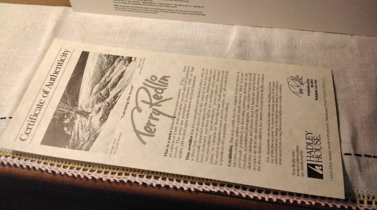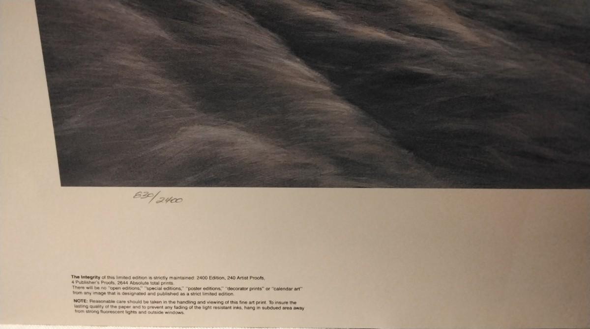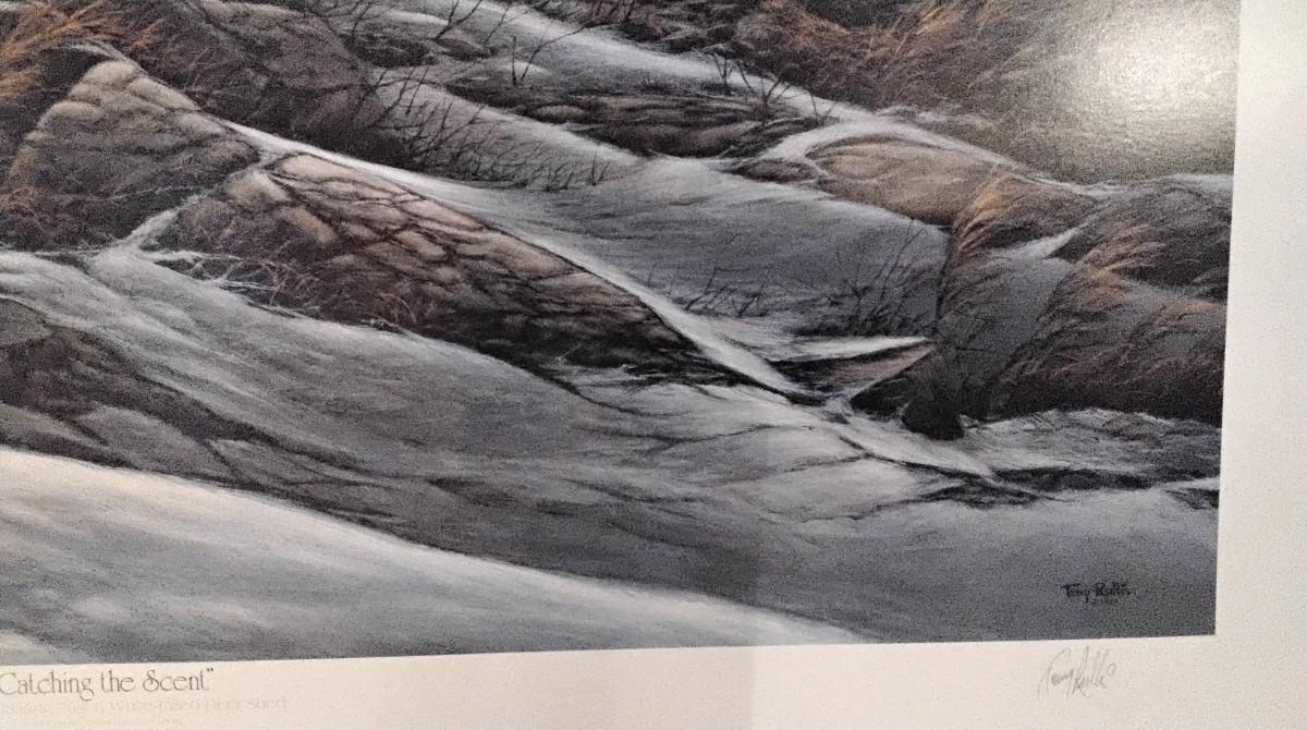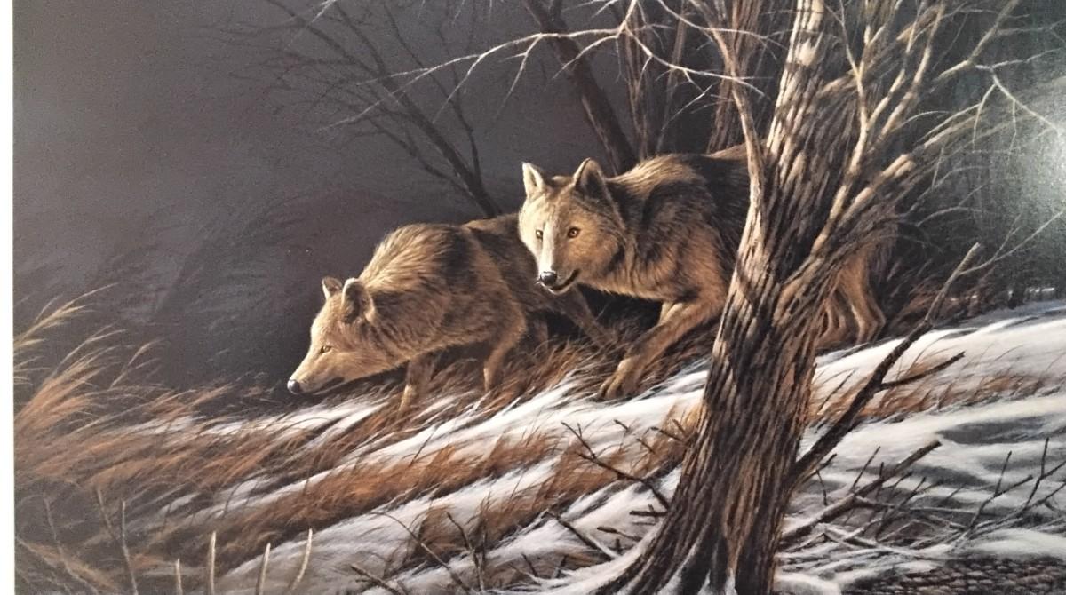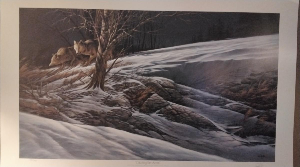 Edition size 2400Signed and numbered print is in perfect condition. The timber wolves have momentarily halted in their search for food. On this bitterly cold and moonlit night they wait, poised and alert. They have just caught the first scent of the recently shed deer antlers which lie hidden in the grass and snow a few feet ahead.