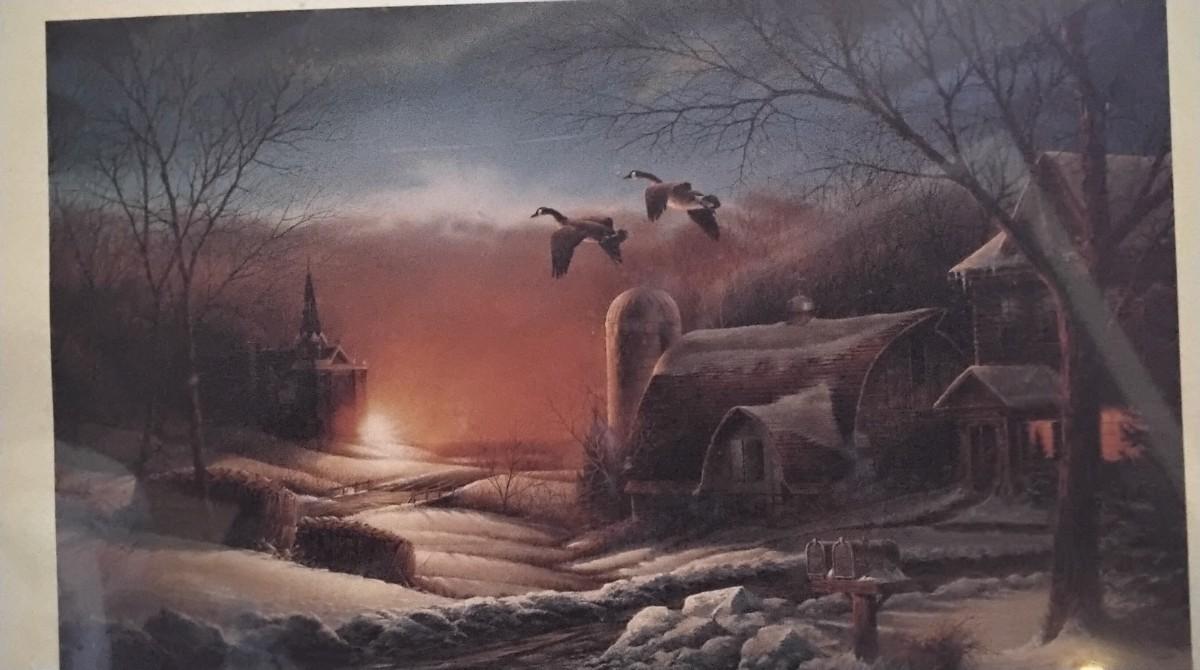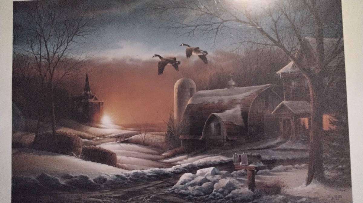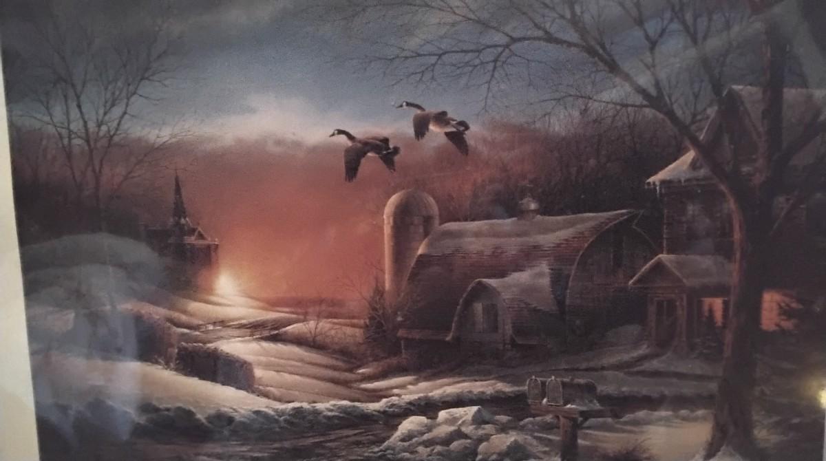This painting celebrates the same sharing impulse that is so often apparent in rural areas. We note the wreath and shovel by the front door, the distant church, and this time the corn in bountiful supply in two open cribs. A warm and friendly mood permeates the scene as a pair of Canada geese stop by to share in this holiday atmosphere.