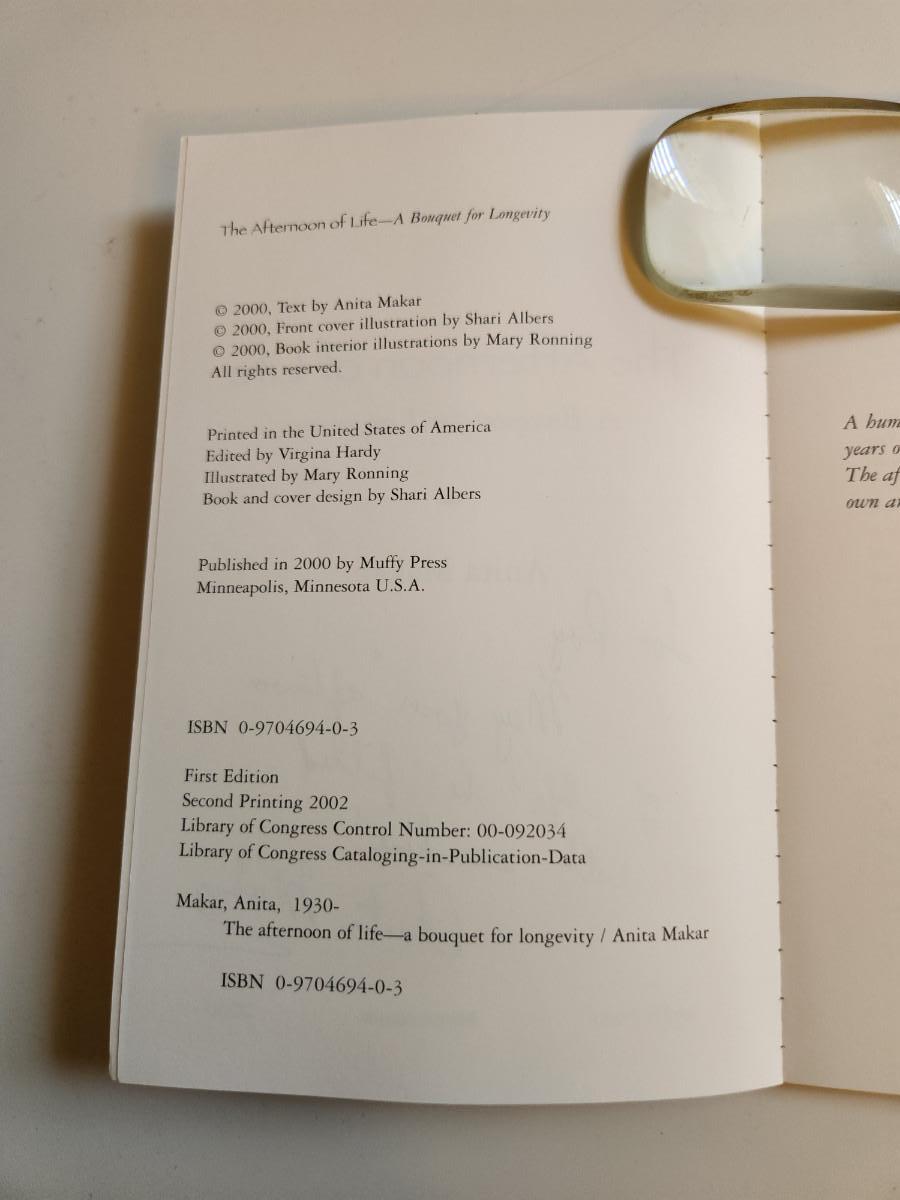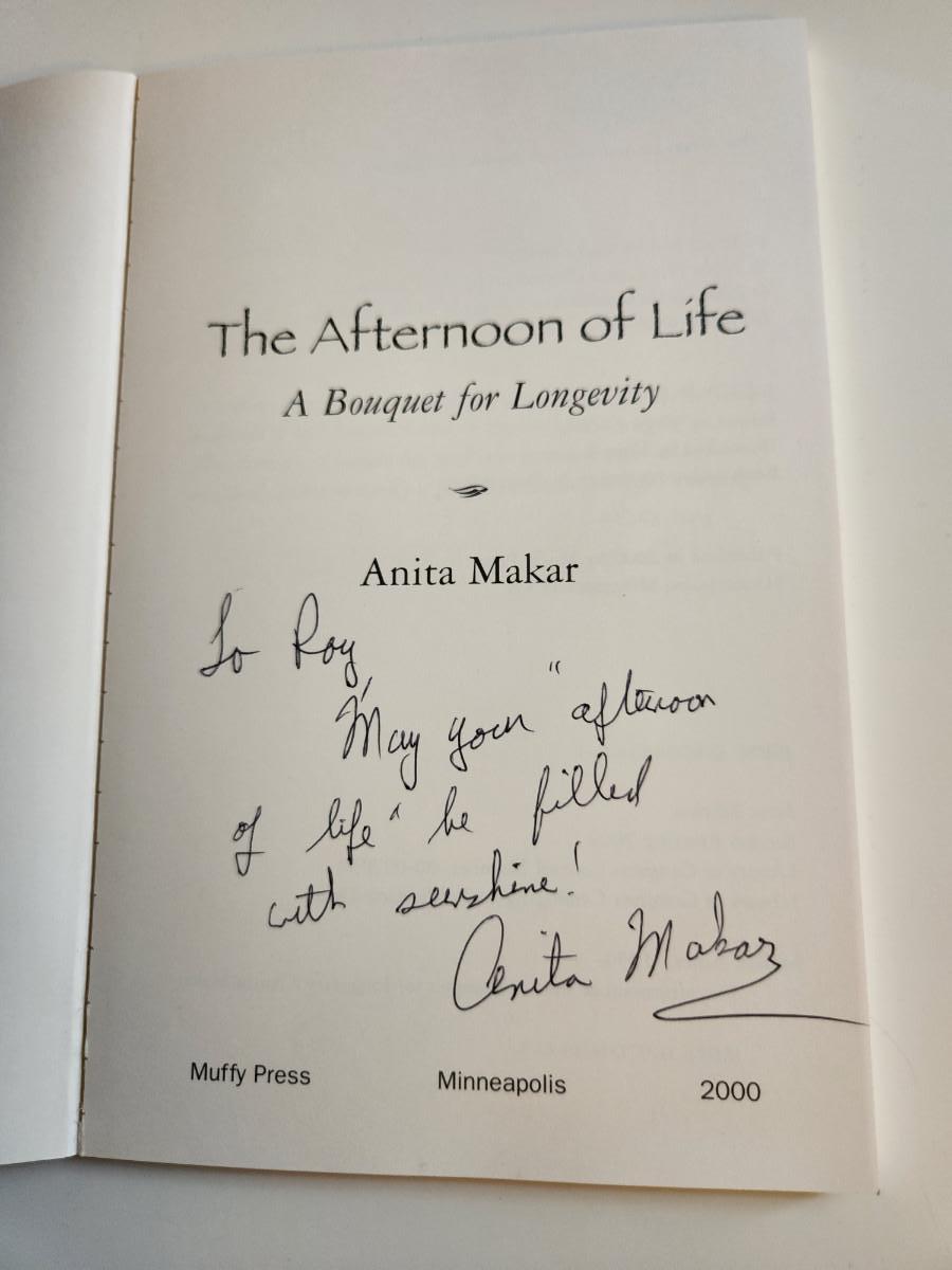 This auction lot is for a very crisp and clean copy of the book The Afternoon of Life by Anita Makar - Autographed by the author. This softcover book was published by Muffy Press, 2000. 80 Pages. This book celebrates the aging process and hopes to help most anyone enjoy each and every day.