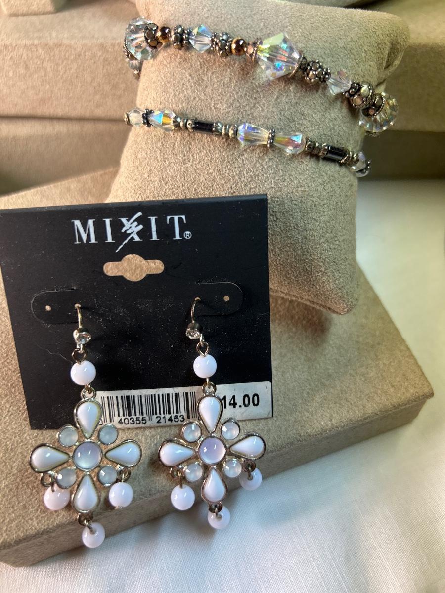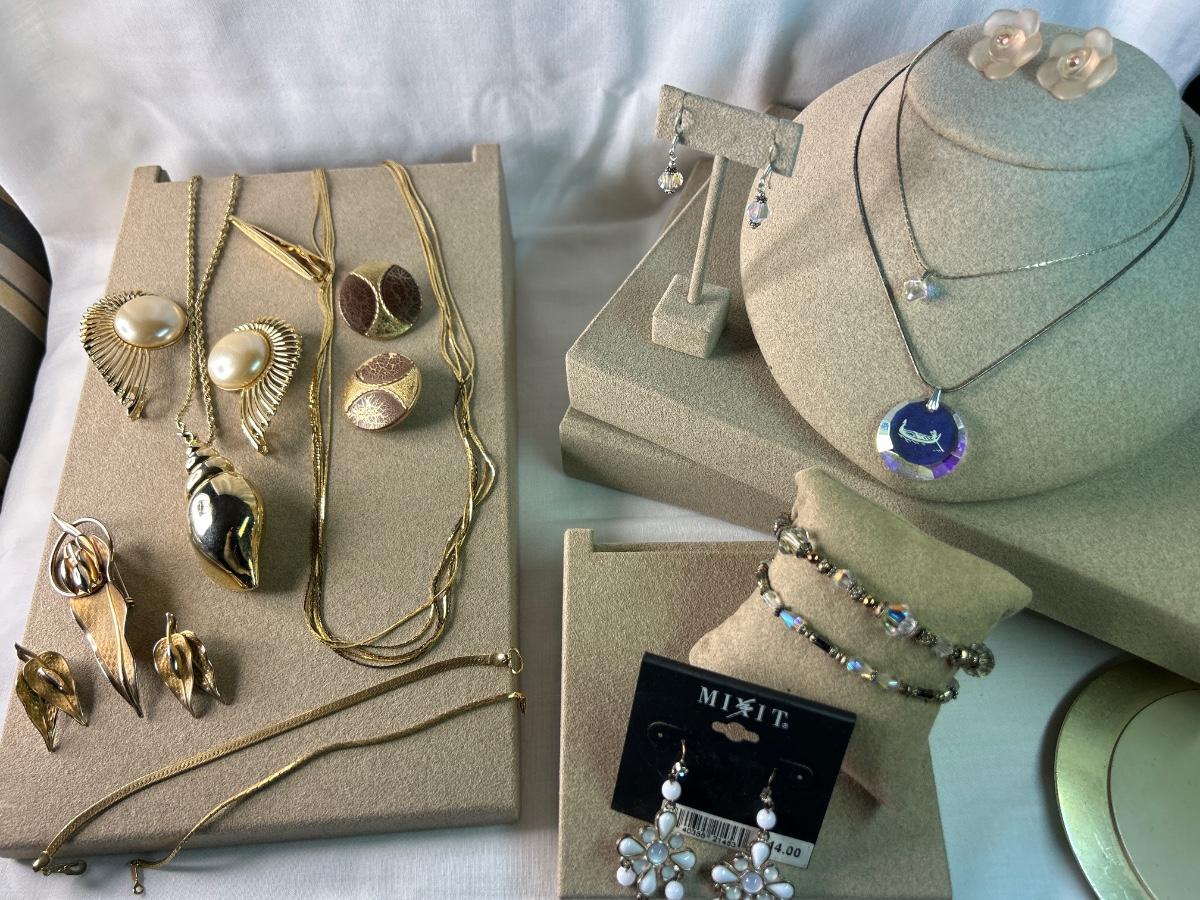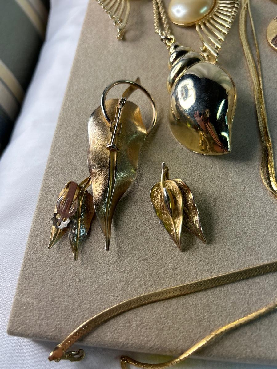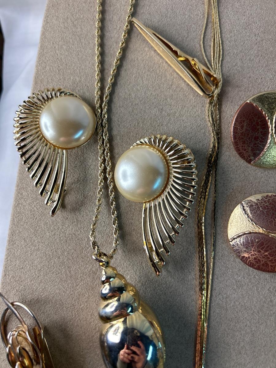 The gold pieces are very vintage but in good shape. The piece on top is a tie tack. 6 pair of earrings, 3 clip ons.