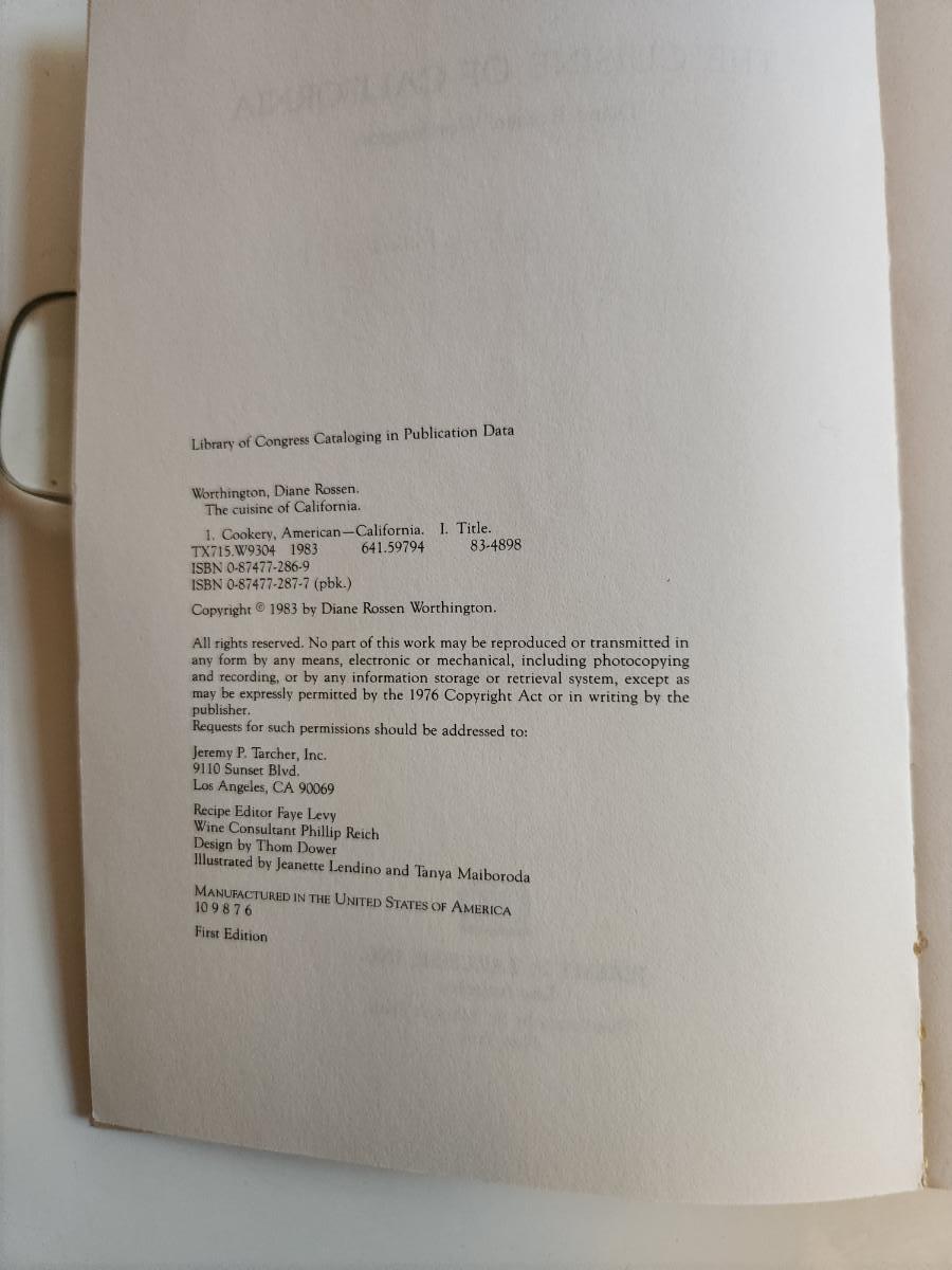 This auction lot is for a copy of the book The Cuisine of California by Diane Rossen Worthington - Autographed by the author. This book is a great look at the new and trendy cooking of the West Coast in 1983, this was near the beginning of light but flavorful and dare I say it - "healthy" cooking. The soft bound book was published by Tarcher, 1983, it is a 1st edition copy. 312 Pages. The book has shelf wear but is in good condition.