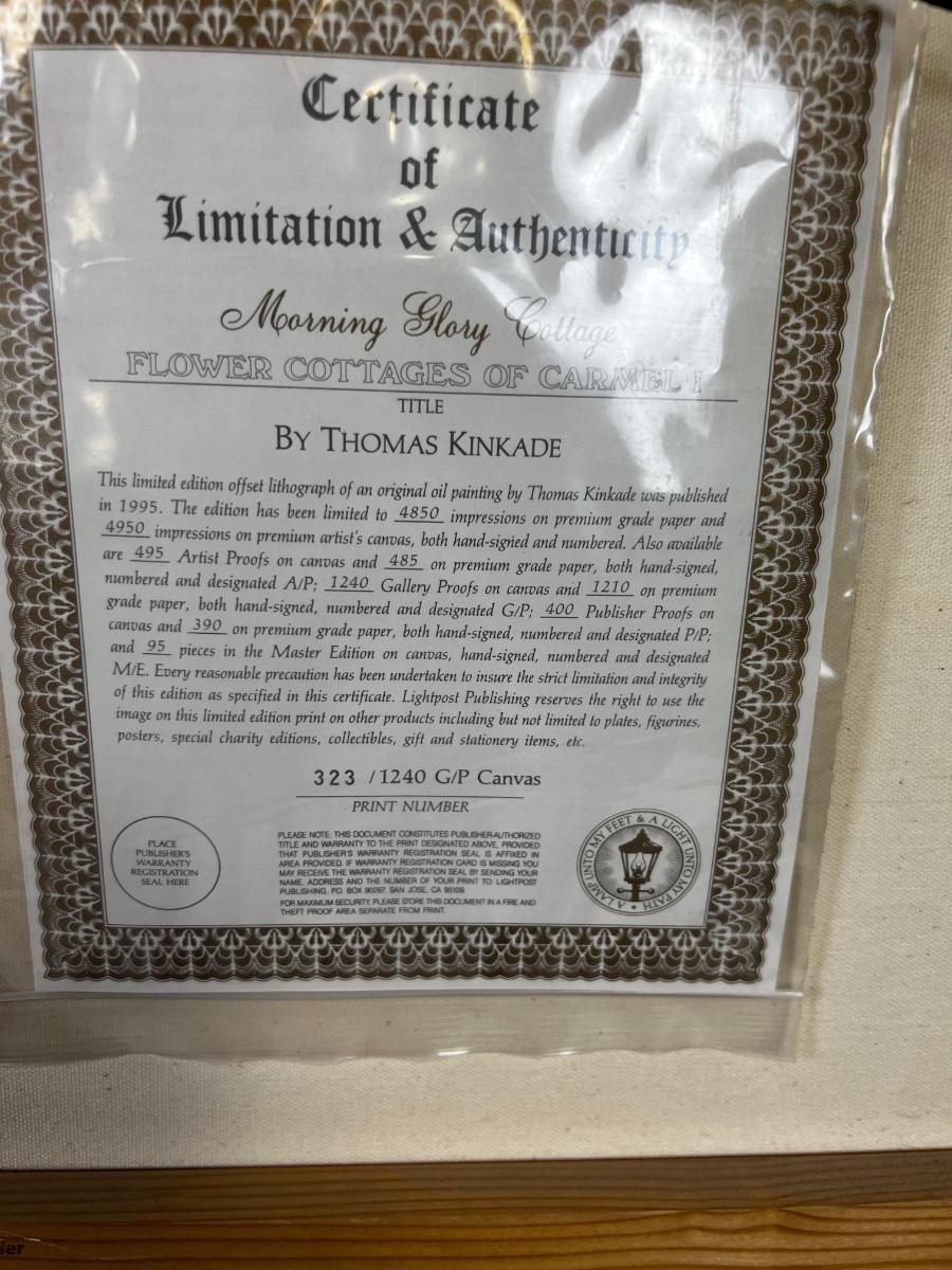 Thomas Kinkade  Morning Glory Cottage  Framed with Letter of Limitation and Authenticity 1 of 4950 Artist Signed