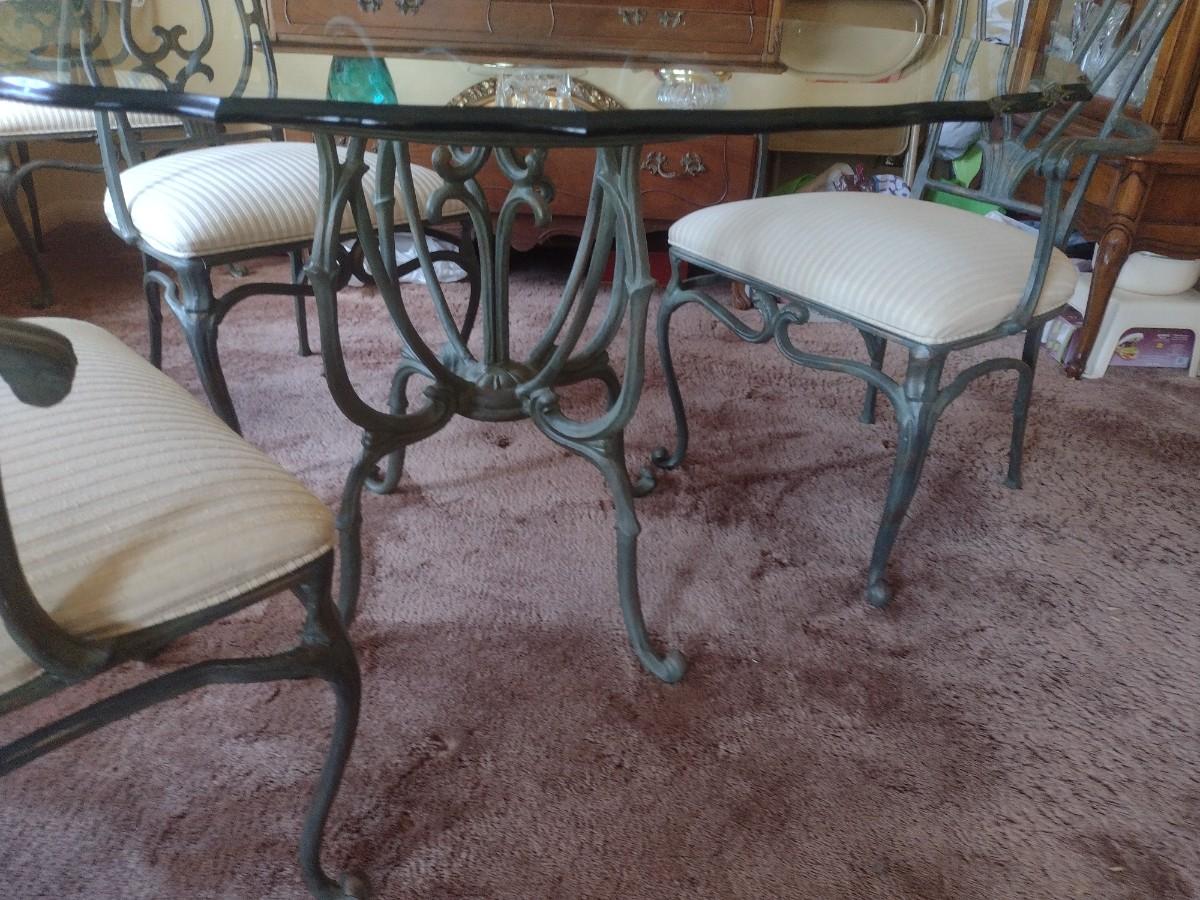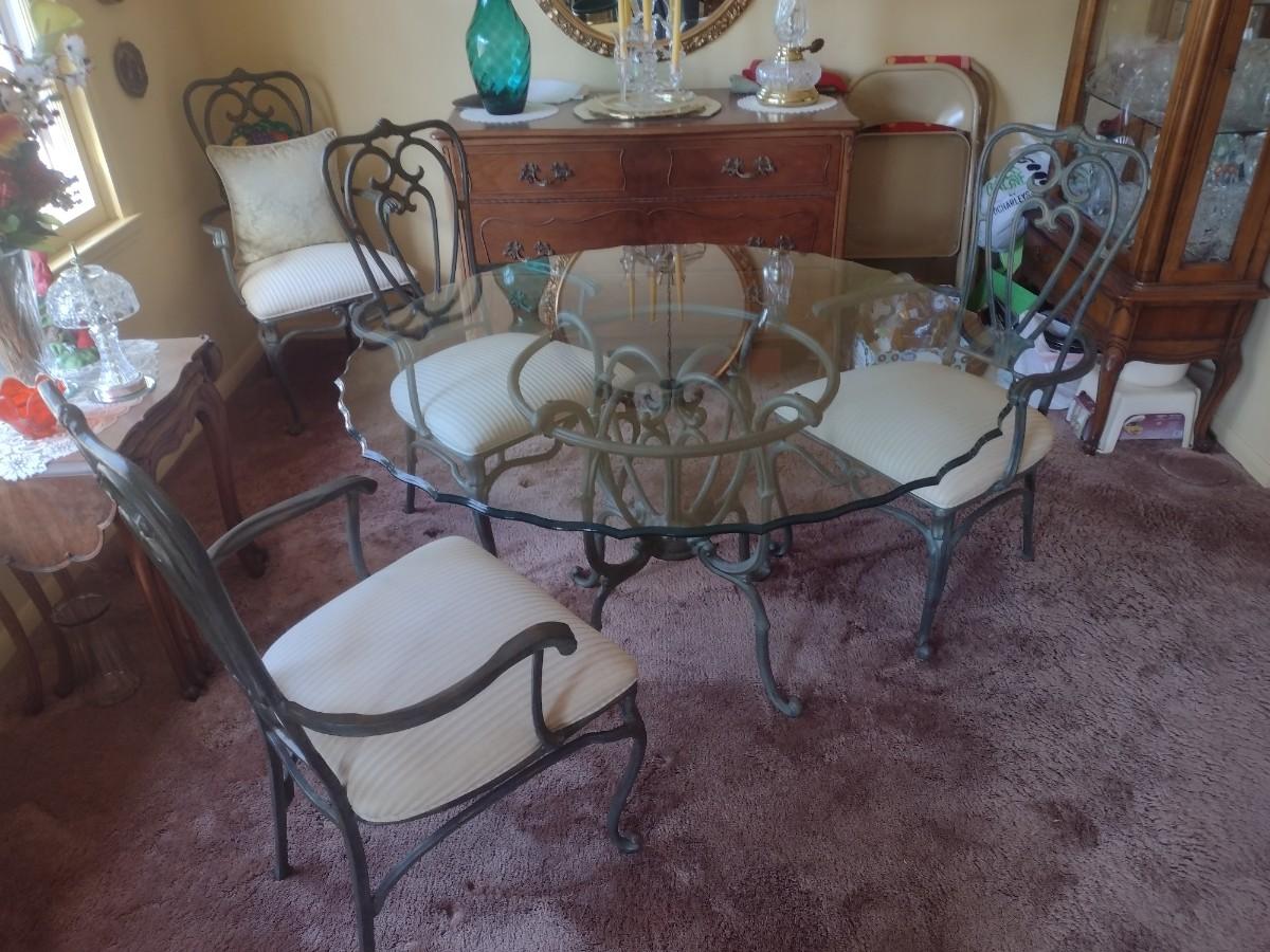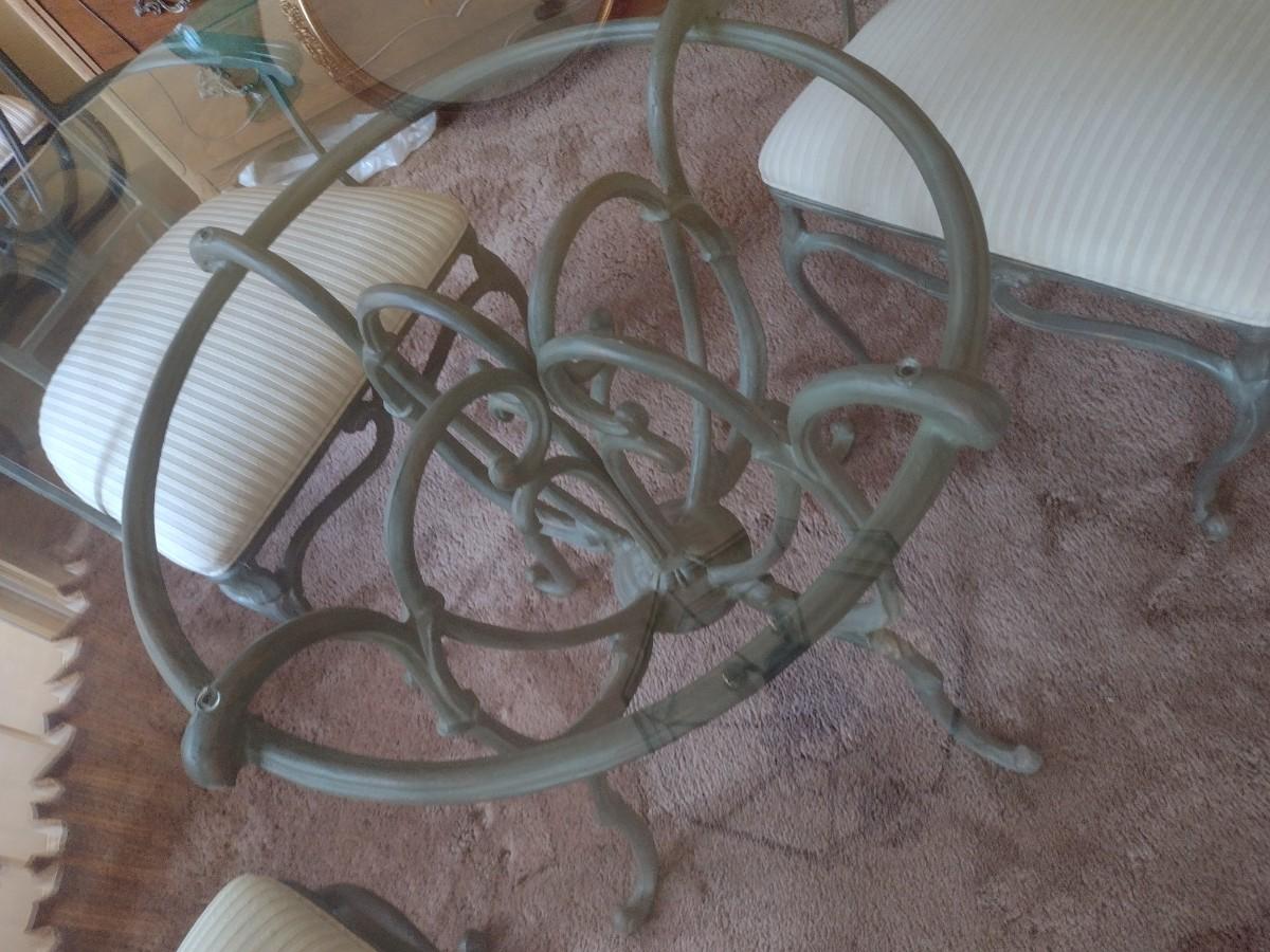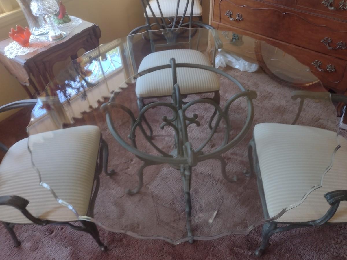 Thomasville Wrought Metal Five Piece Scalloped Edge Glass Top Table and Chair Set
