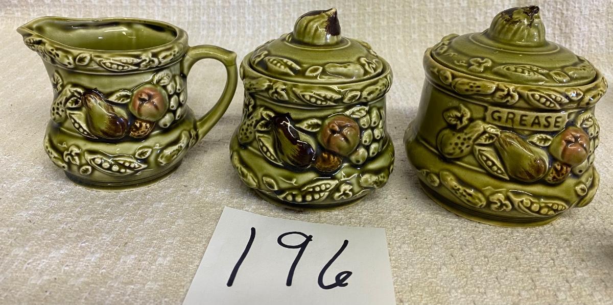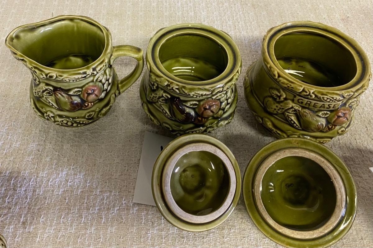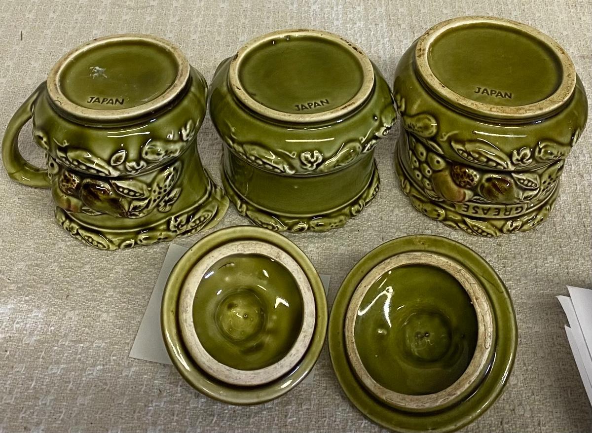 Vintage Tilso Japan Avocado Green Ceramic Creamer, Sugar and Grease w/Lids Fruit & Vegetable Gargen 4” Tall 4” Round