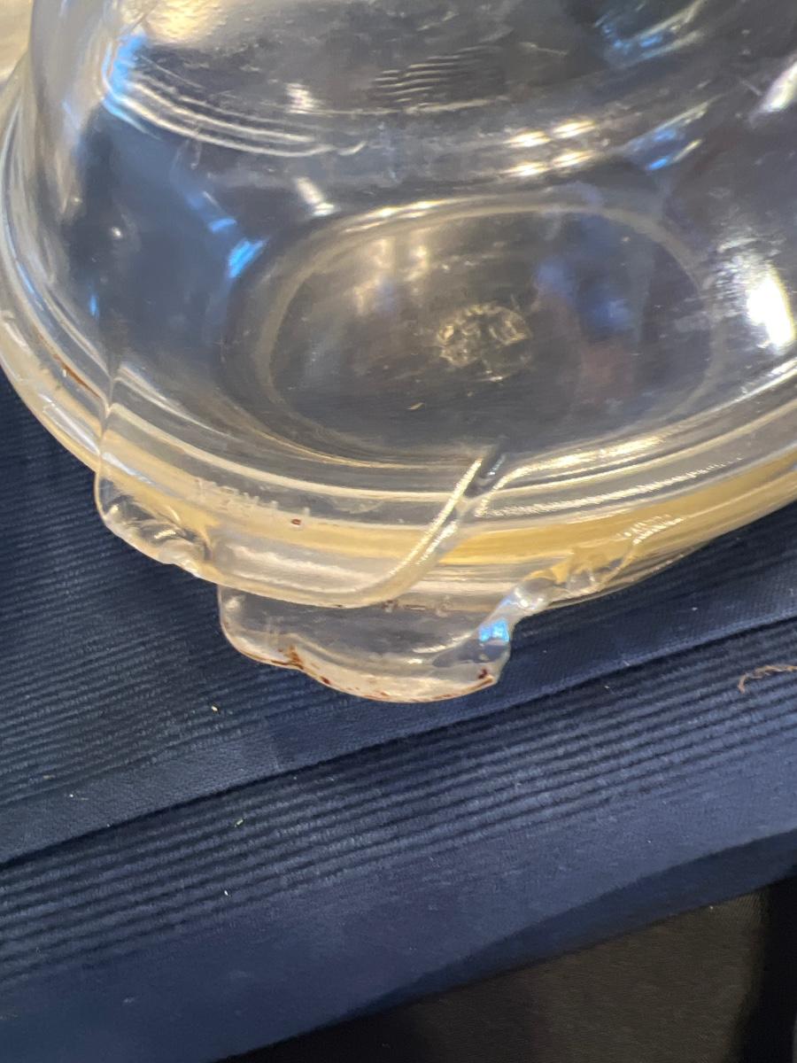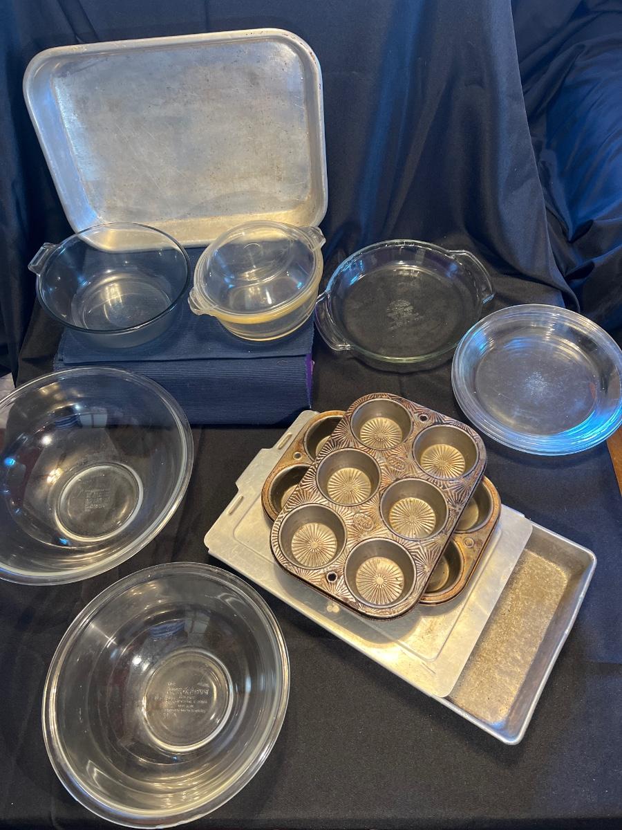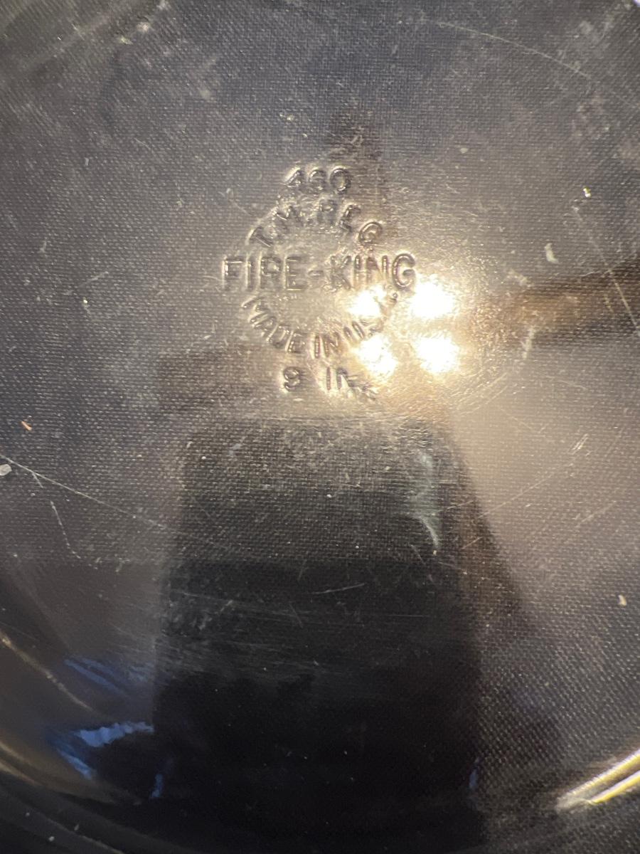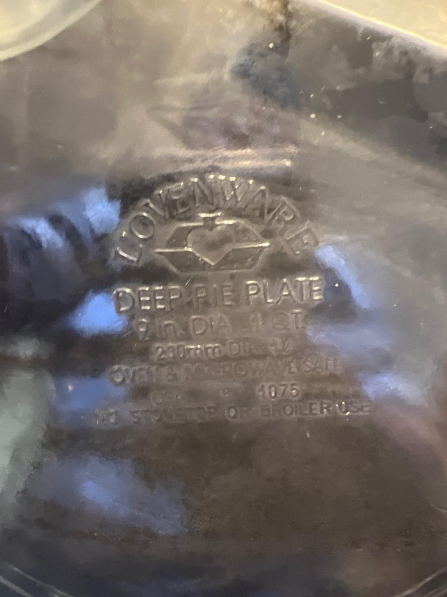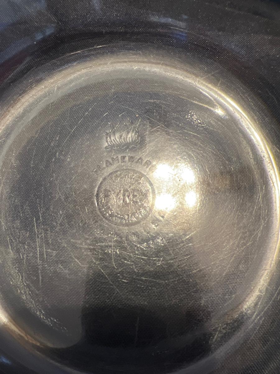 Vintage Pyrex. 4 pie plates: 1 Fire King, 1 L’ovenware deep dish, 2 Pyrex. The coveted Pyrex dish has some broken pieces off handle edges. See pictures.