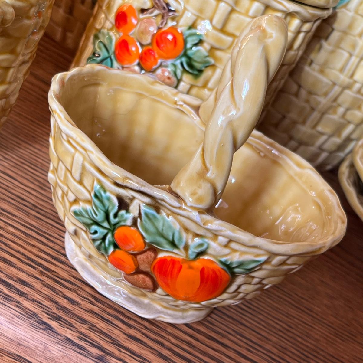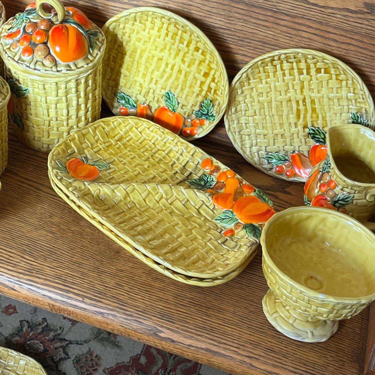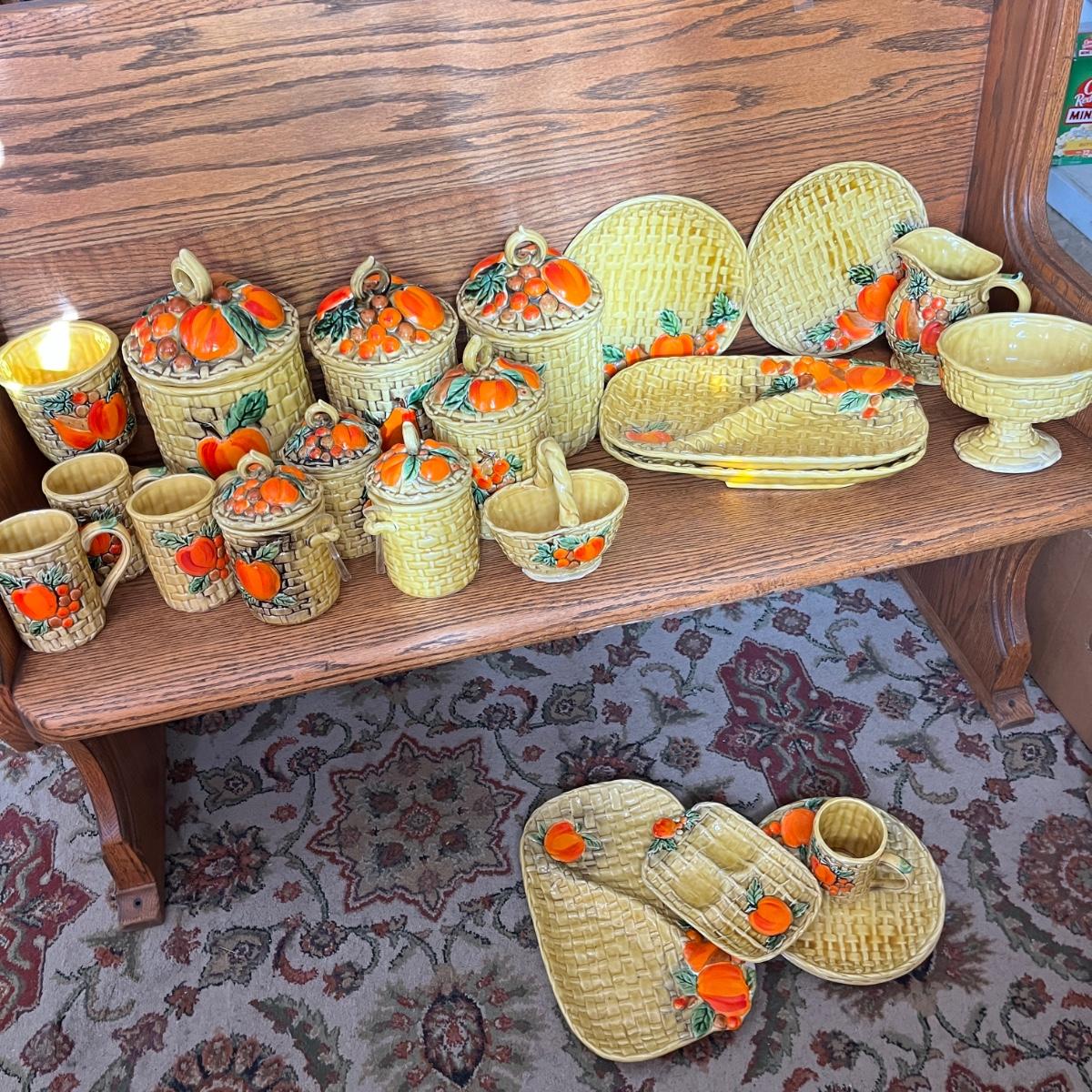 A large grouping of Fruit Basket weave. Items on floor have issues. Items on shelf are good. Need a good cleaning.