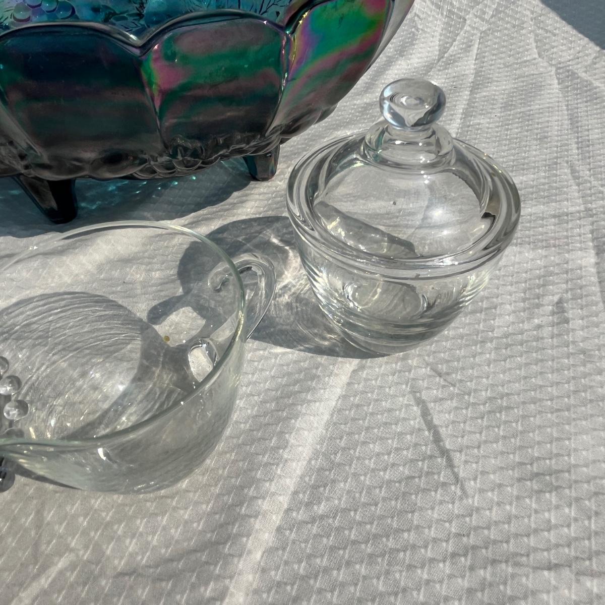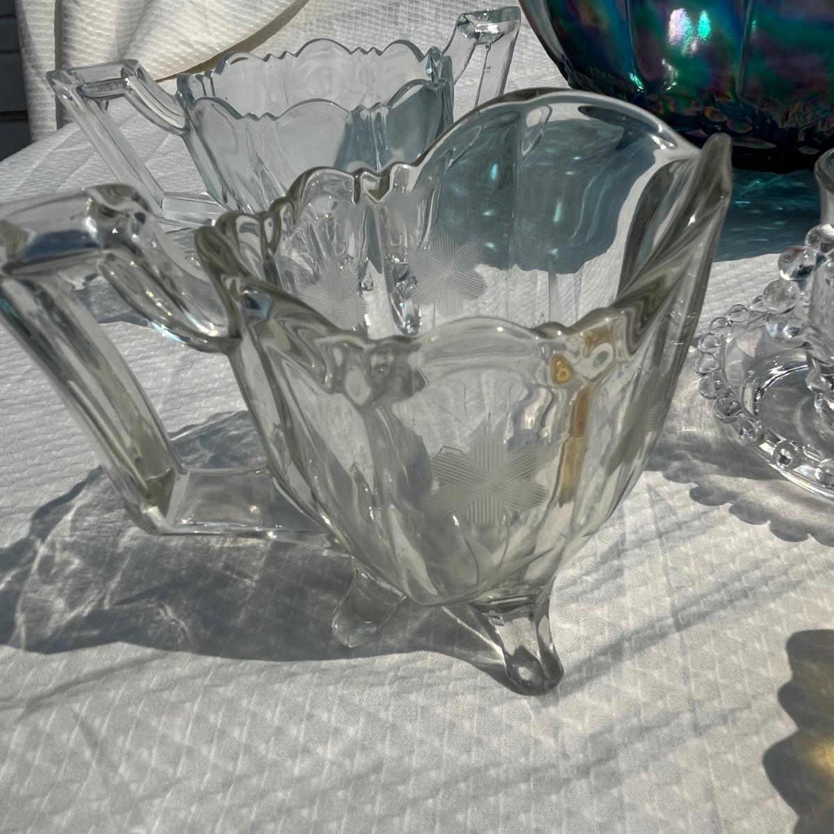 Indiana Glass carnival pieces and 3 depression era cream & sugars. All in great shape!