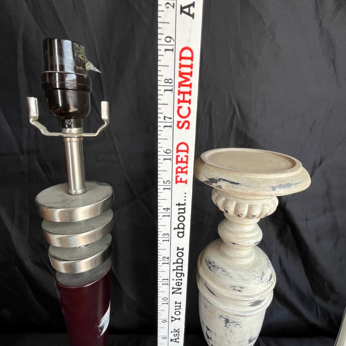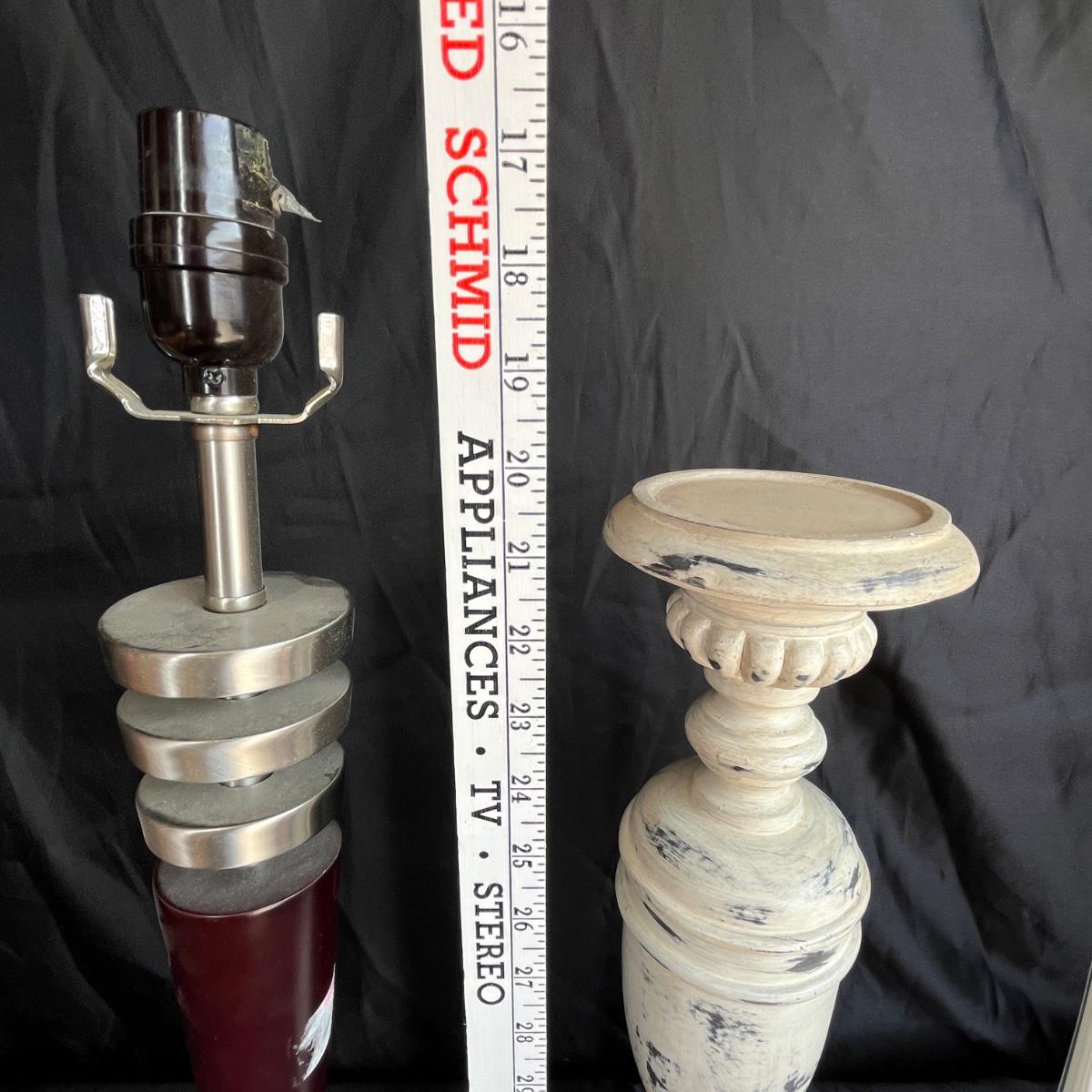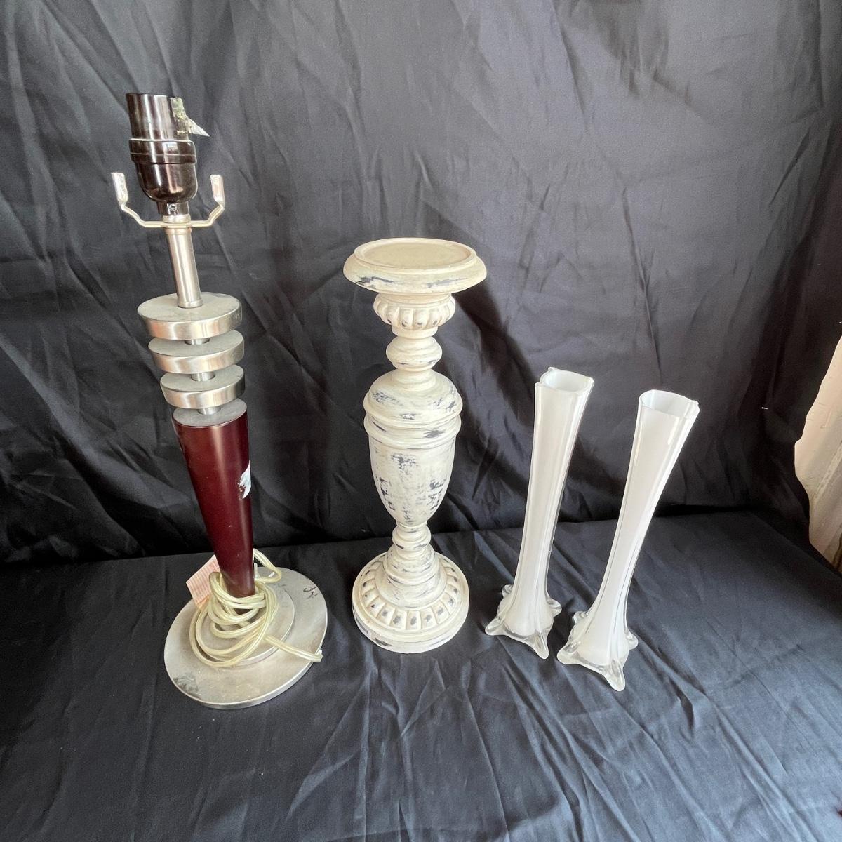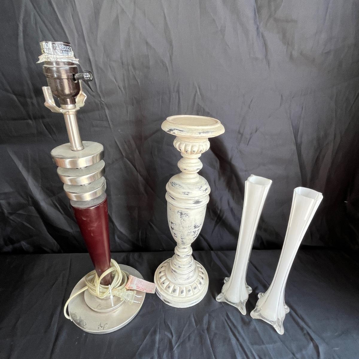 The vases are cased glass, no damage. The candle stand can double as a hat stand. Lamp is new.
