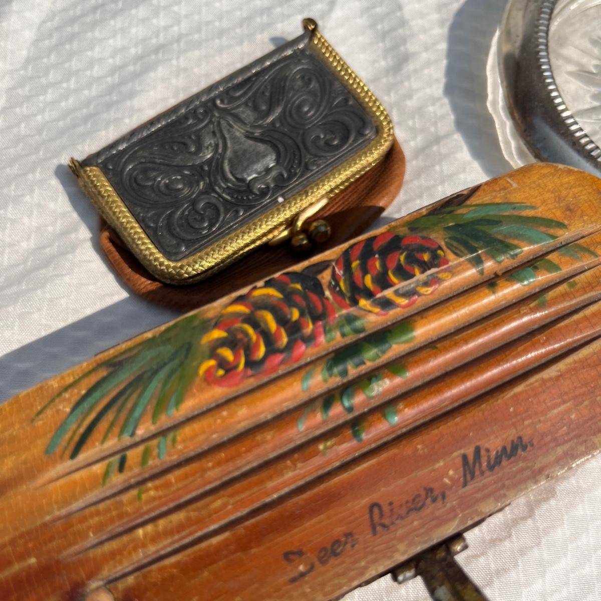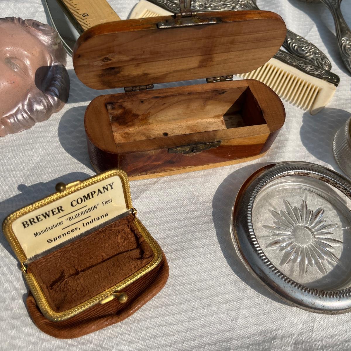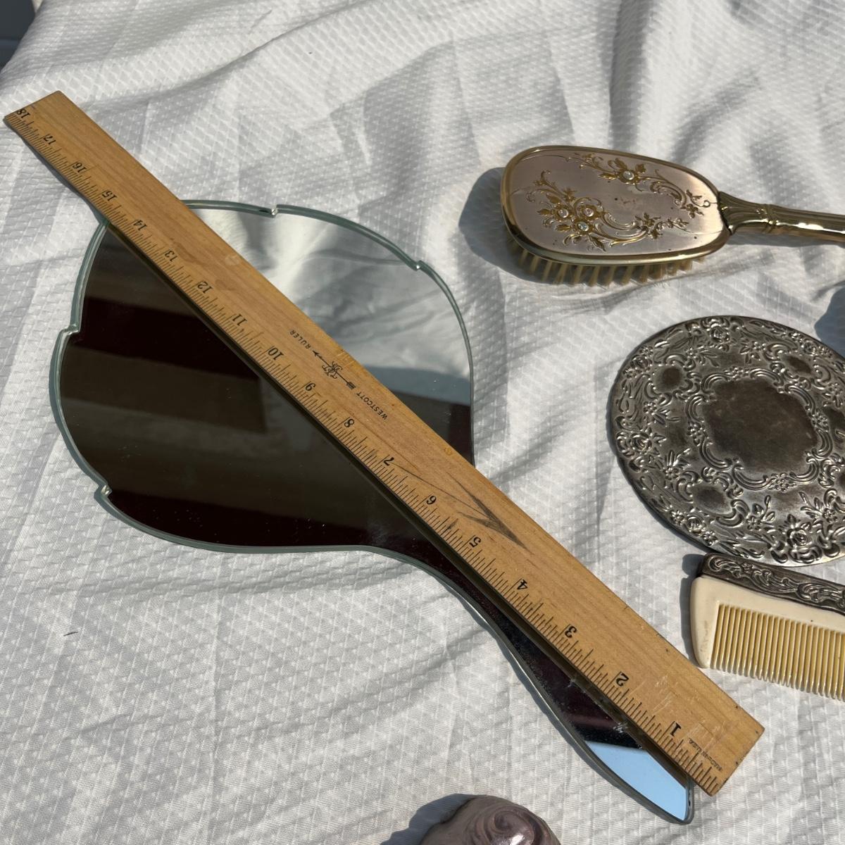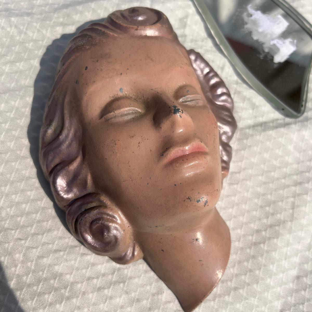 The lady head is cast metal. There are silver plate pieces too. Love the lucite backed hand mirror!
