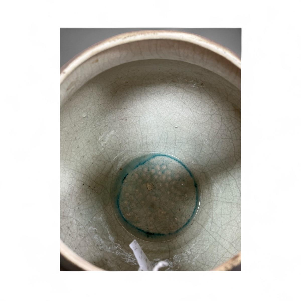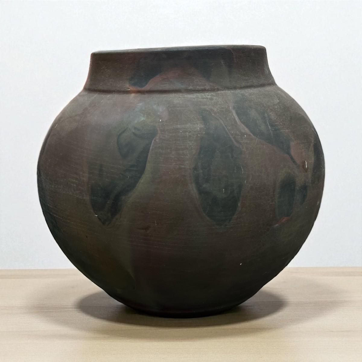 Tony Evans (1942-2009) Raku Pottery Vase. His Raku pottery features a distinctive volcanic surface and earthy tones and glossy interior drip glaze.
