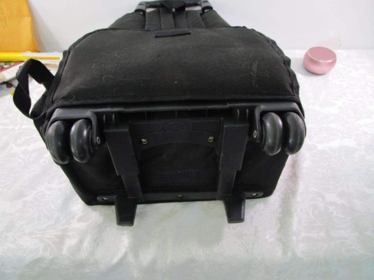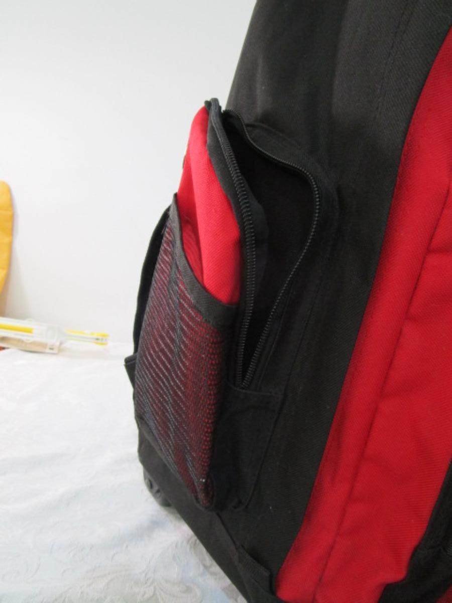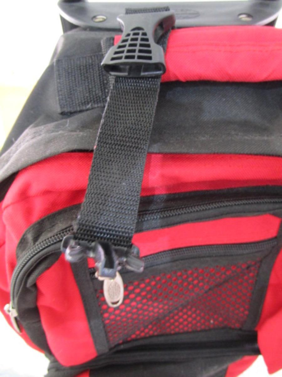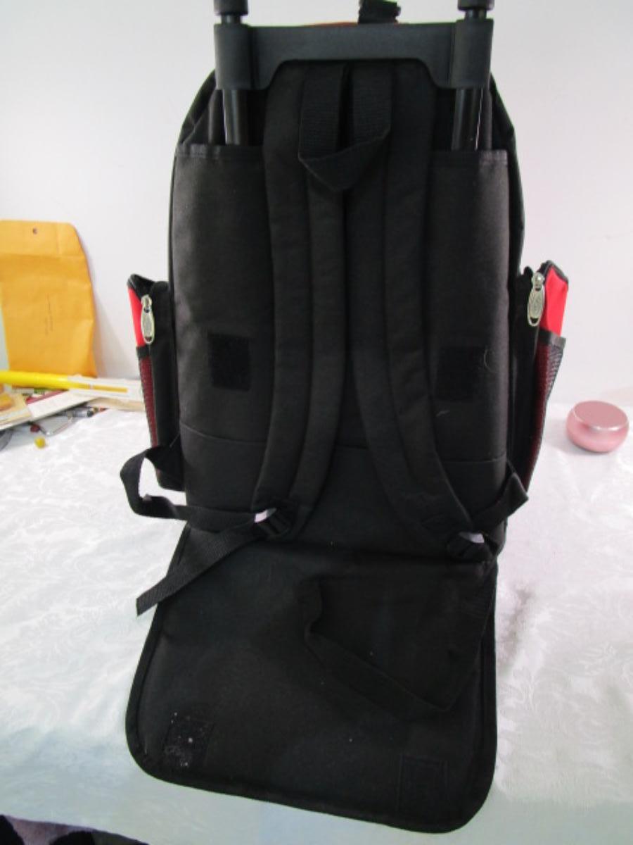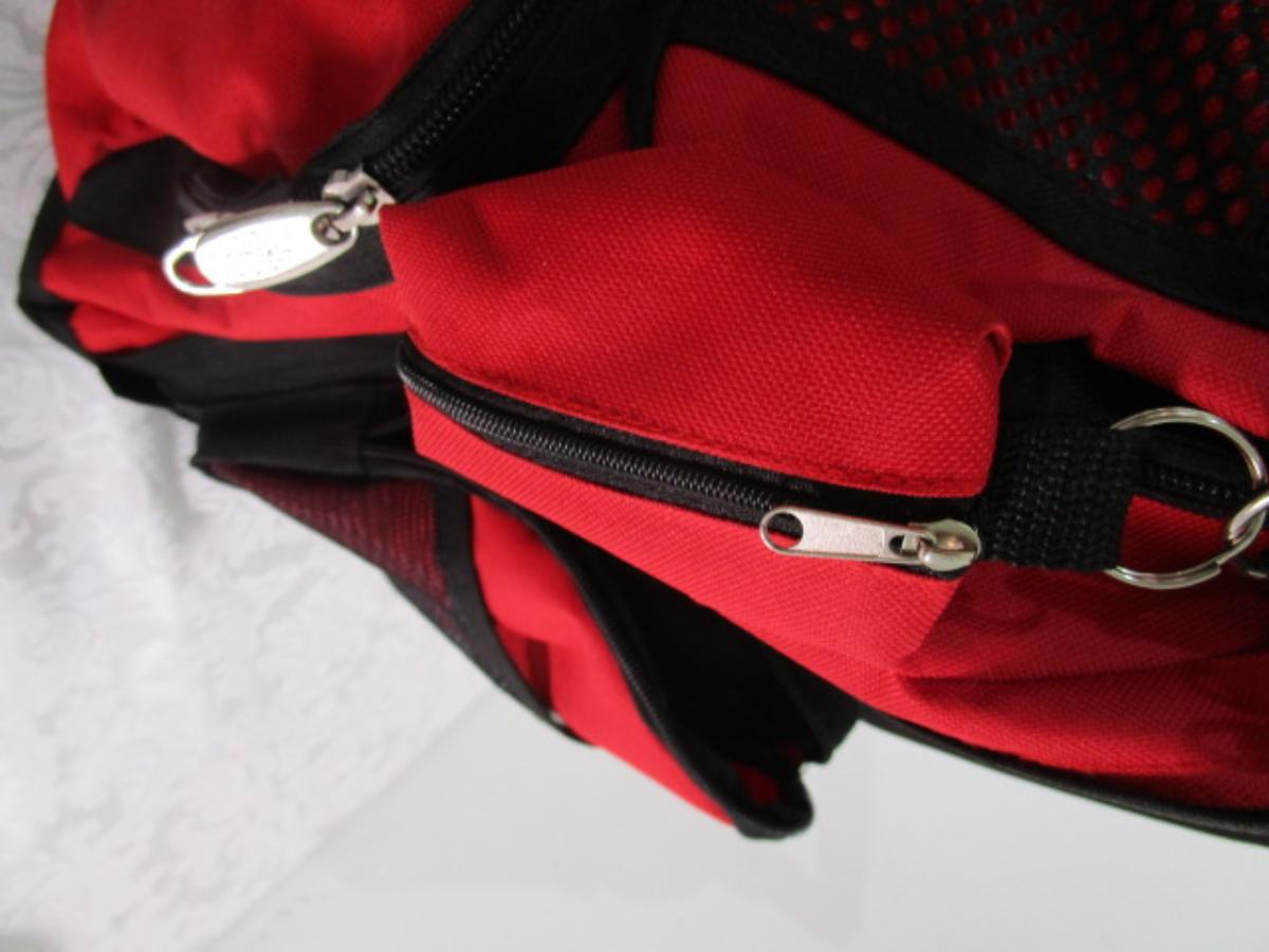 Has attached coin purse & 5 zippered compartments, padded straps,