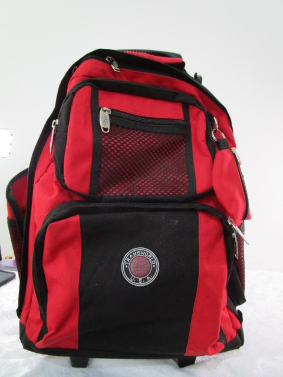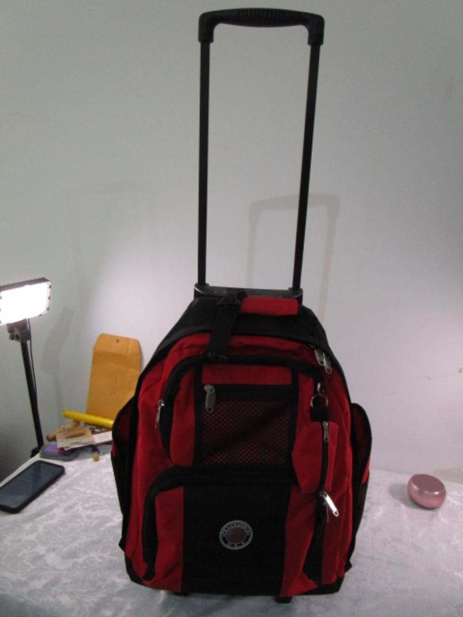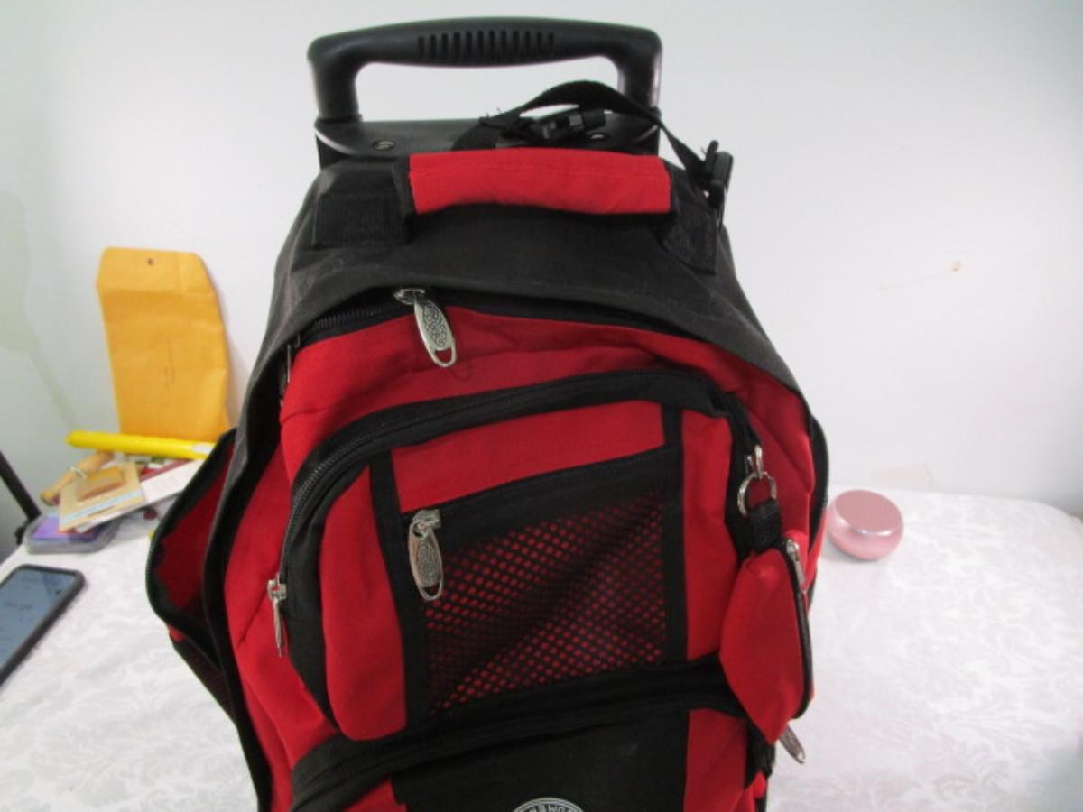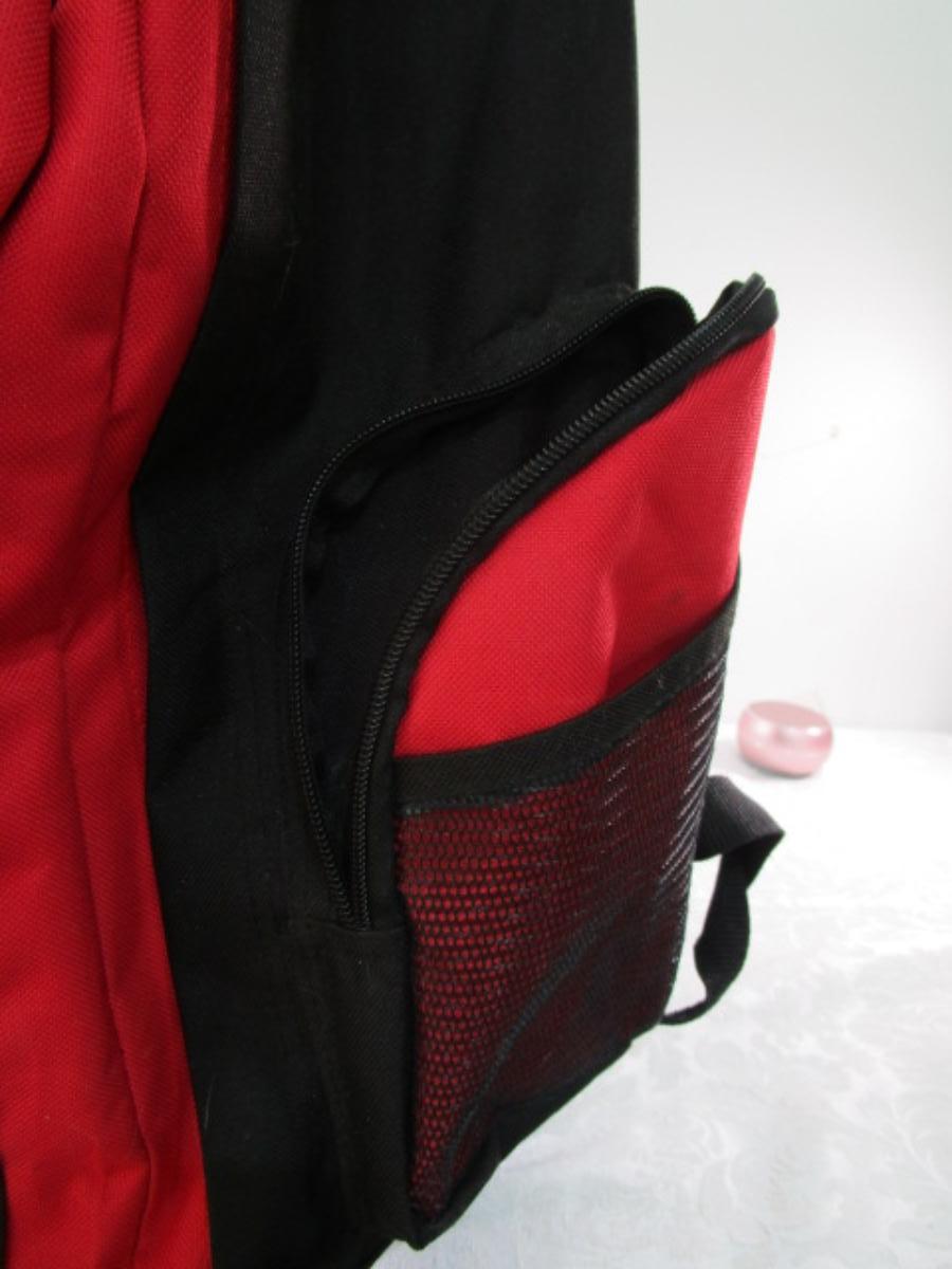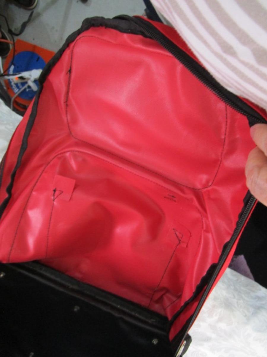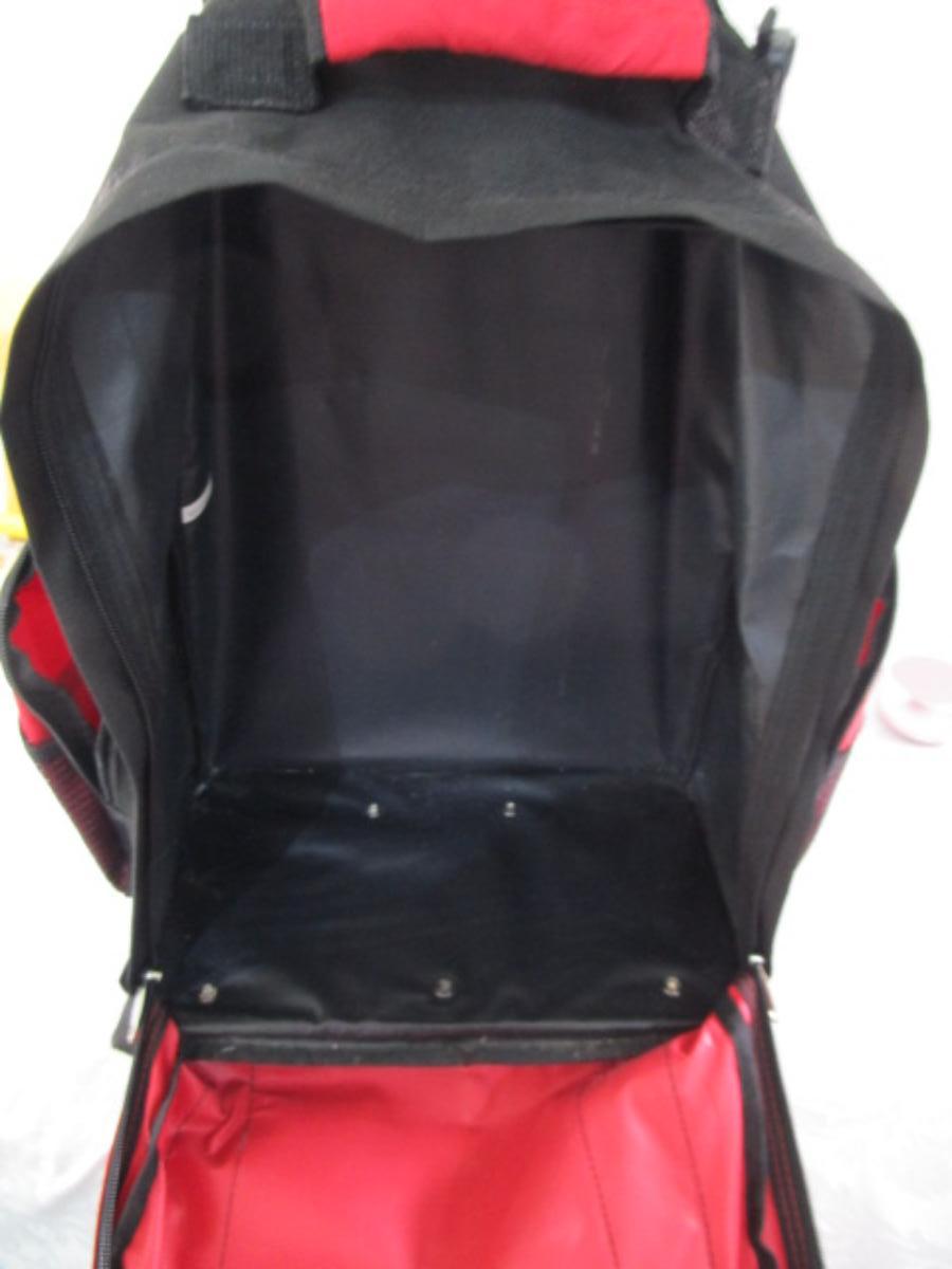 Has attached coin purse & 5 zippered compartments, padded straps,