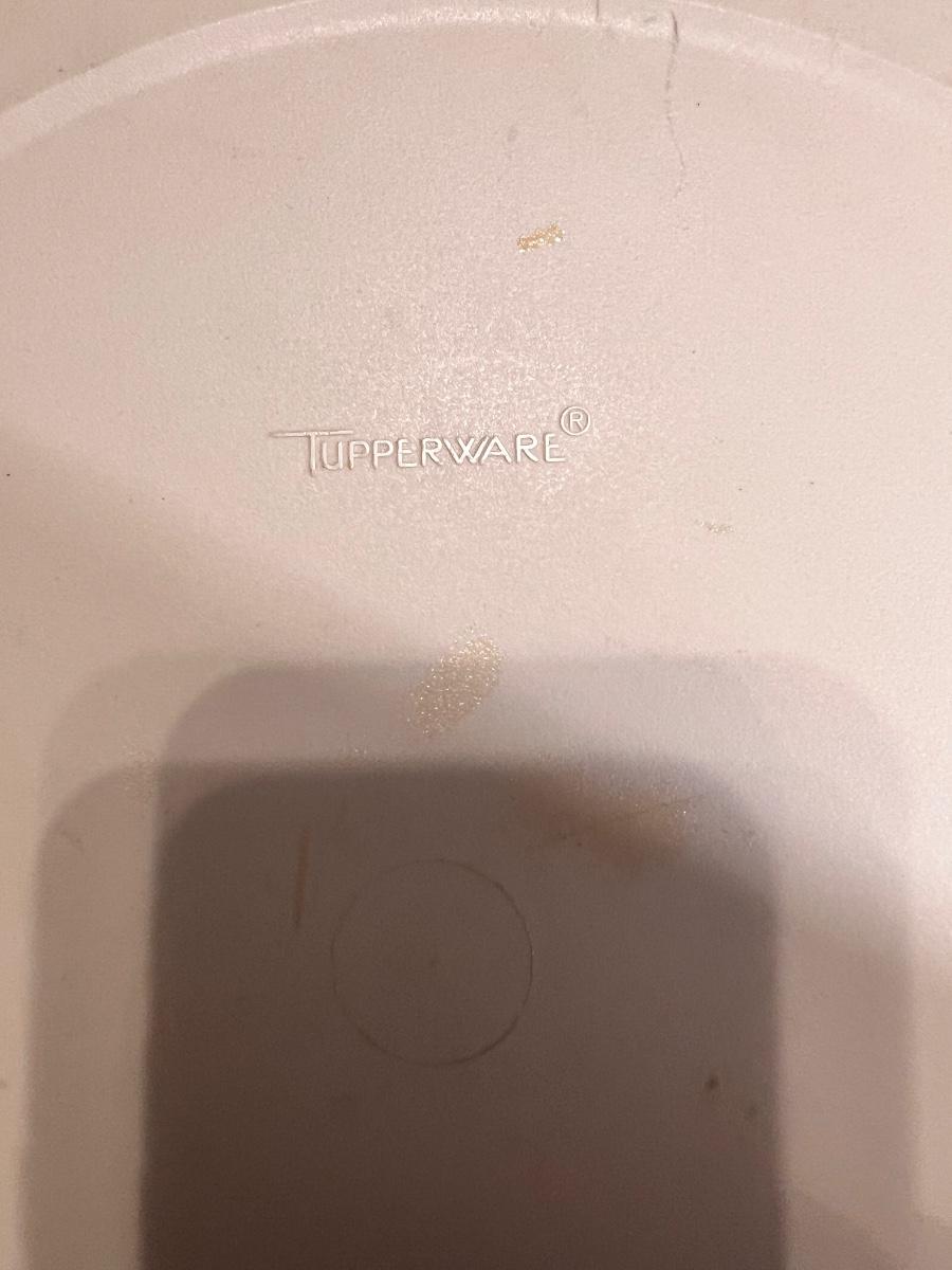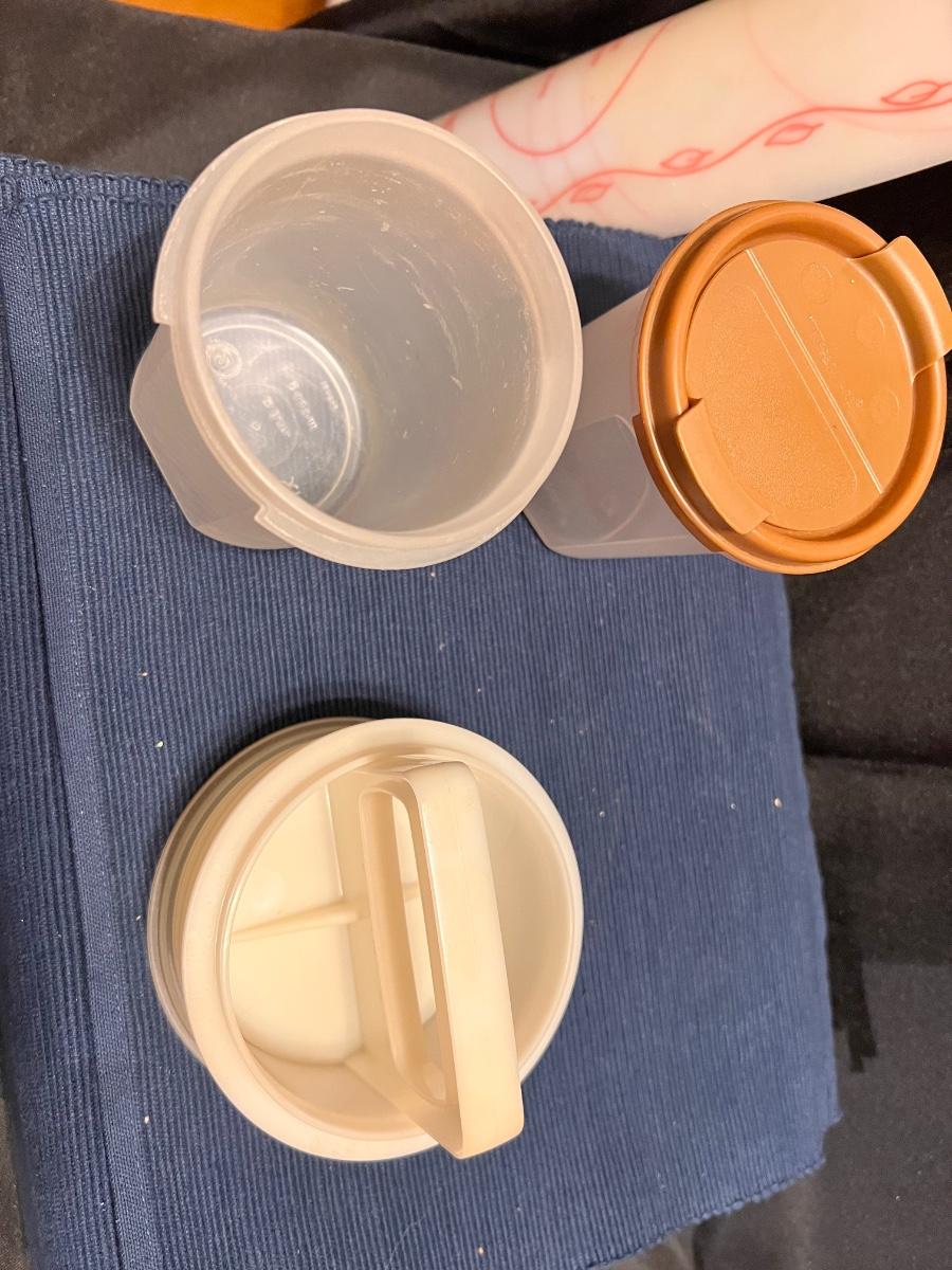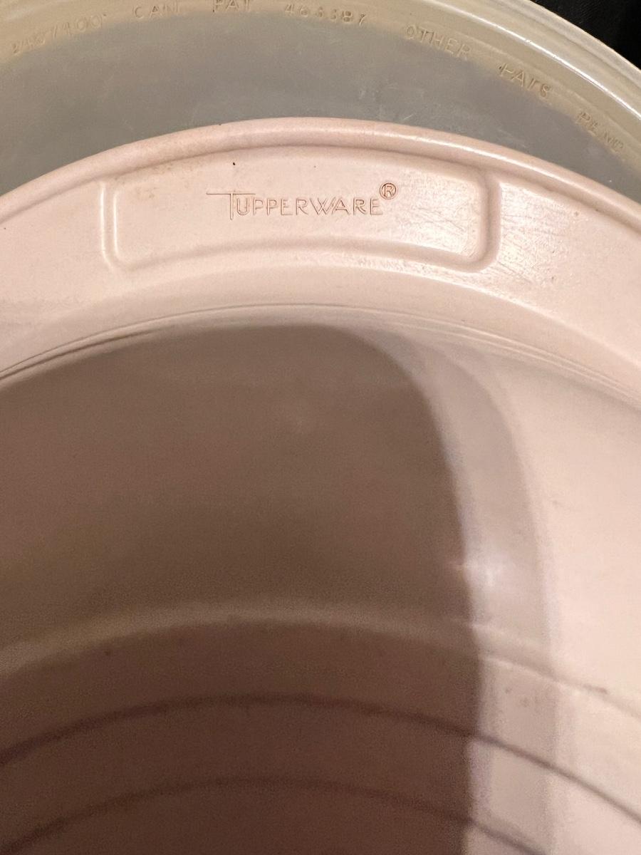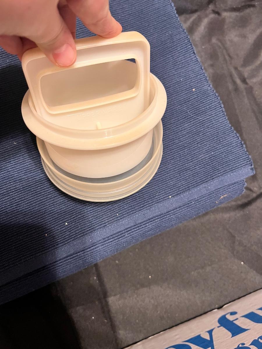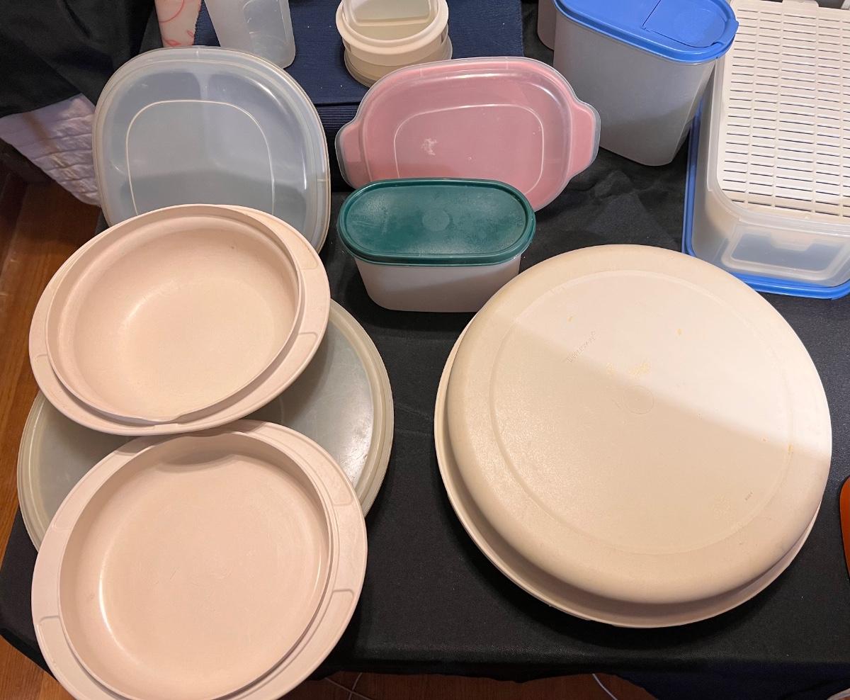 Various Tupperware/Rubbermaid containers. Also a dough rolling mat and a burger shaper.