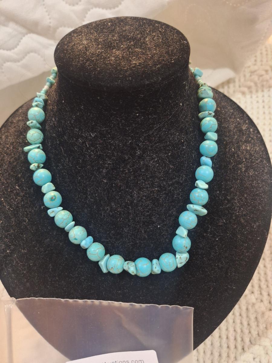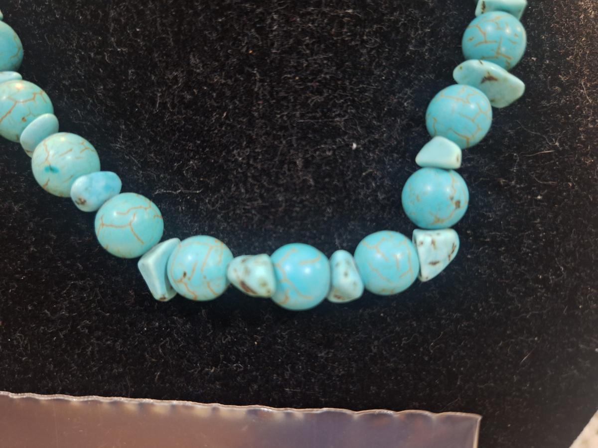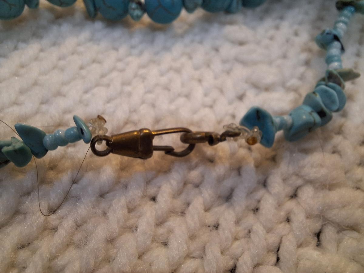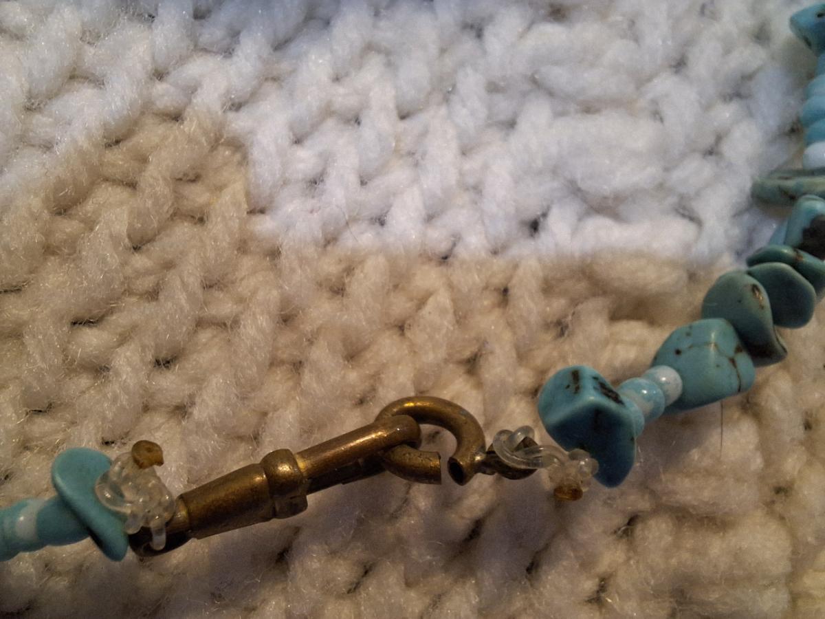 turquoise colored rock chips.- clasp is brass and is not completely closed. Not the kind of clasp used on a real turquoise necklace but a very pretty costume piece