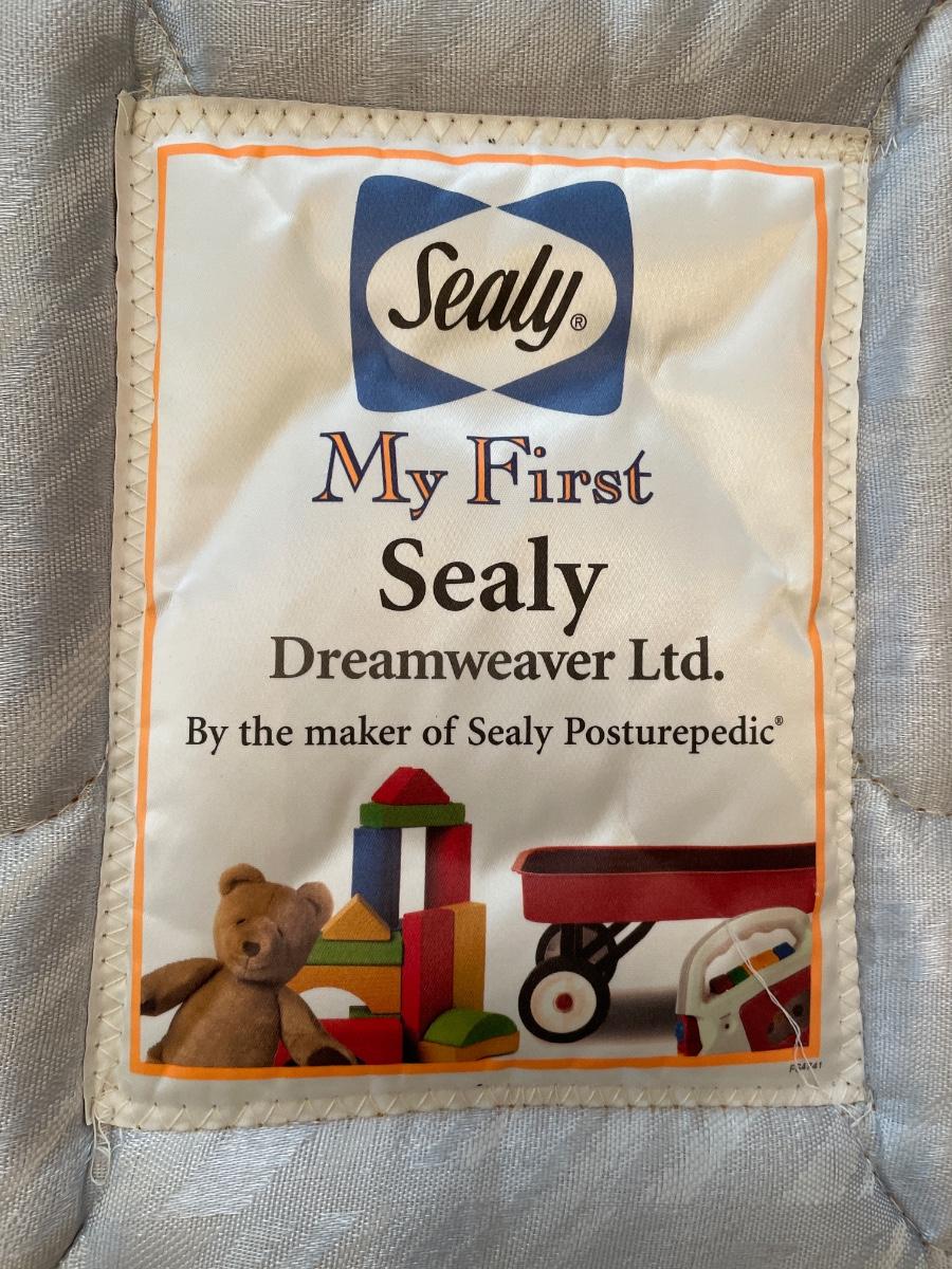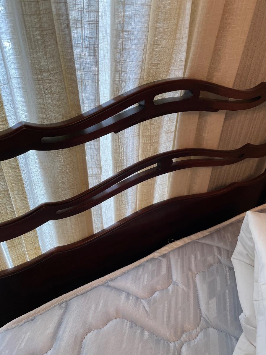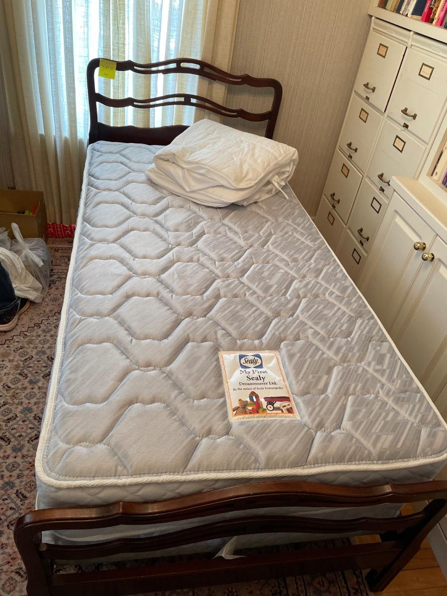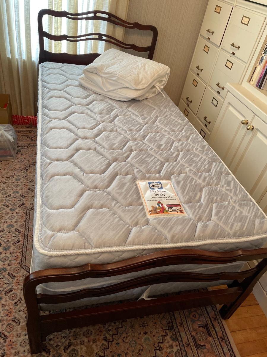Adorable, vintage headboard, footboard, rails, and mattress set with mattress pad