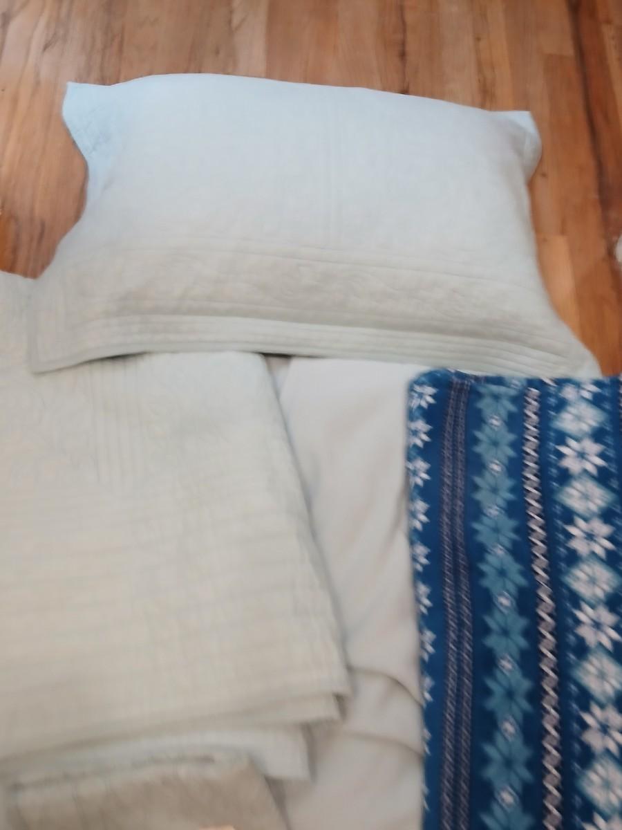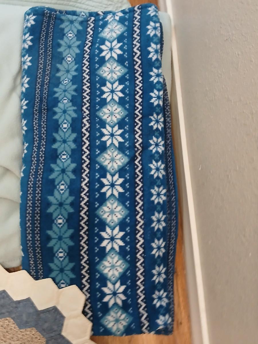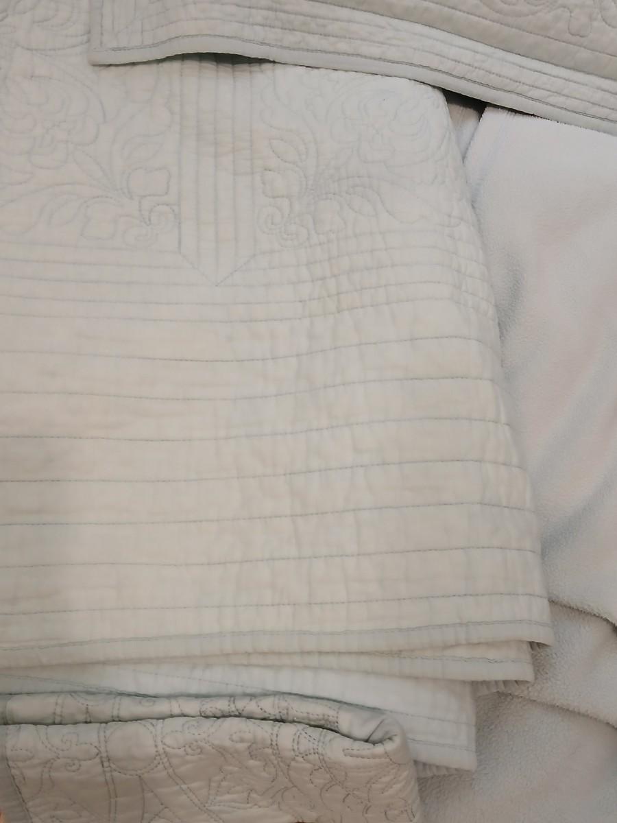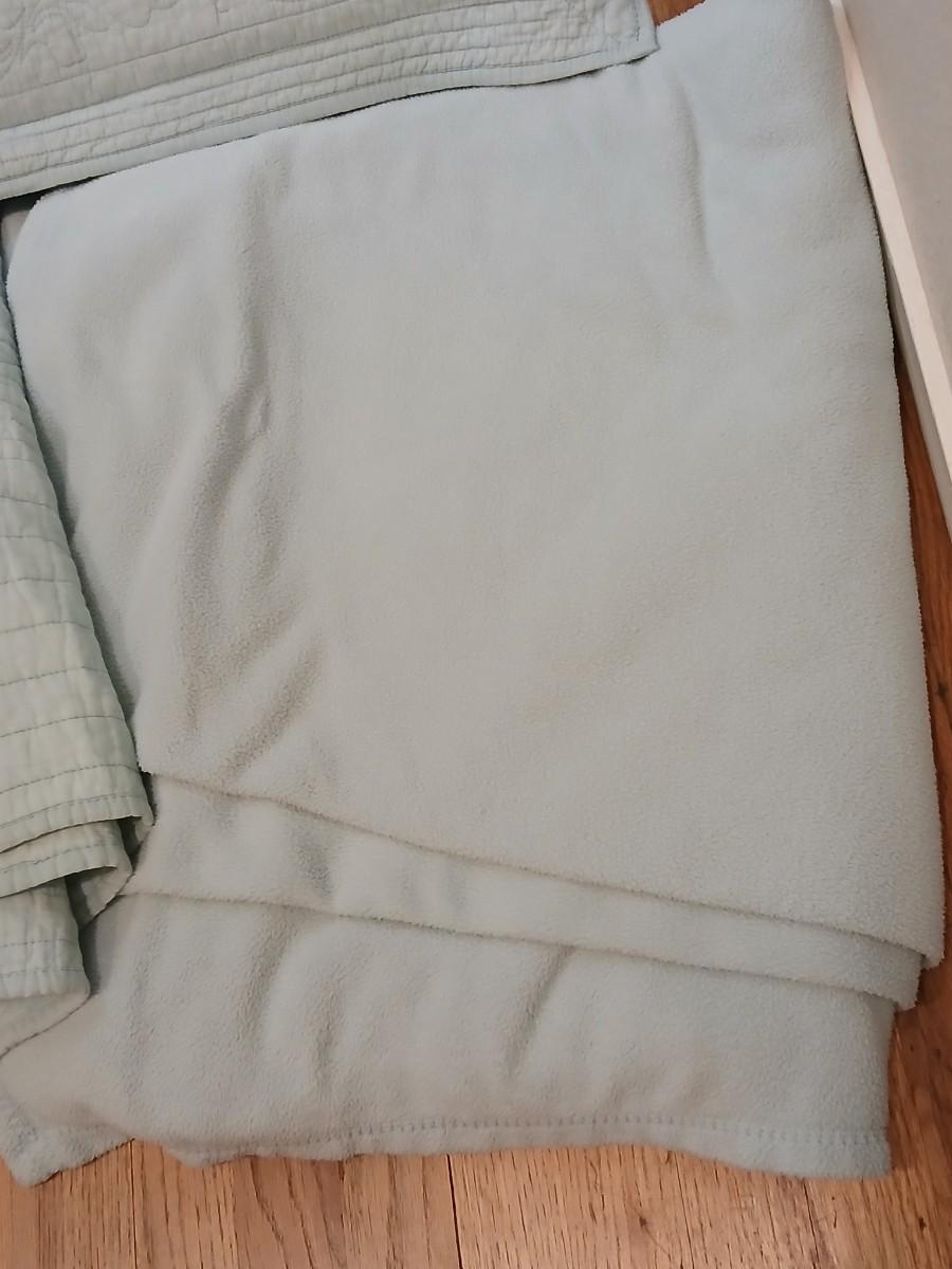 Twin sized bedspread with pillowcases with a Soft Twin blue blanket, a decorative pattern throw, and a quilted Doiley