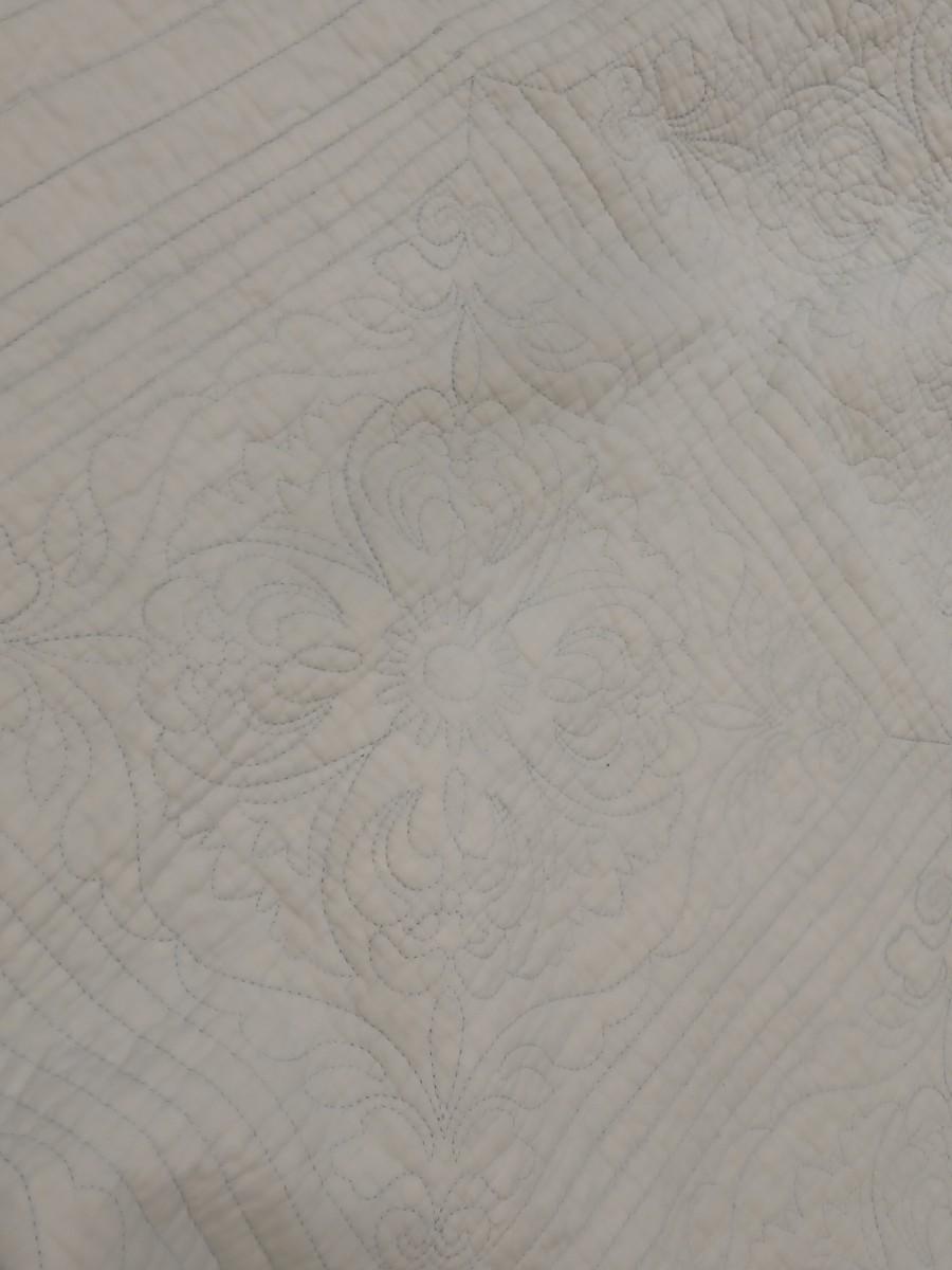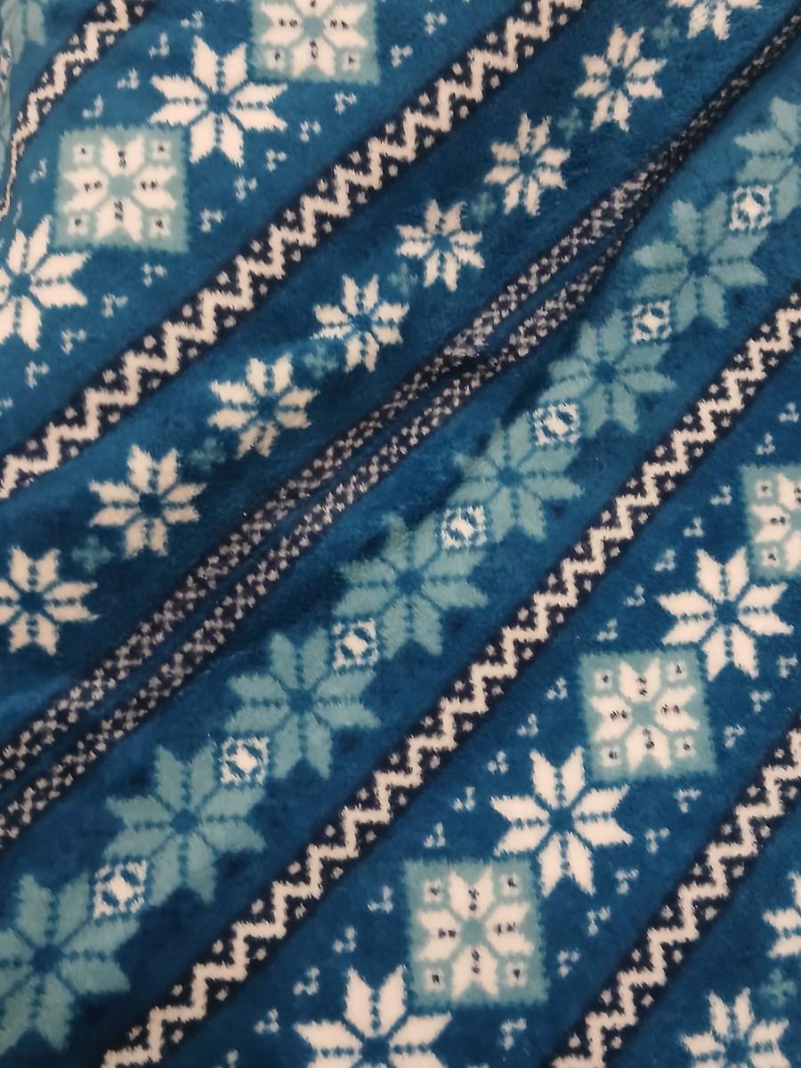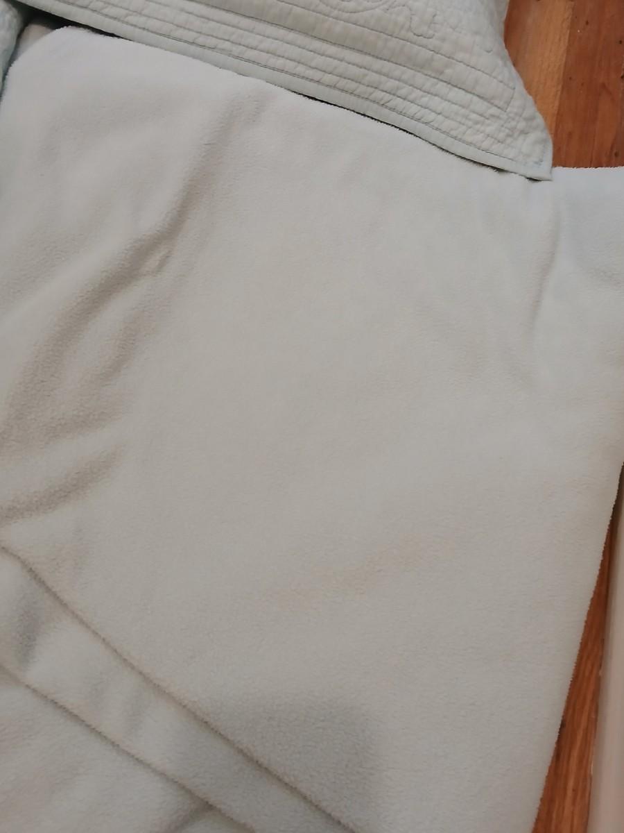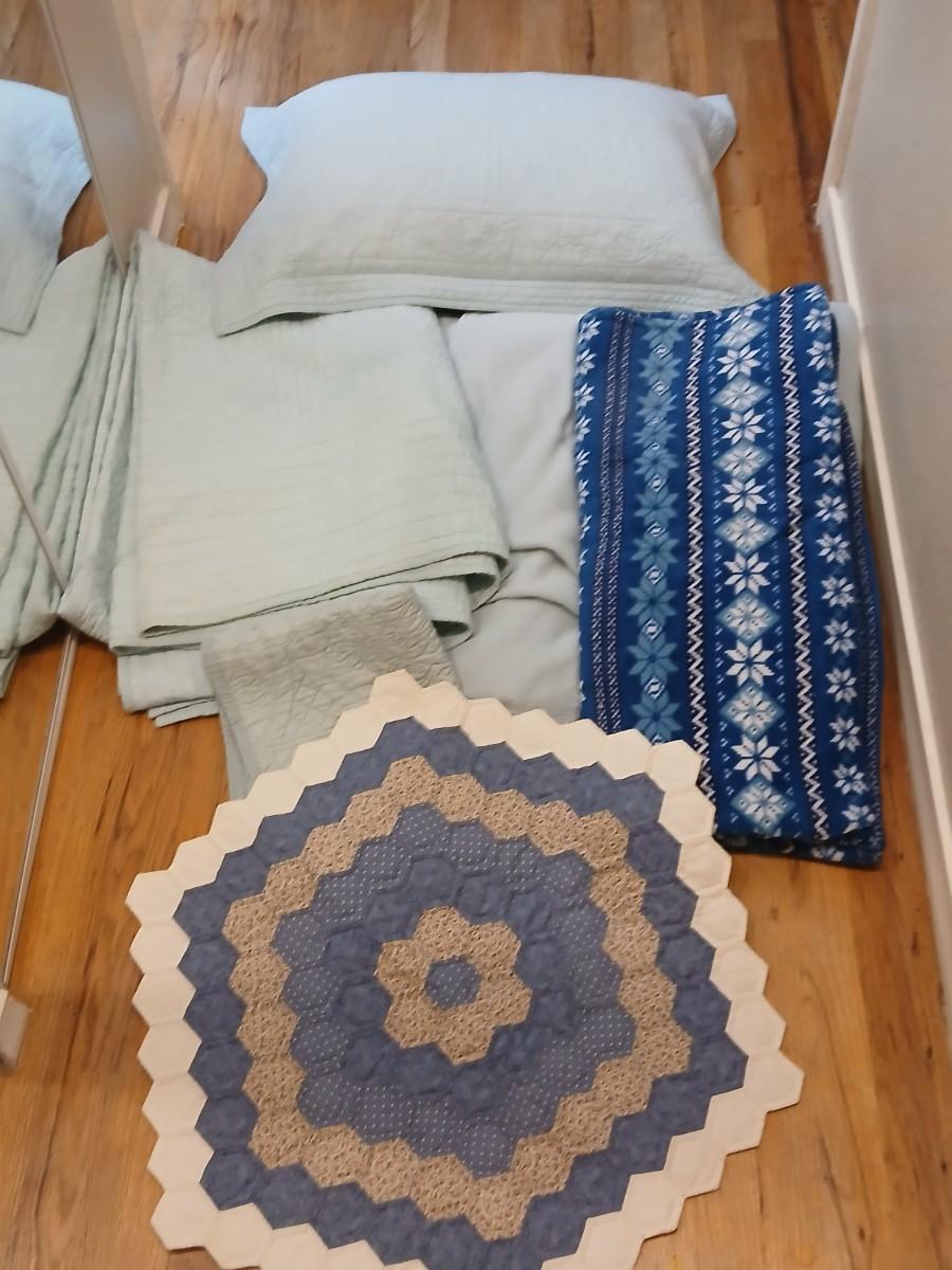 Twin sized bedspread with pillowcases with a Soft Twin blue blanket, a decorative pattern throw, and a quilted Doiley