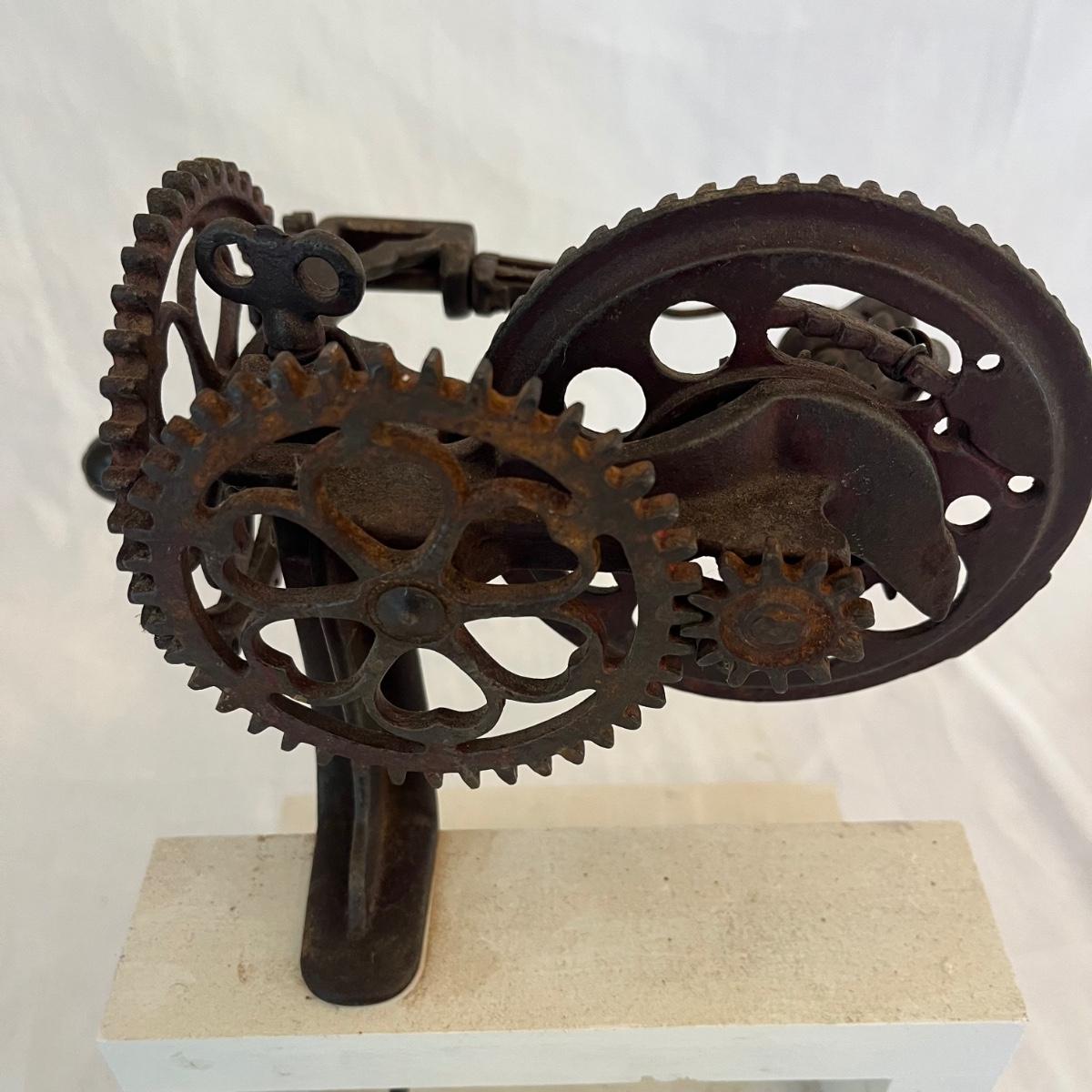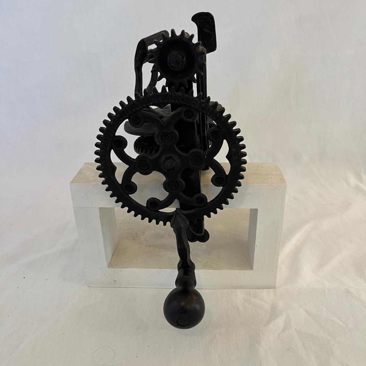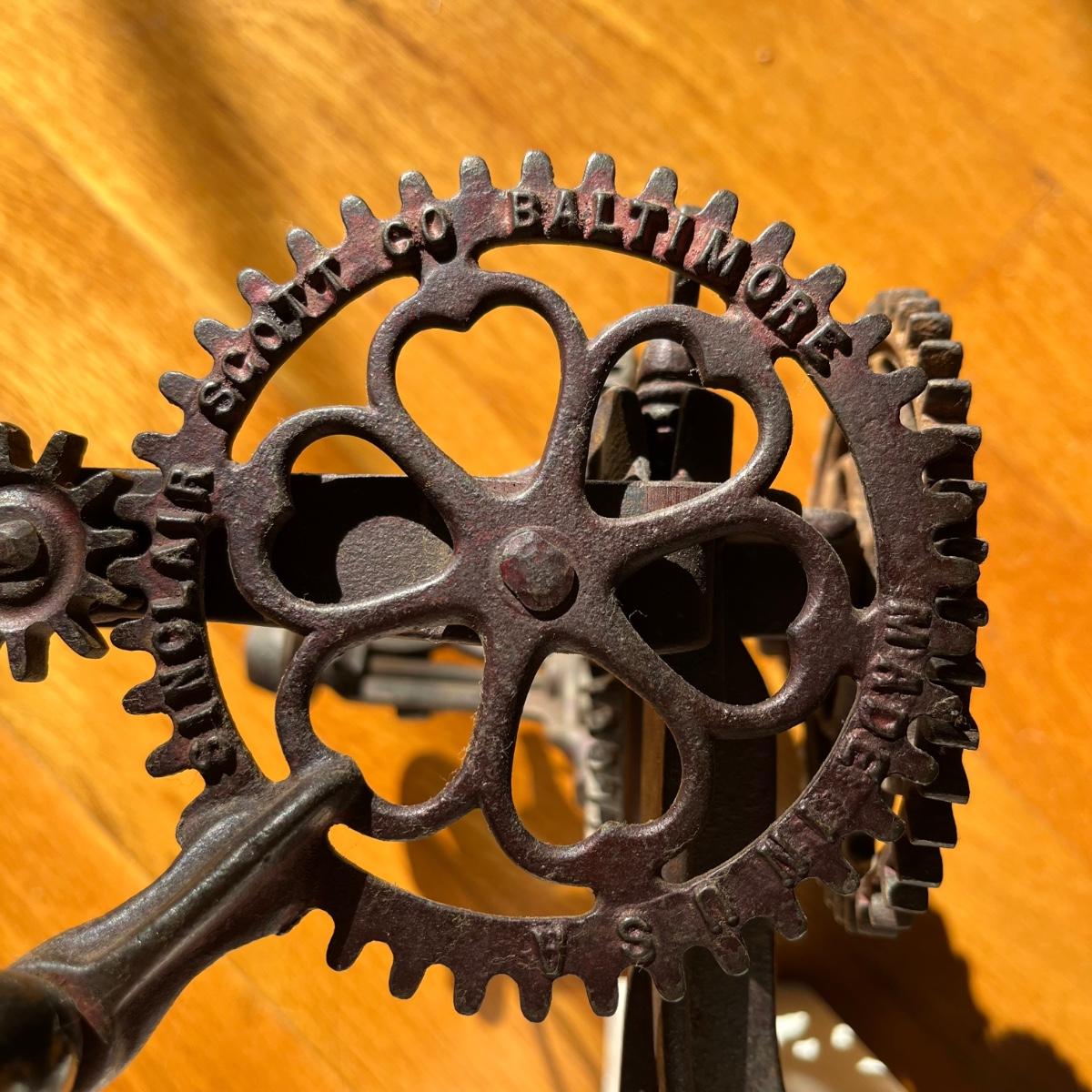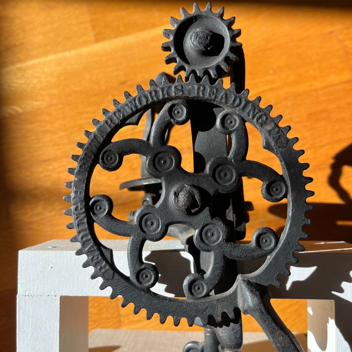 Two vintage cast iron peelers with clamps attached to wood bases. Both crank handles work. That largest is 7.25” x 5” x 10”H and states “Sinclair Scott Co”. The smaller states “Reading Hardware Works”.