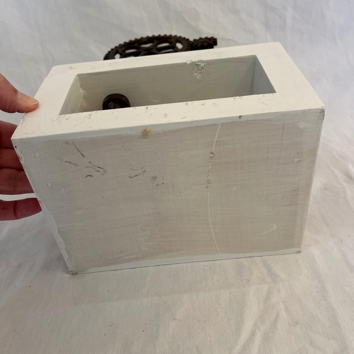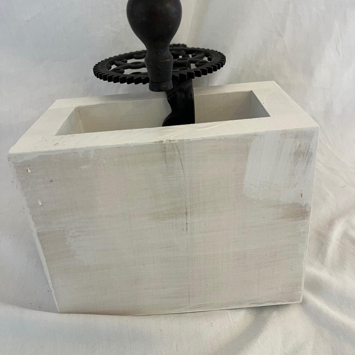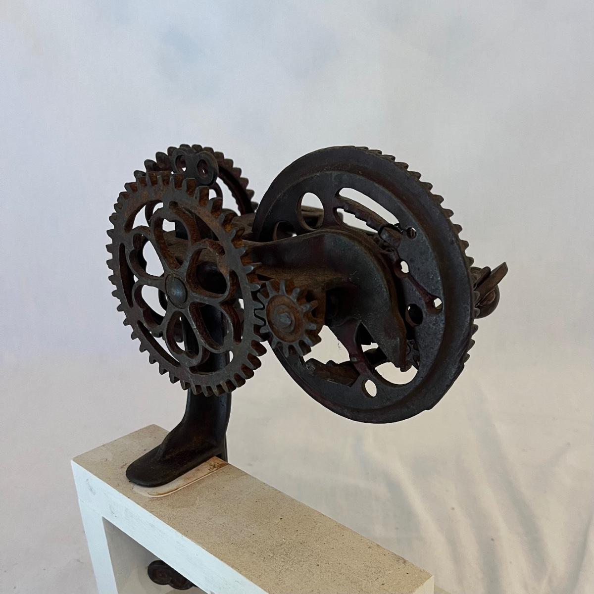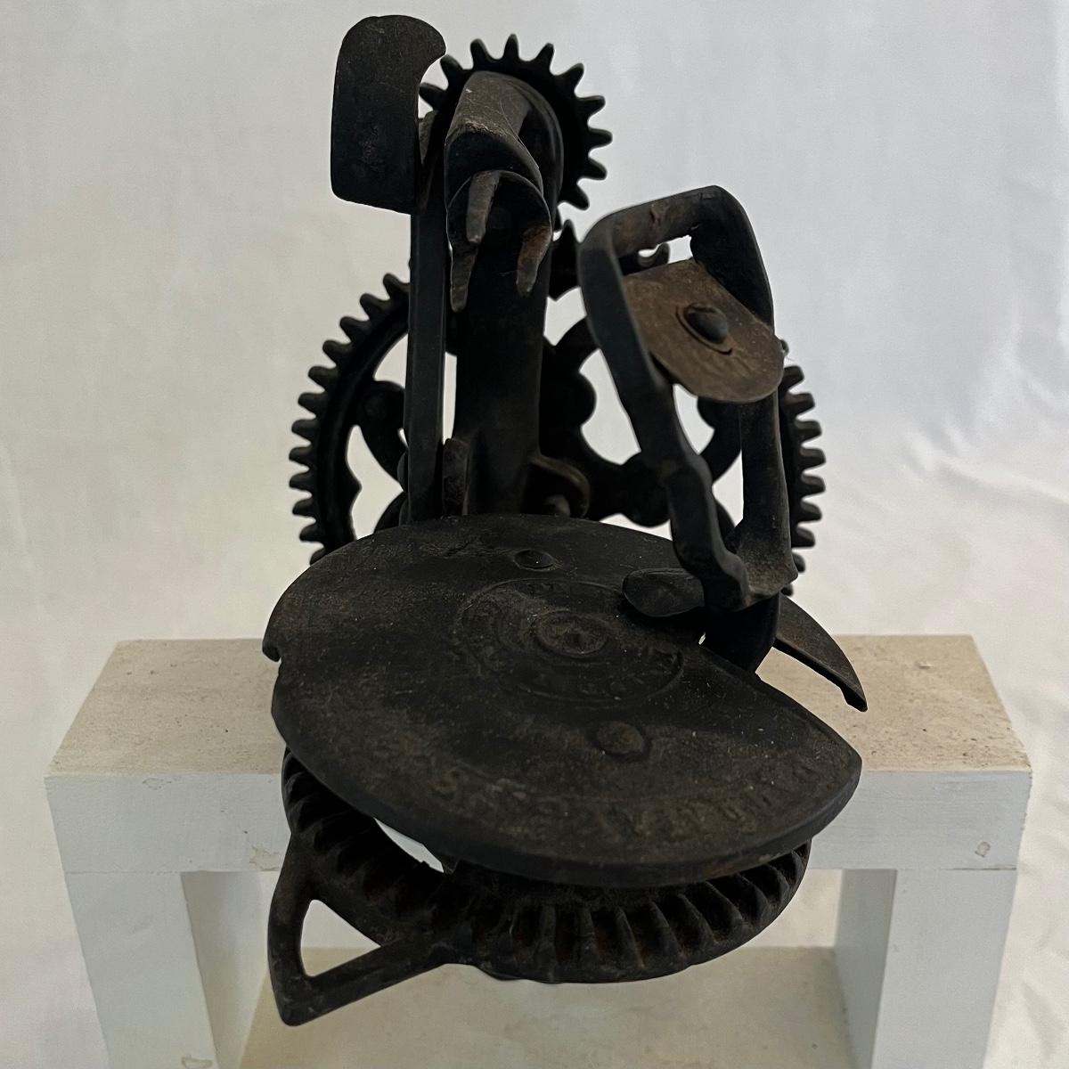 Two vintage cast iron peelers with clamps attached to wood bases. Both crank handles work. That largest is 7.25” x 5” x 10”H and states “Sinclair Scott Co”. The smaller states “Reading Hardware Works”.