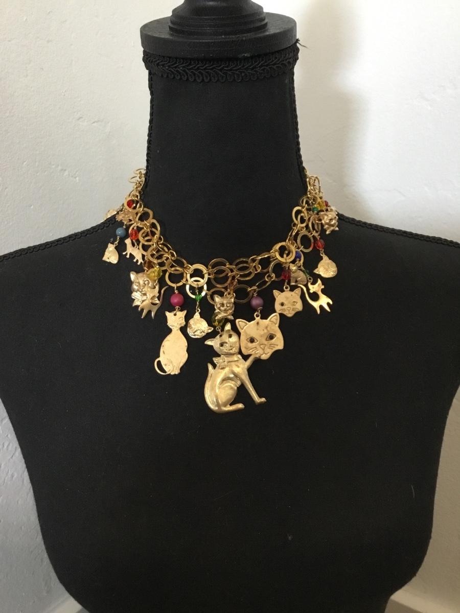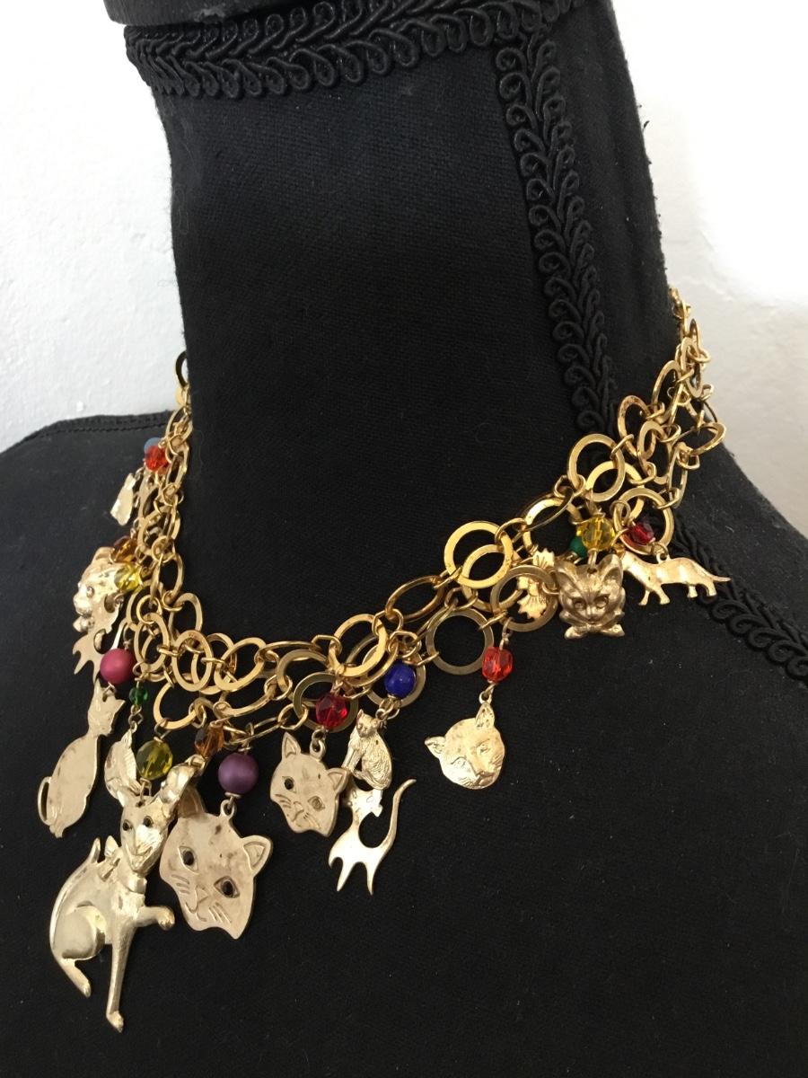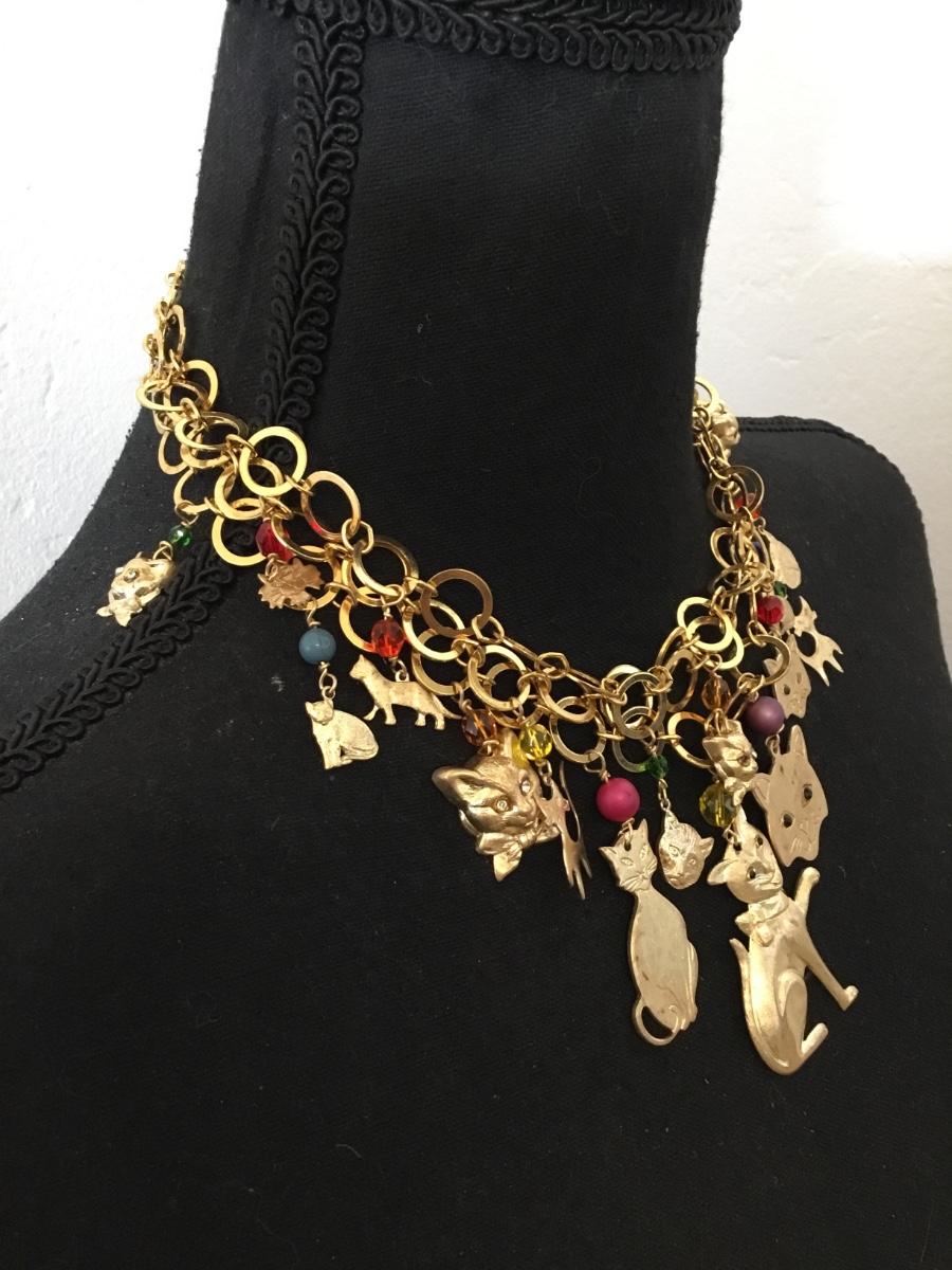 Unique, very rare, vintage, gold tone, kitty cat statement, necklace