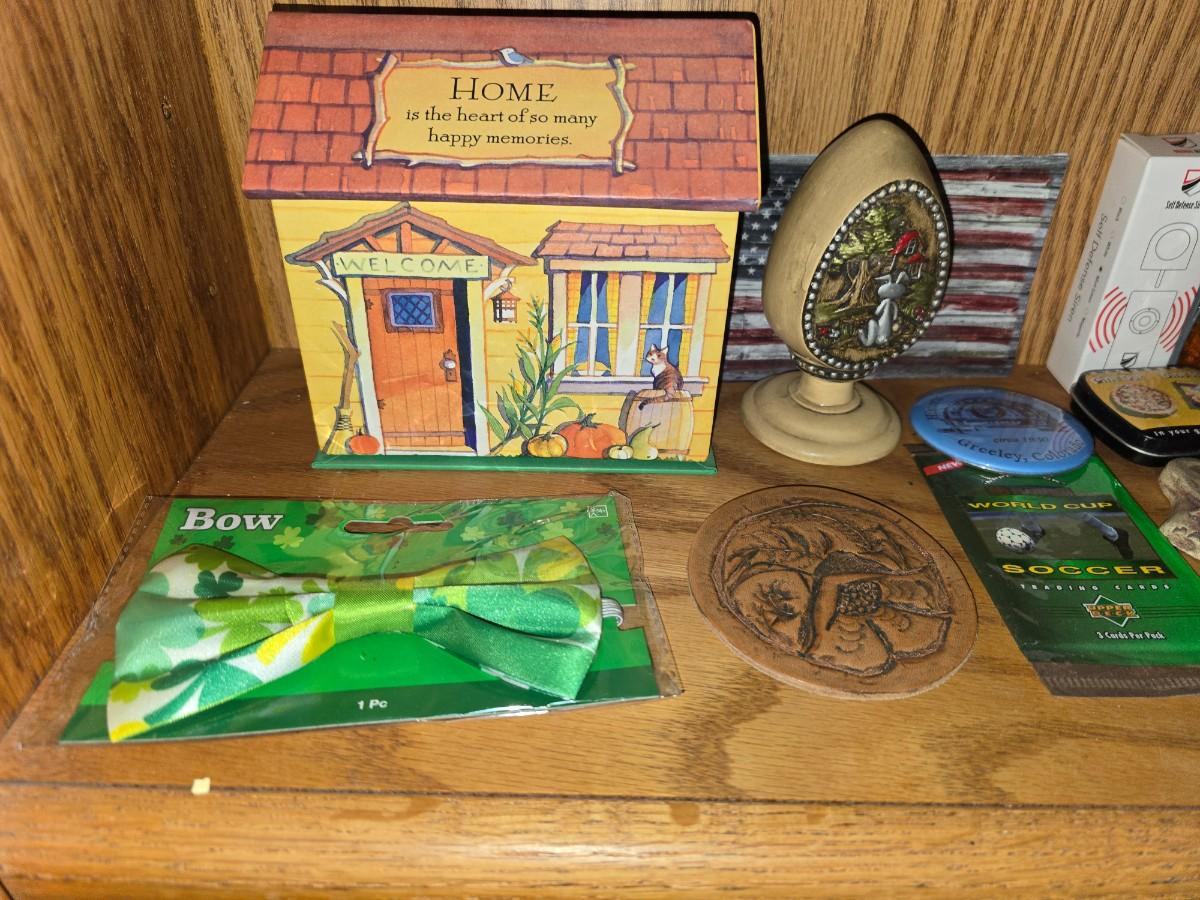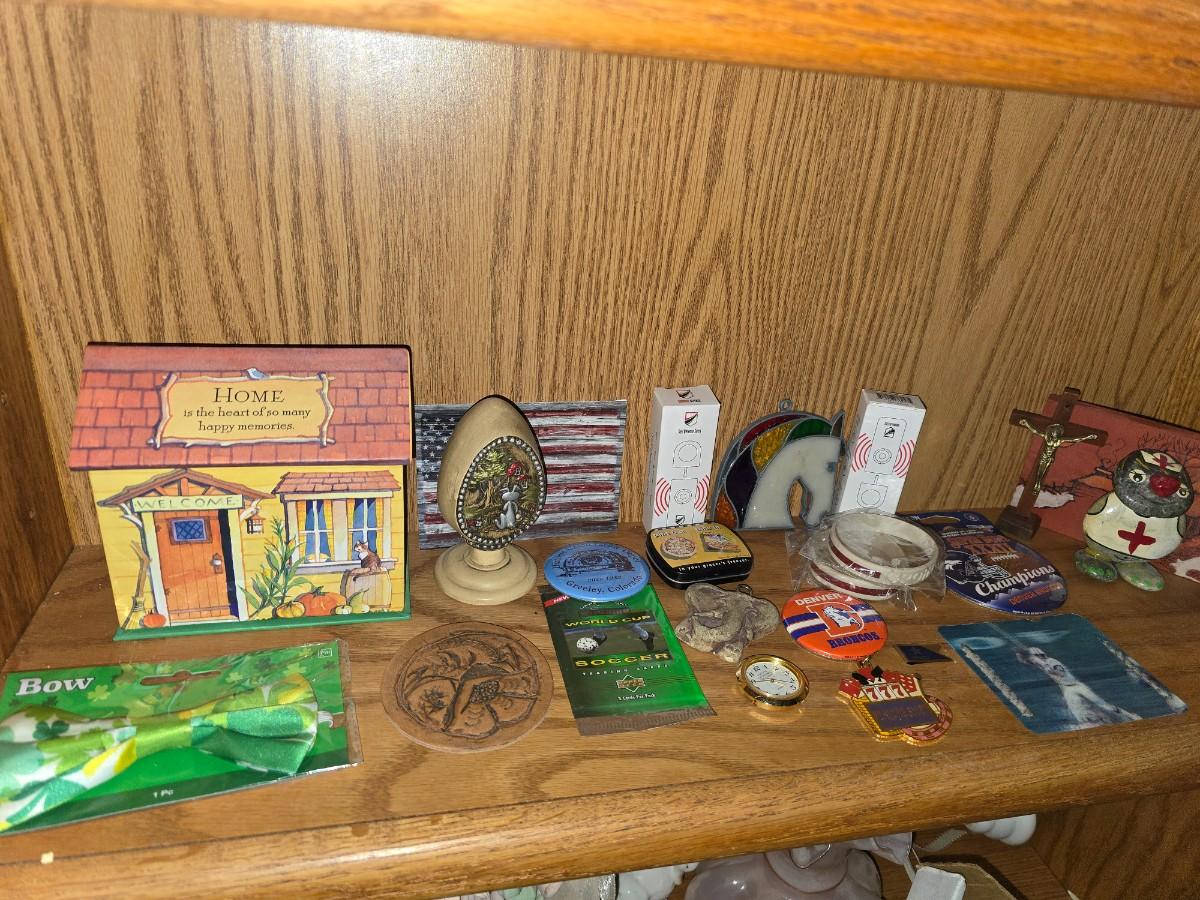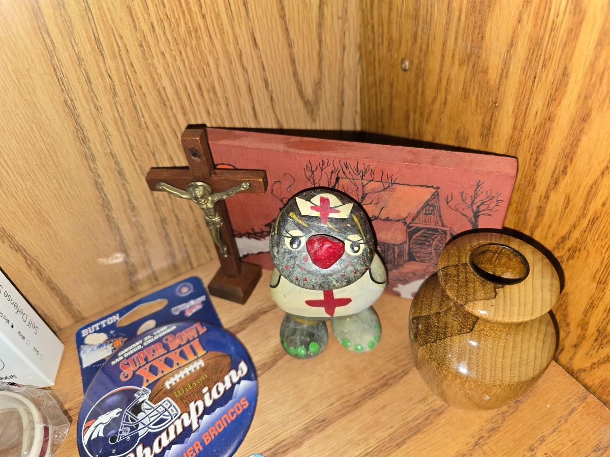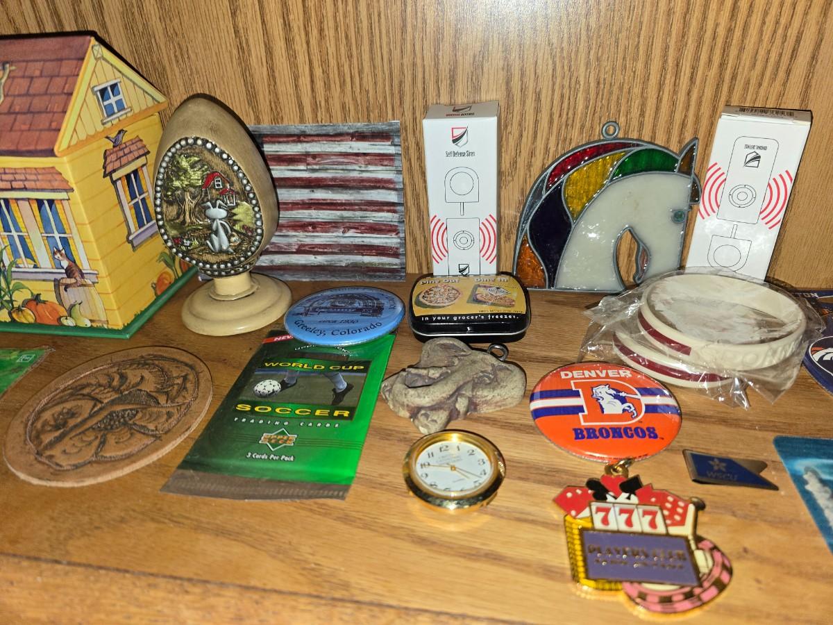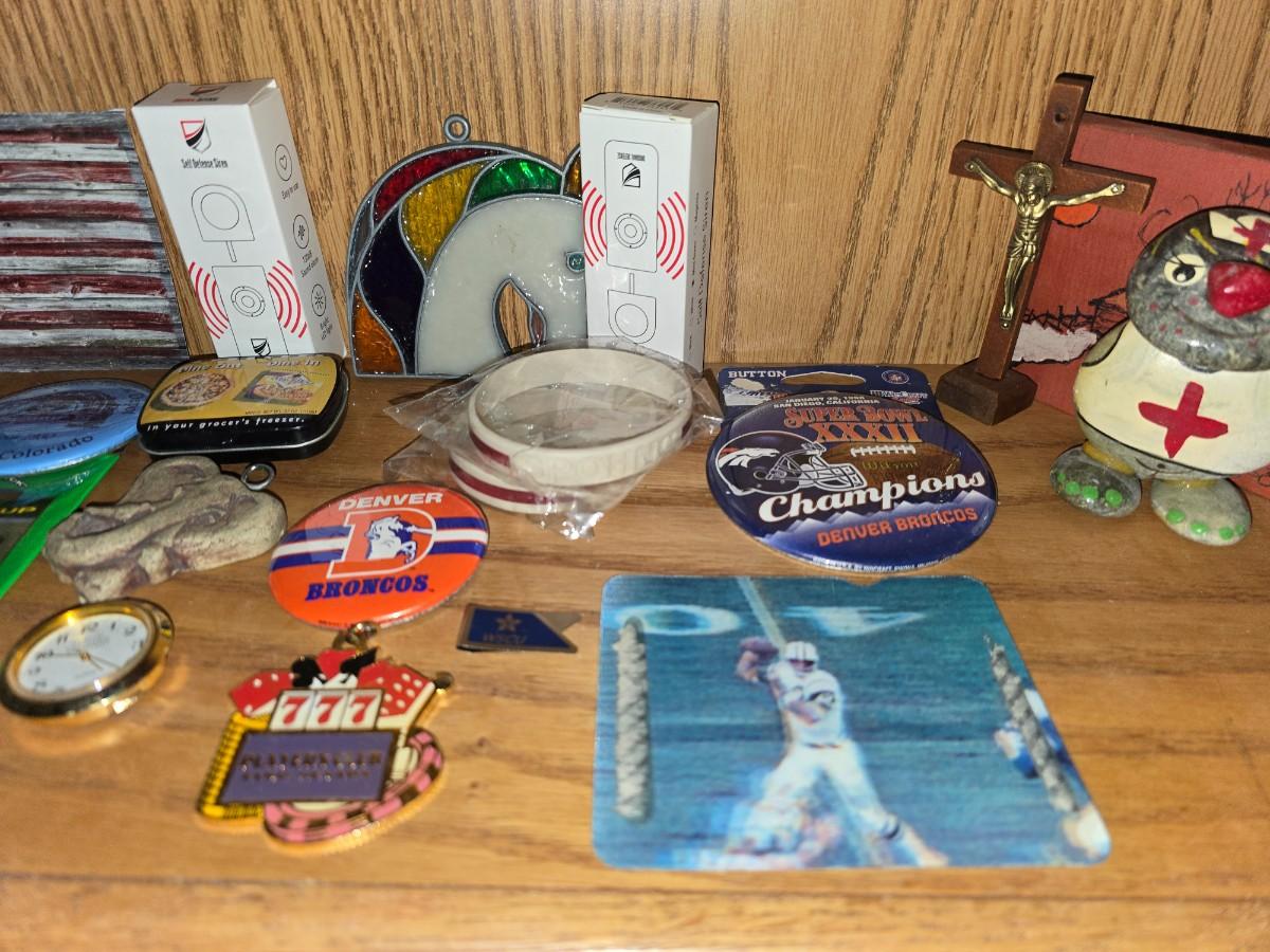 Rock nurse, Broncos pins, Football card, Wood vase, keychain, suncatcher unicorn, sealed soccer card, and much more