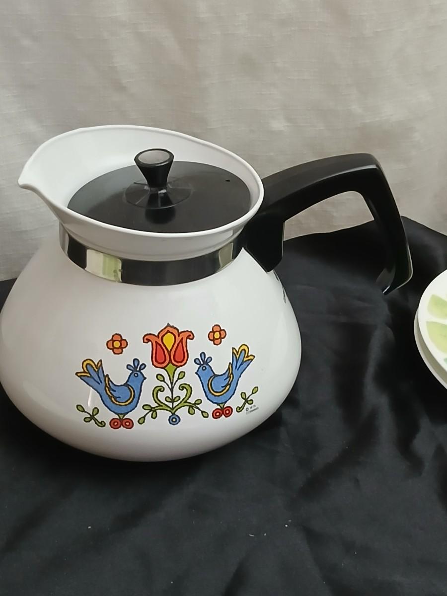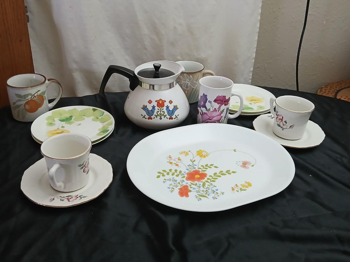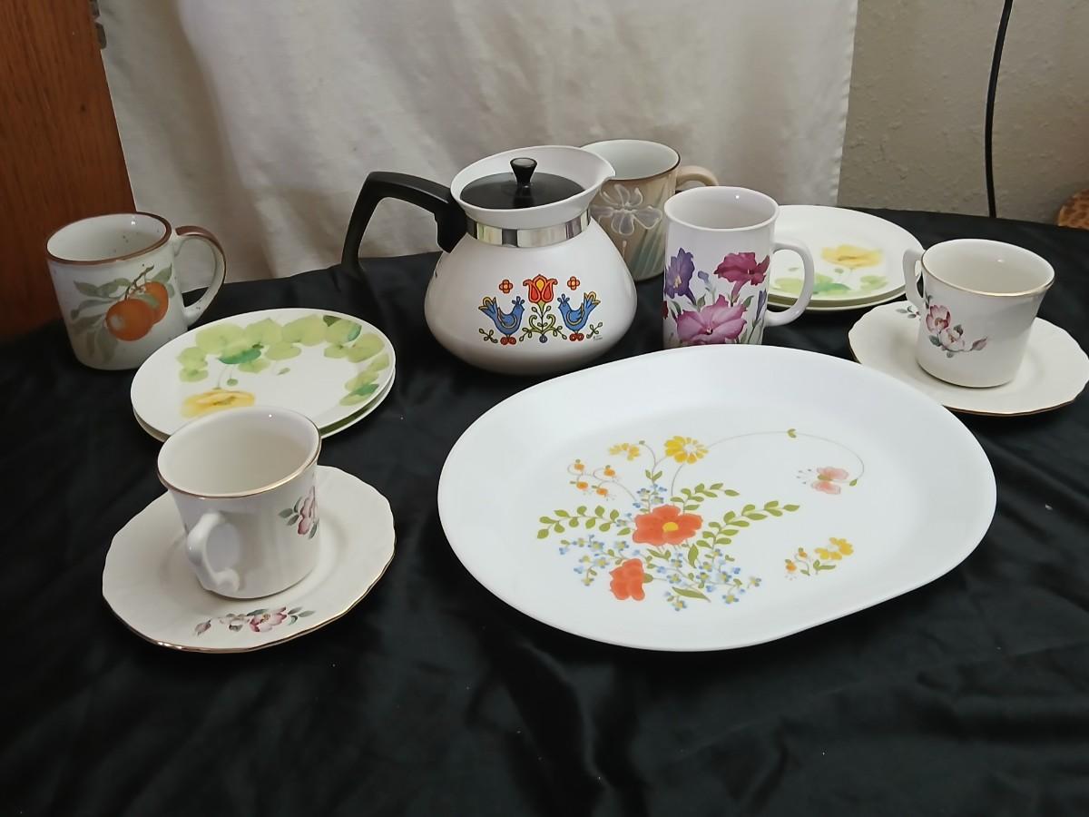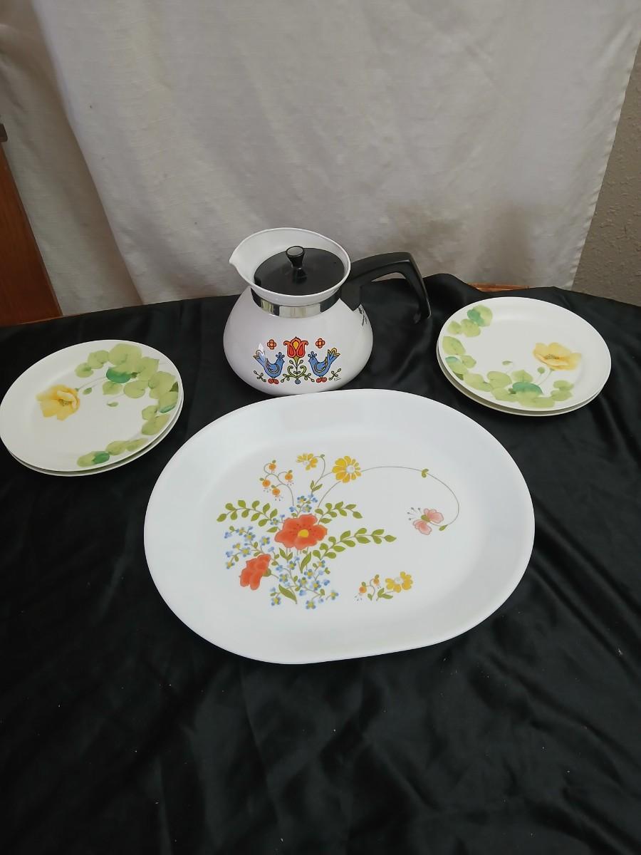 Vintage 1975 Corning Country Festival Blue Birds Coffee Tea Pot 6 Cups with platter, Mikasa dessert plates and mugs