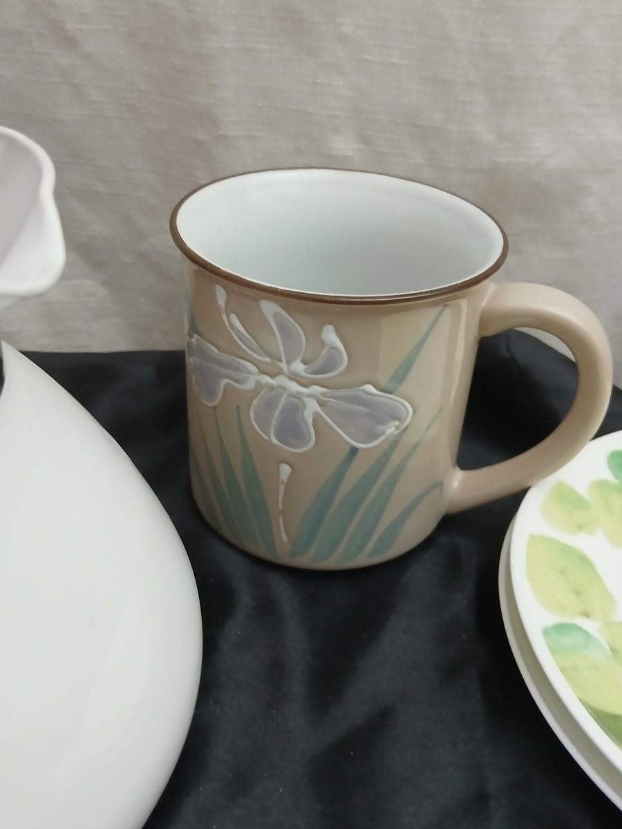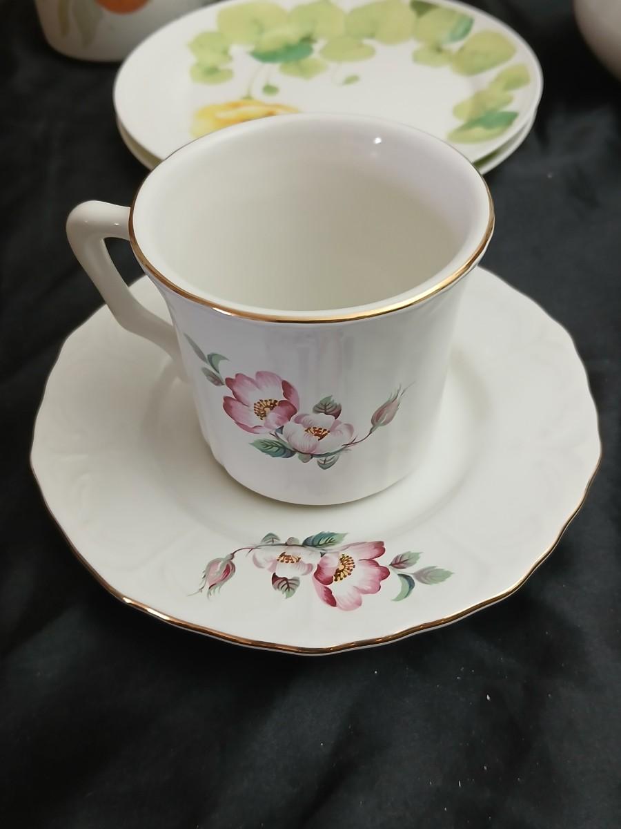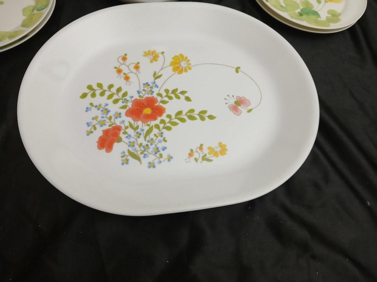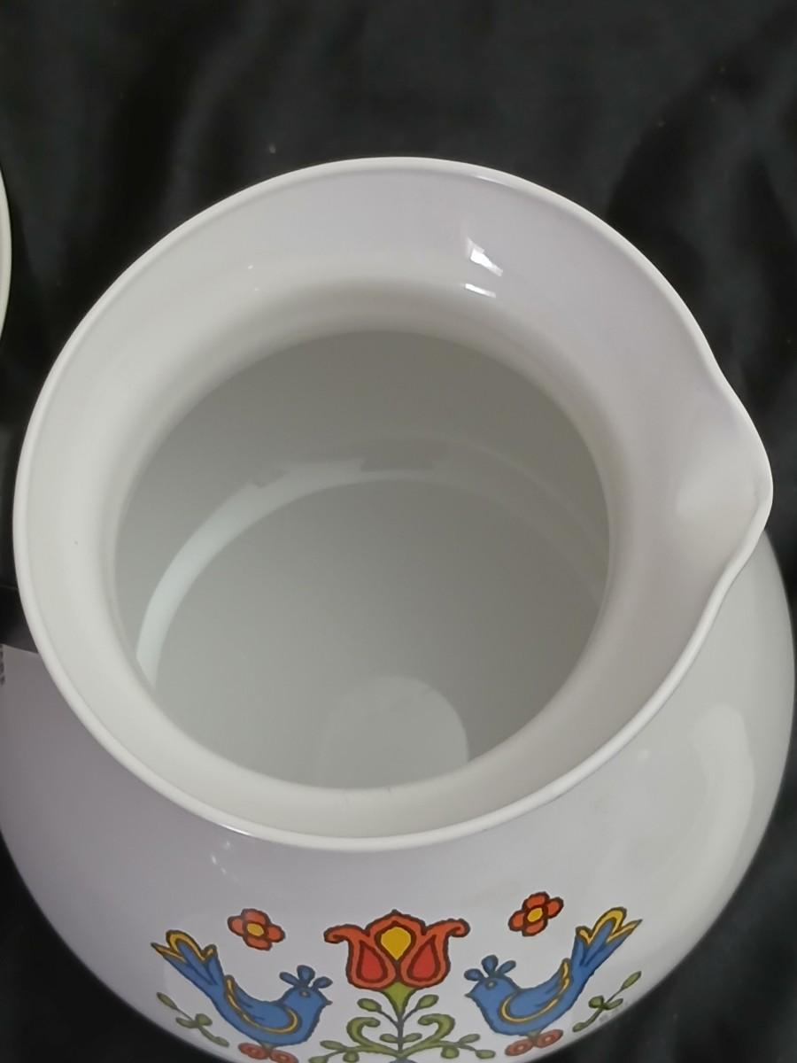 Vintage 1975 Corning Country Festival Blue Birds Coffee Tea Pot 6 Cups with platter, Mikasa dessert plates and mugs
