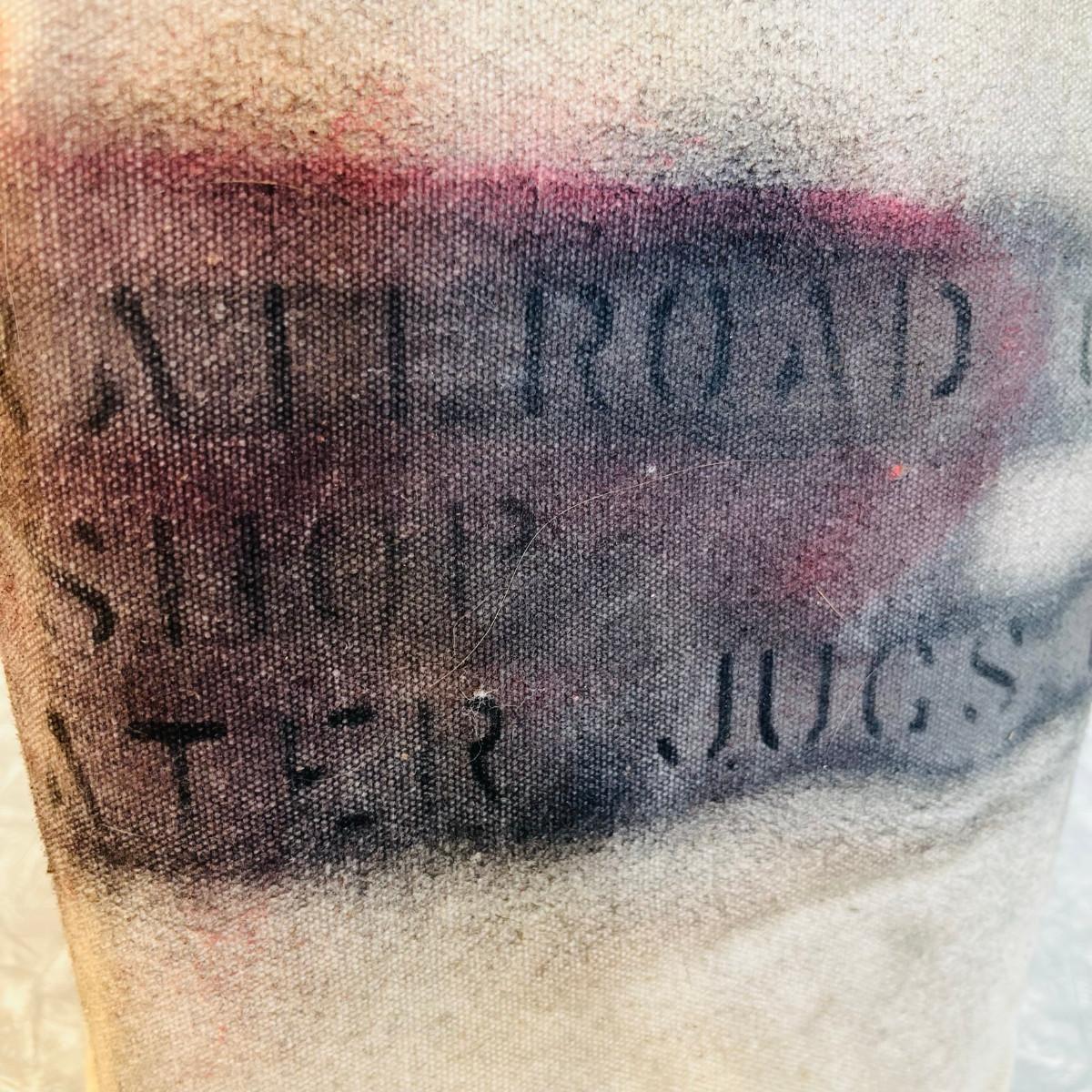 This was discarded, and painted to hide the name. Canvas water bag, sand bag for fires. Circa 1950s.