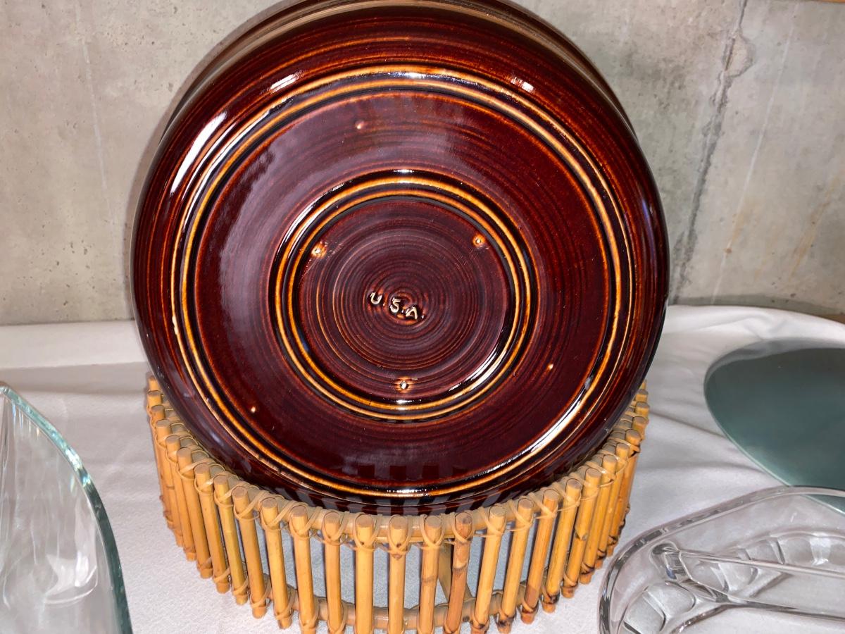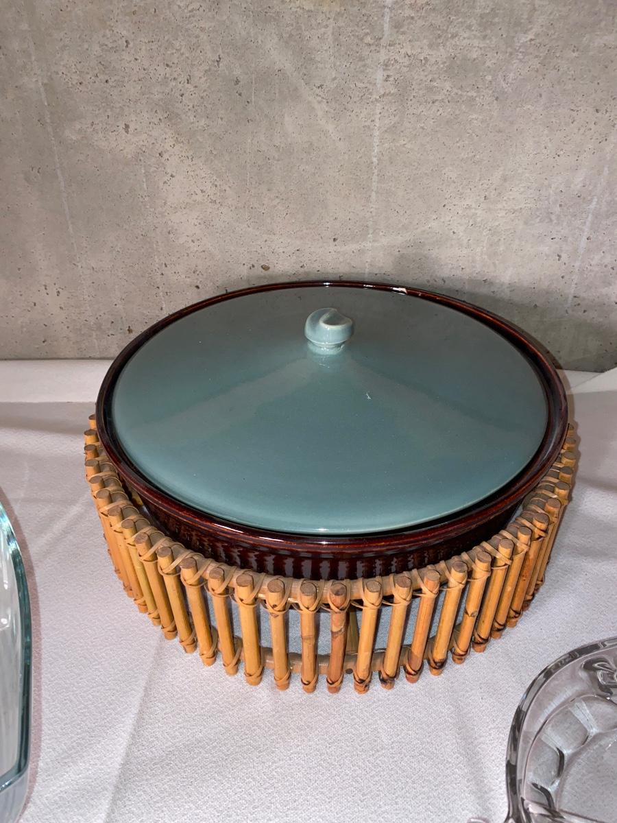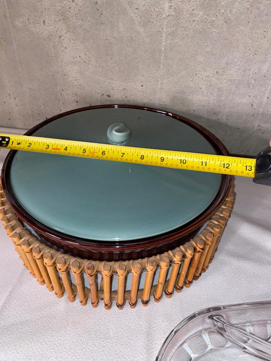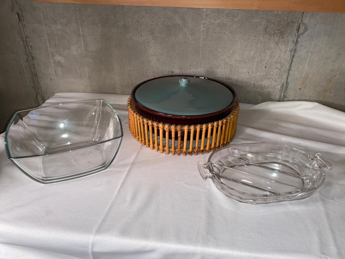 USA MADE CASSEROLE DISH WITH NIFTY WICKER HOLSTER, LARGE SQUARE SERVING BOWL AND SPACED DISH