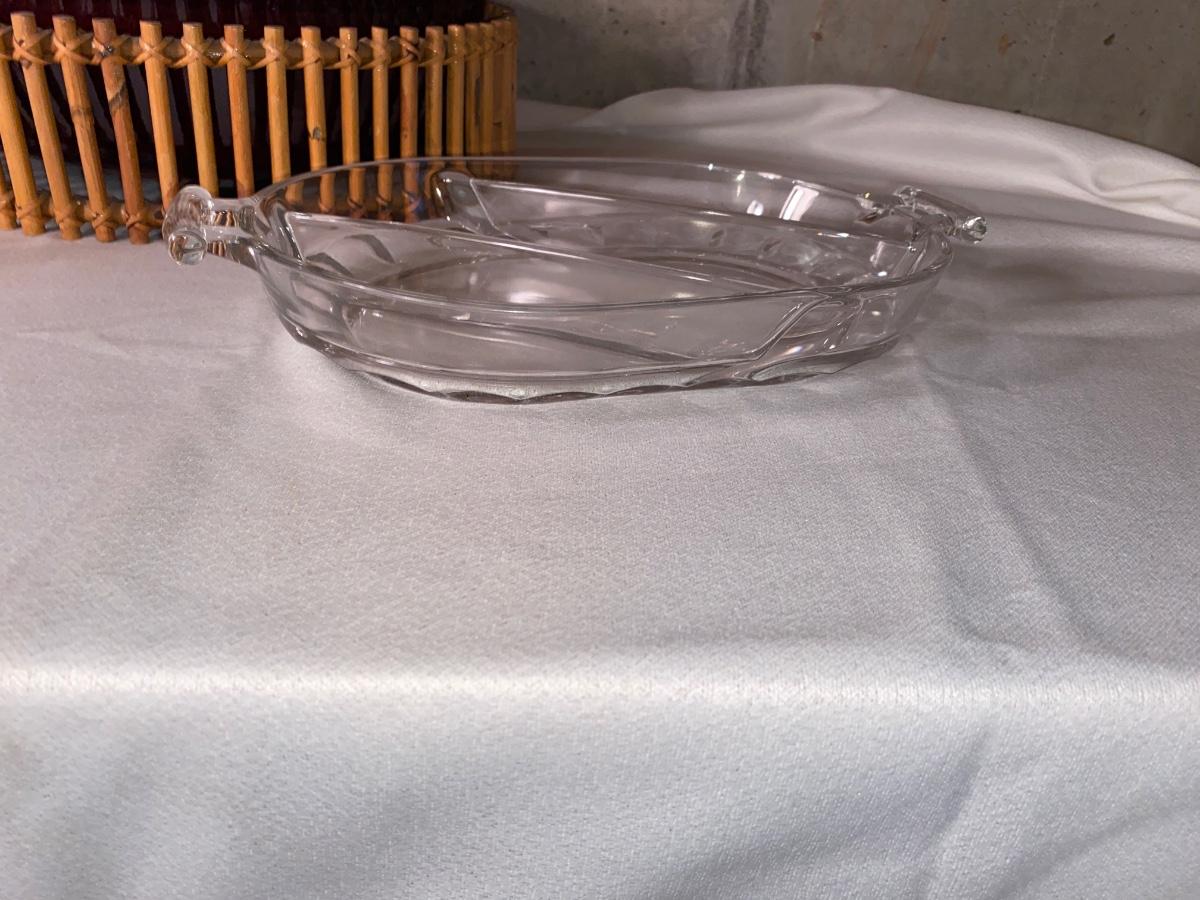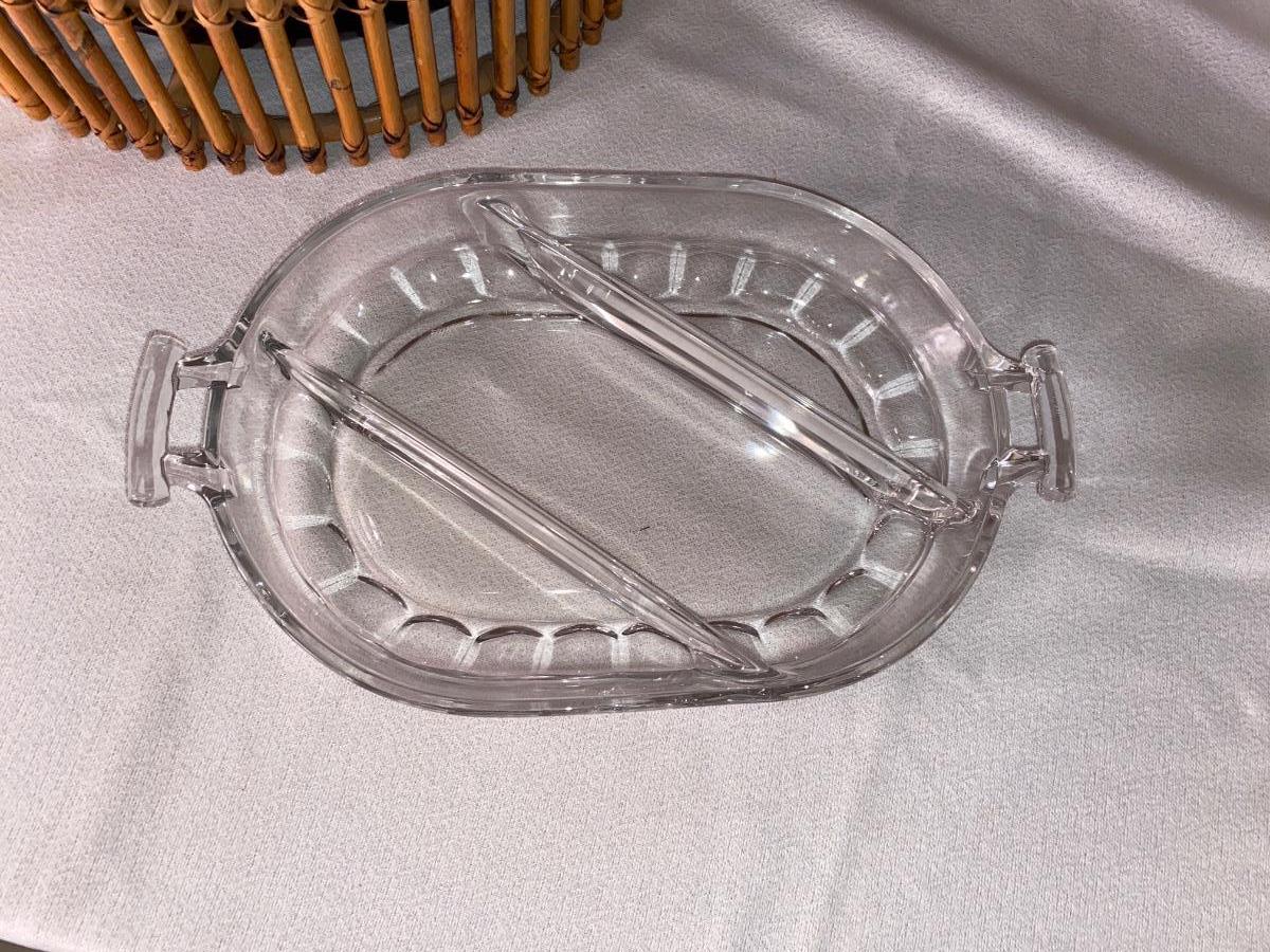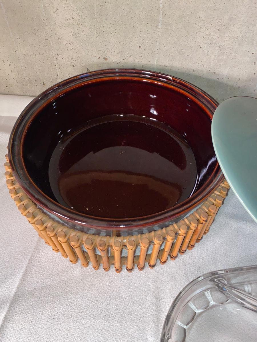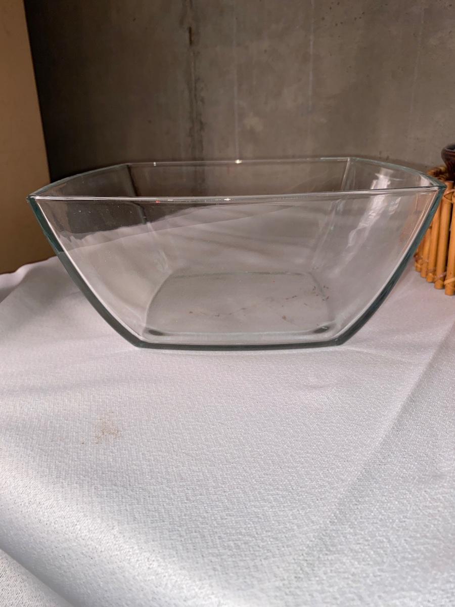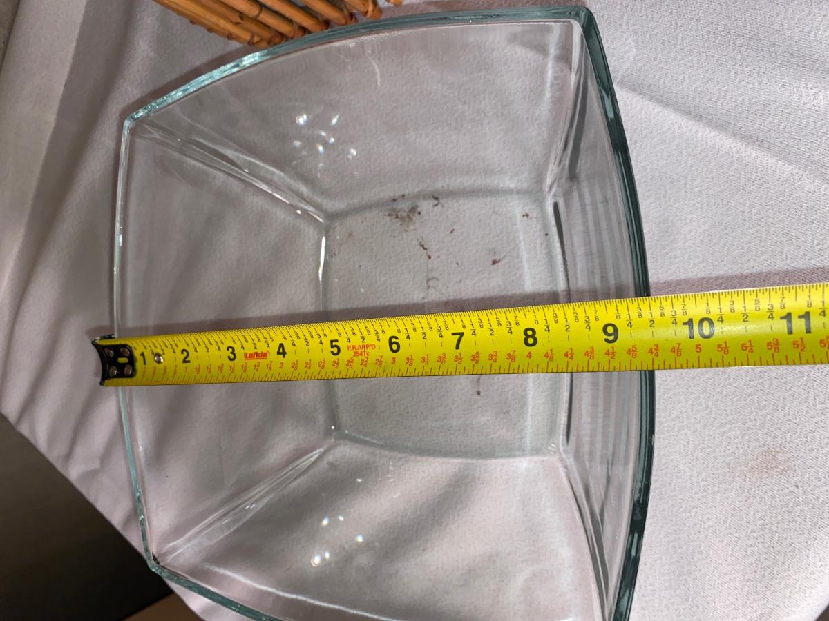USA MADE CASSEROLE DISH WITH NIFTY WICKER HOLSTER, LARGE SQUARE SERVING BOWL AND SPACED DISH