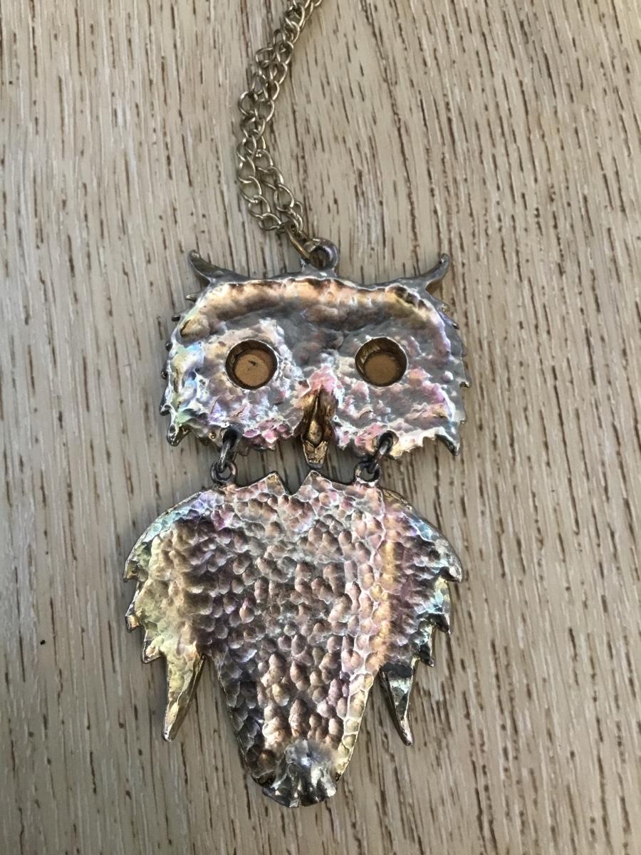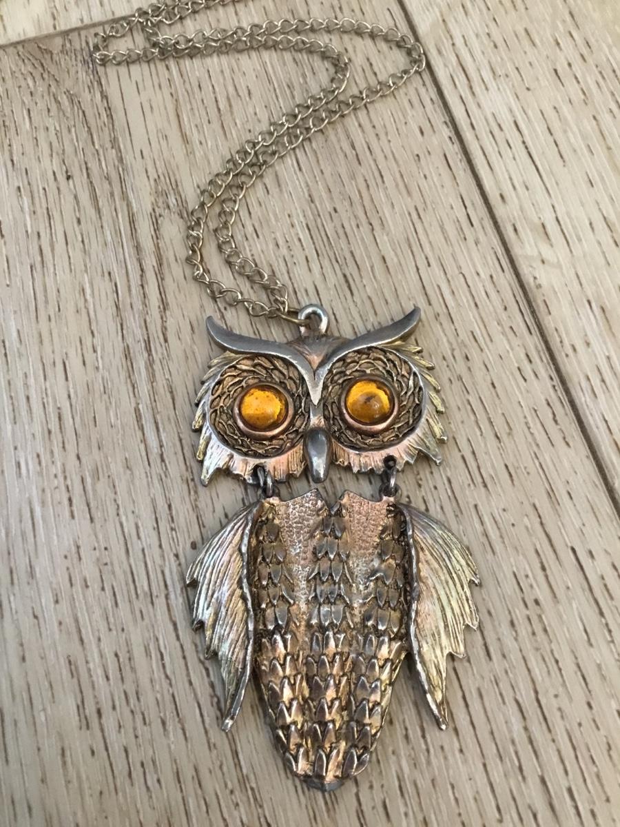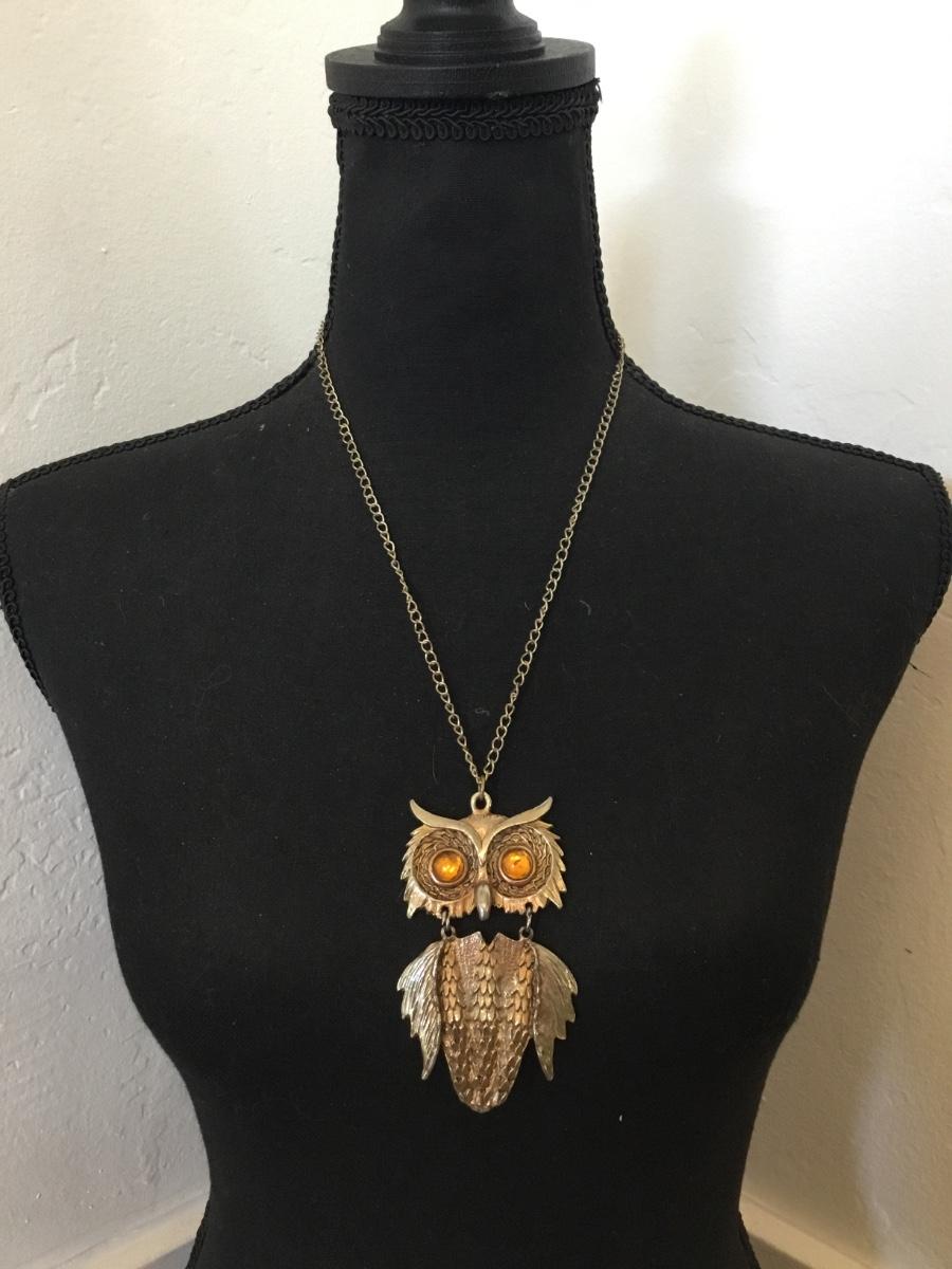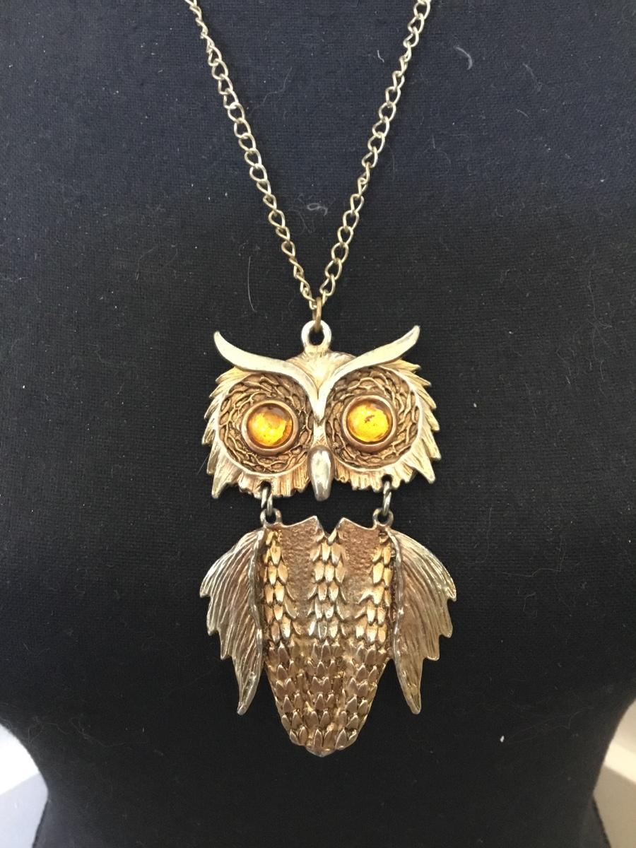 Vintage 1960s, large gold toned owl with amber eyes, large pendant statement, necklace