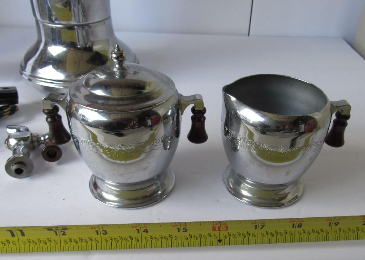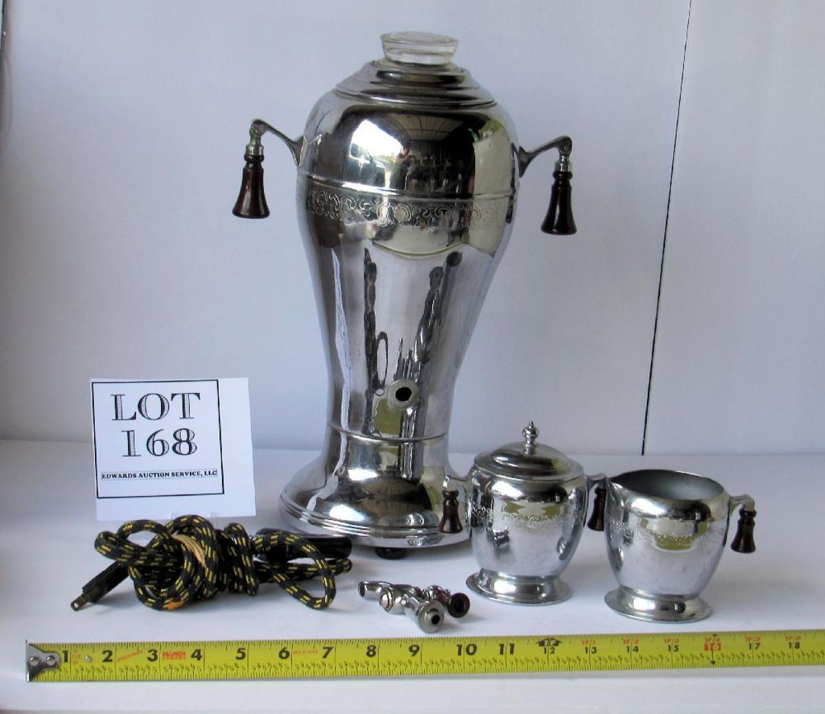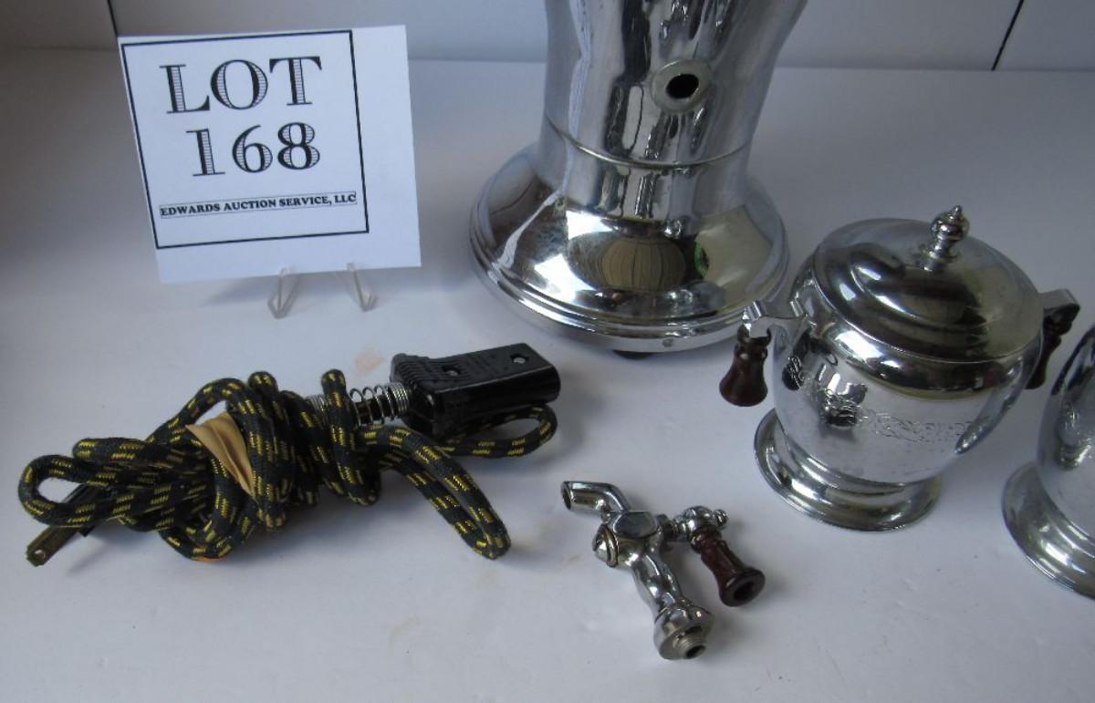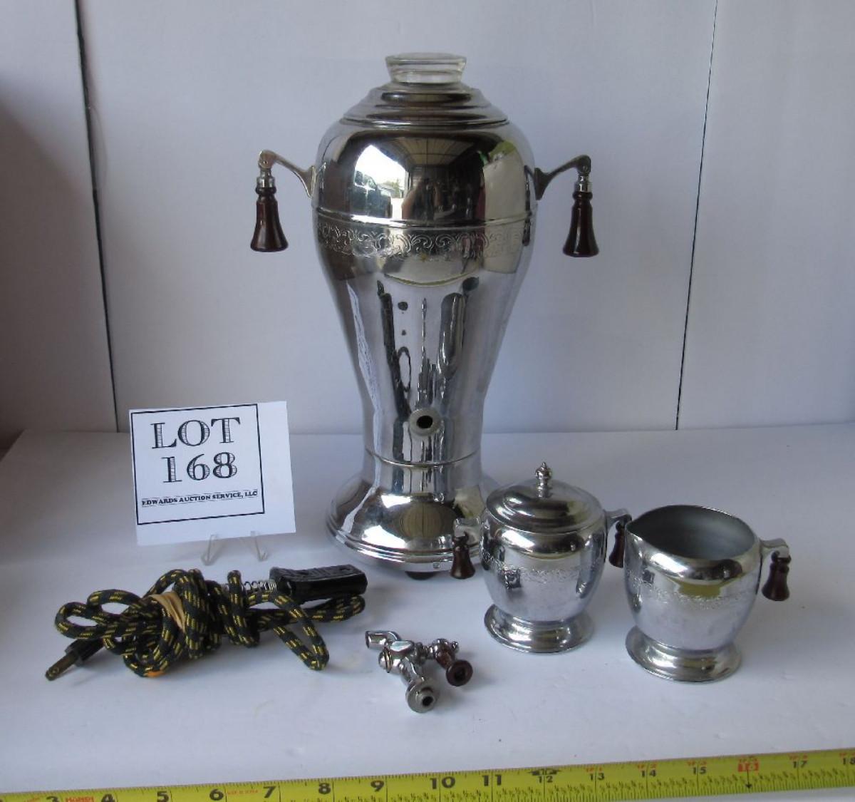 I think this is chrome, not silver plate. The spigot is off and needs to be reattached. It comes with cord, cover, and sugar cover. Did not try it to see if it works.