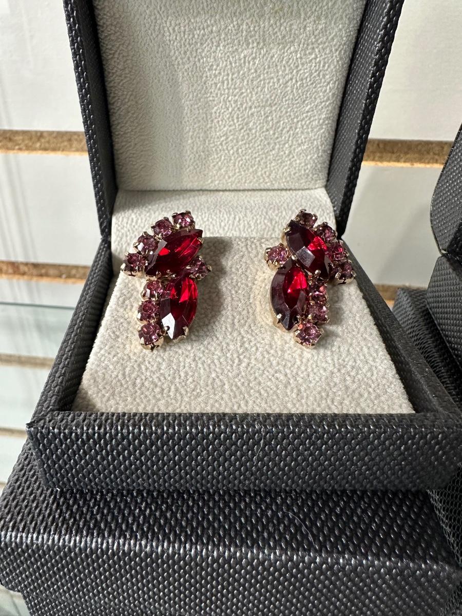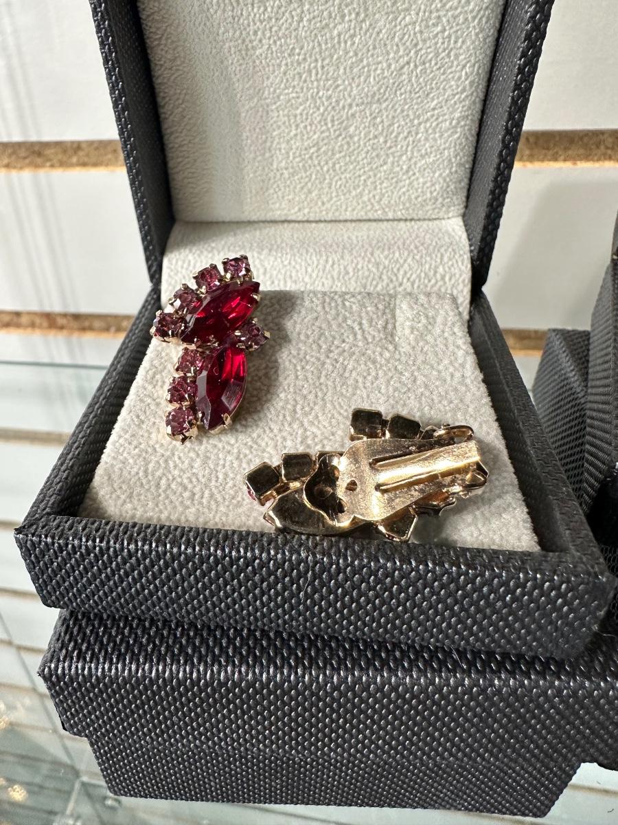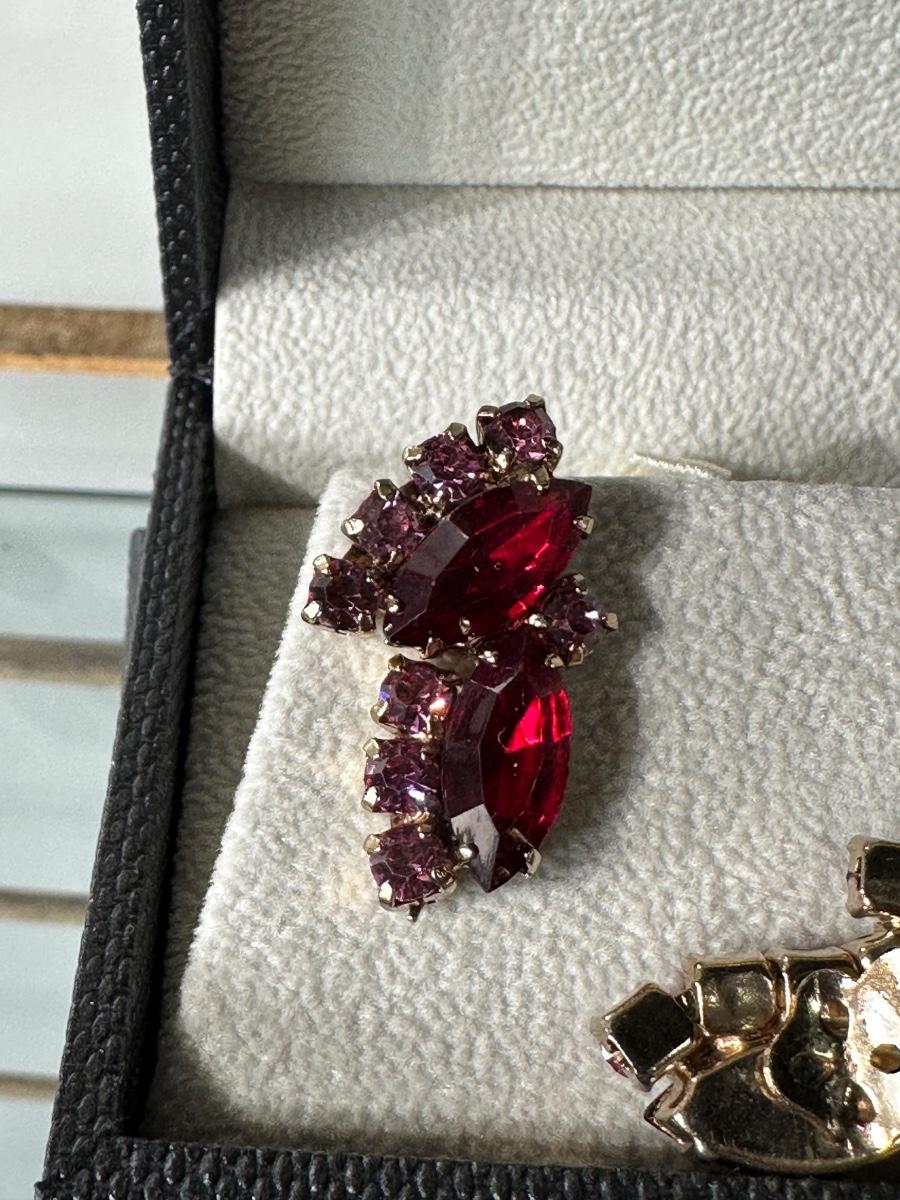 VINTAGE DARK FUCHSIA RED AND PINK RHINESTONE CLIP-ON EARRINGS AND VINTAGE PORCELAIN PINK ROSE CLIP-ON EARRINGS