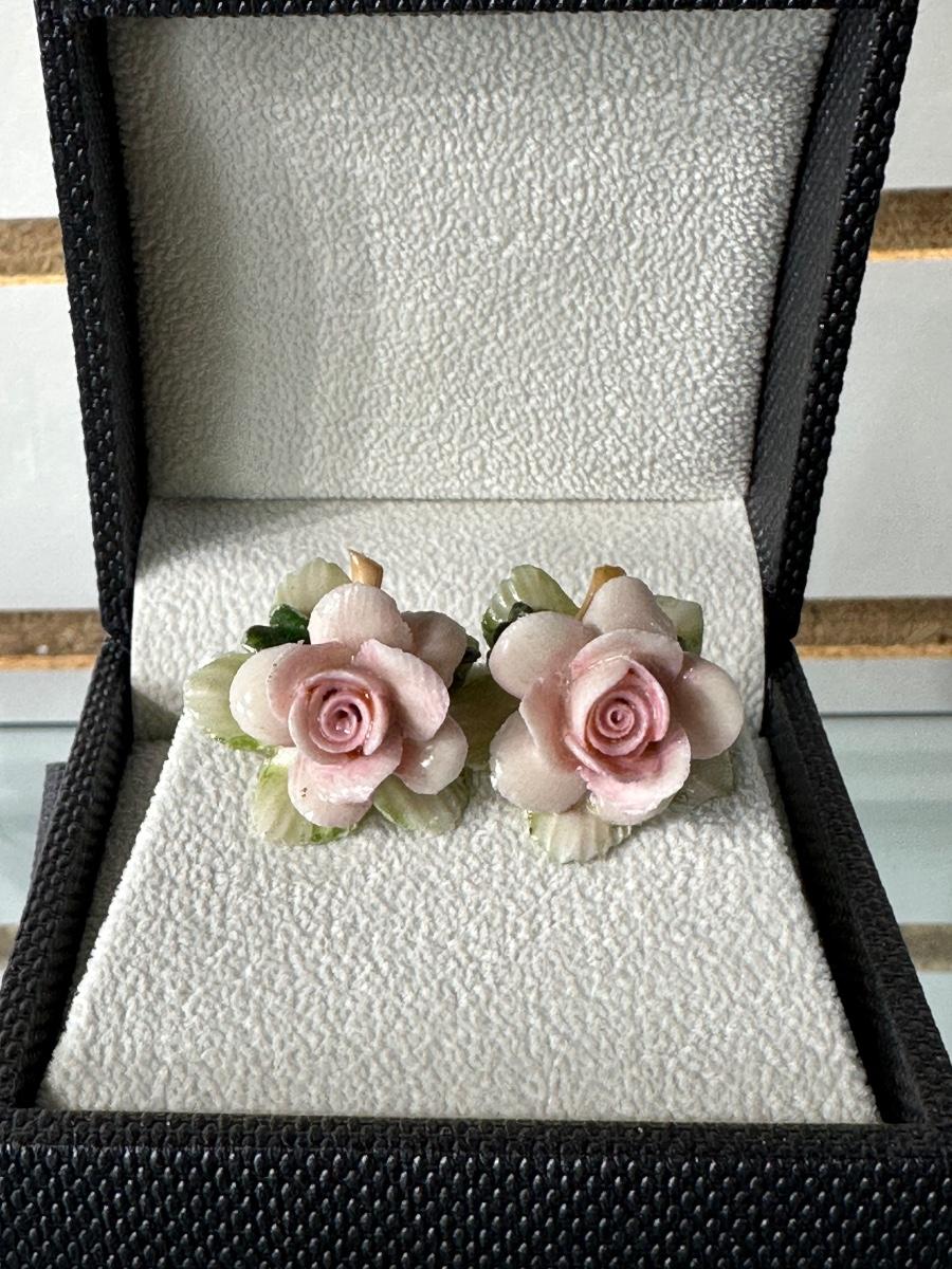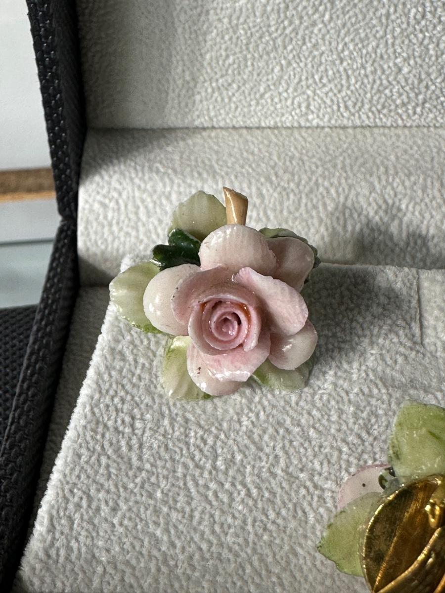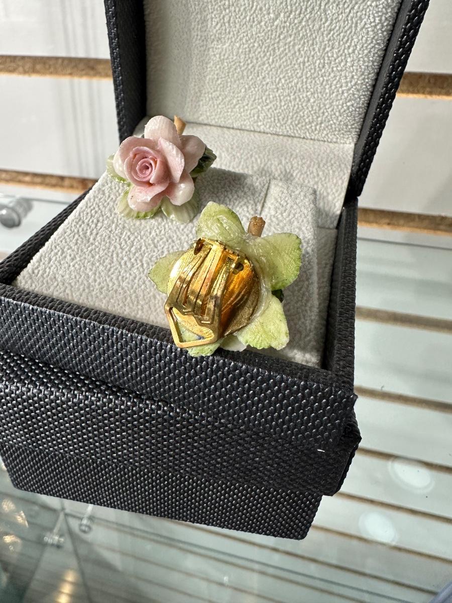 VINTAGE DARK FUCHSIA RED AND PINK RHINESTONE CLIP-ON EARRINGS AND VINTAGE PORCELAIN PINK ROSE CLIP-ON EARRINGS