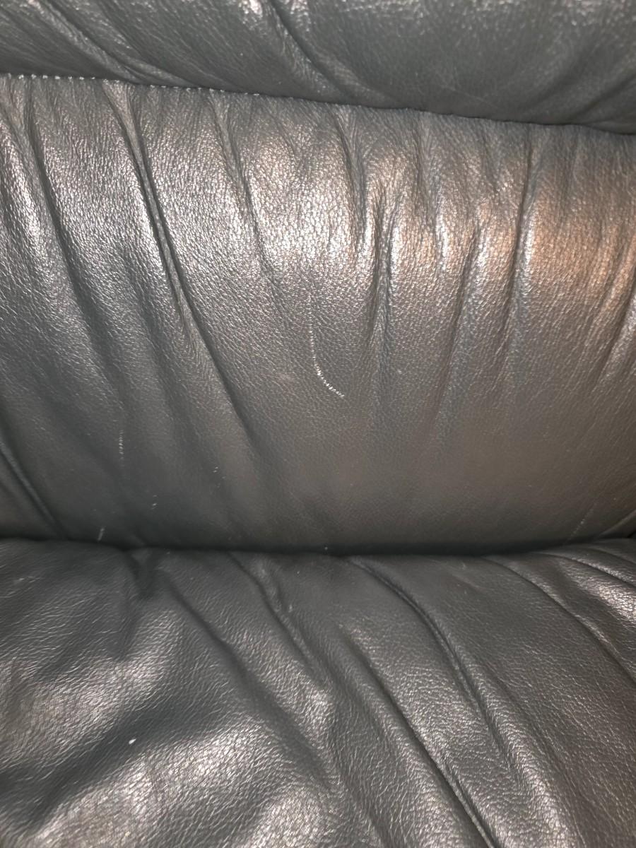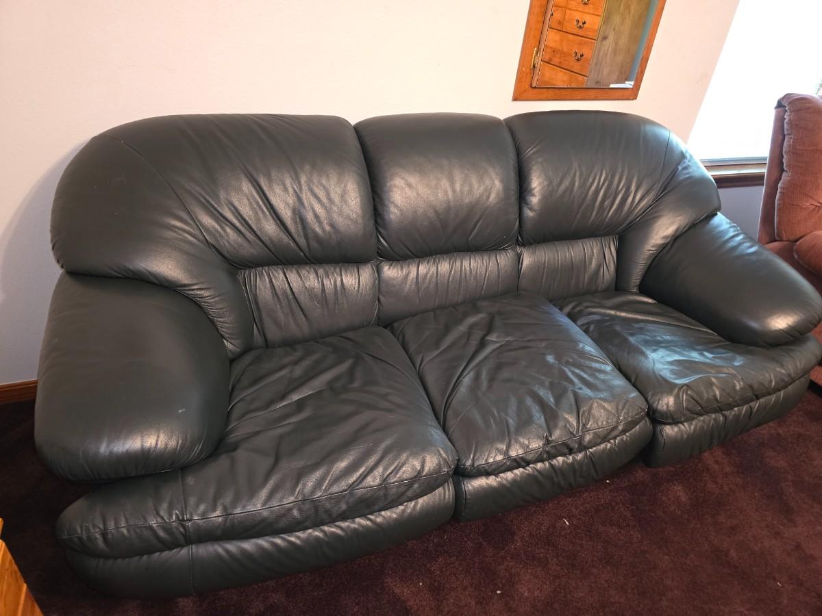 Couple scuffs. Overall great shape and comfortable. 7 feet wide. Back to floor is 38 inches. 40 inches deep.