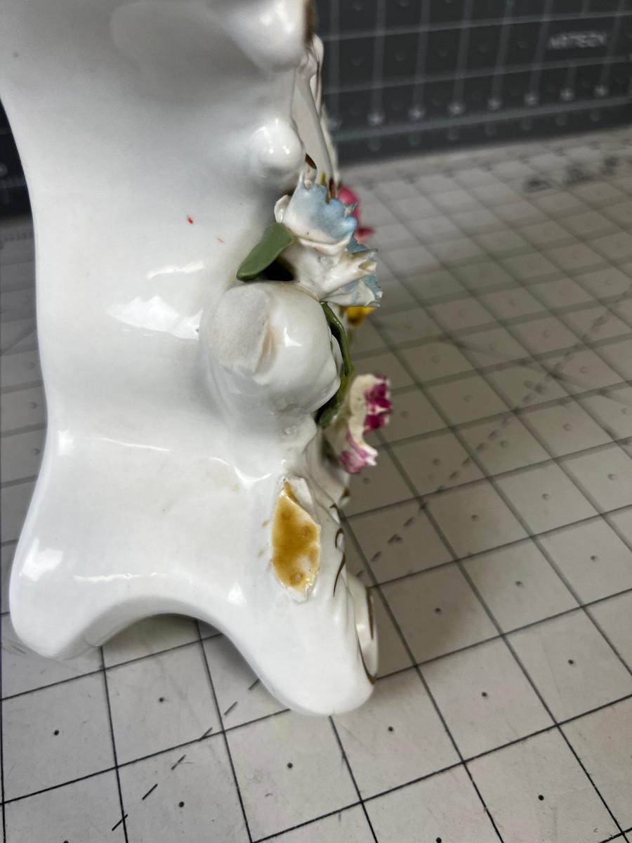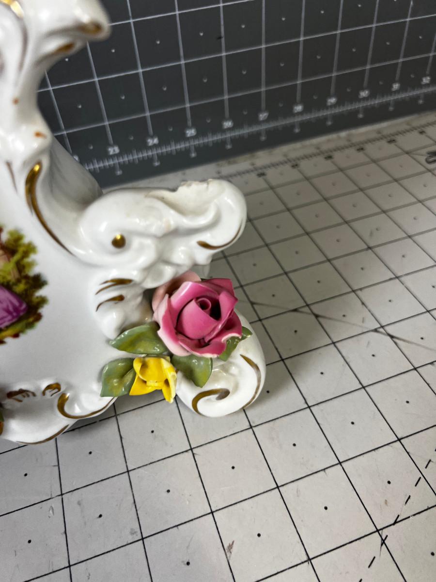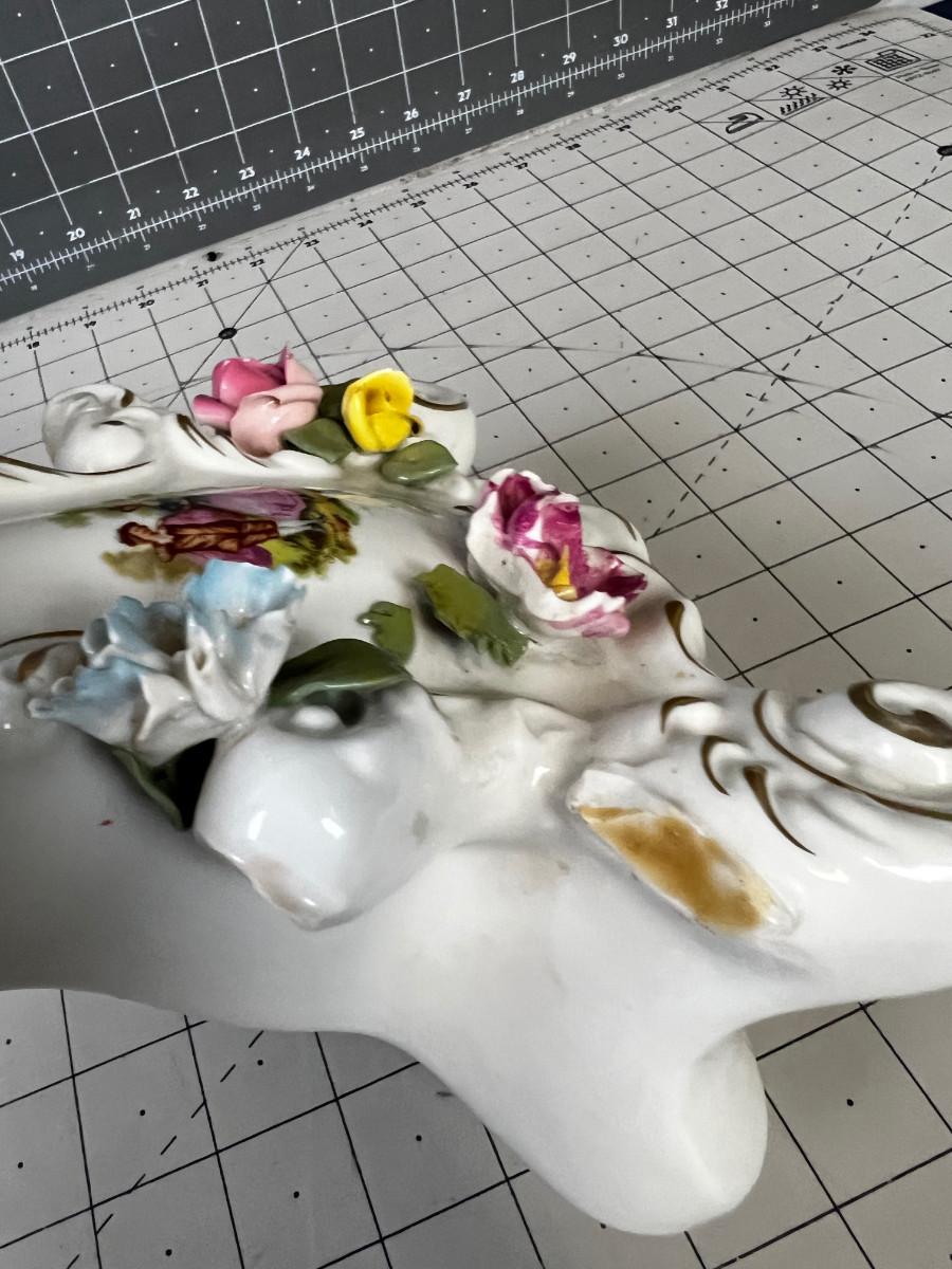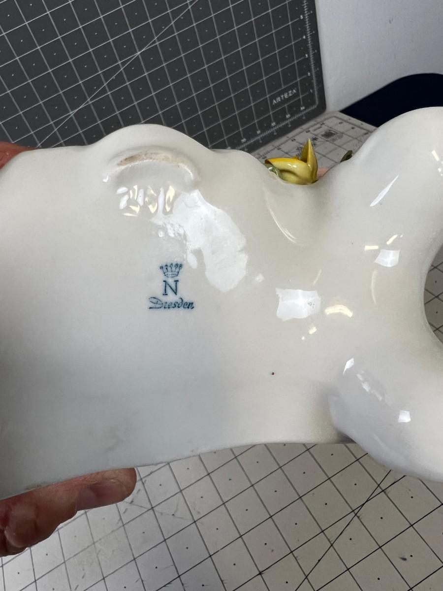 Extensive Damage to the Flowers. Marked Dresden . Not tested. Antique. NO SHIPPING IT BROKEN AND WILL BREAK MORE IF SHIPPED>