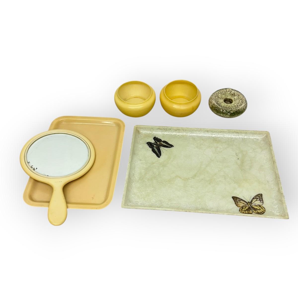 Vintage Dressing Table Lot 6 Items: 2 Trays (one w/ Butterflies) , Mirror, 2 Bowls, and a Candleholder