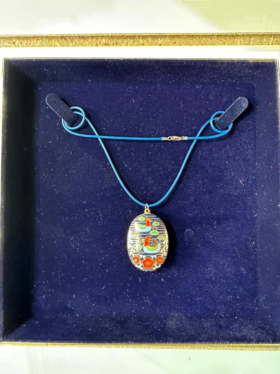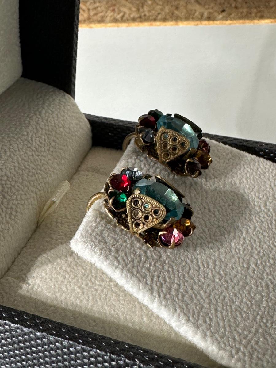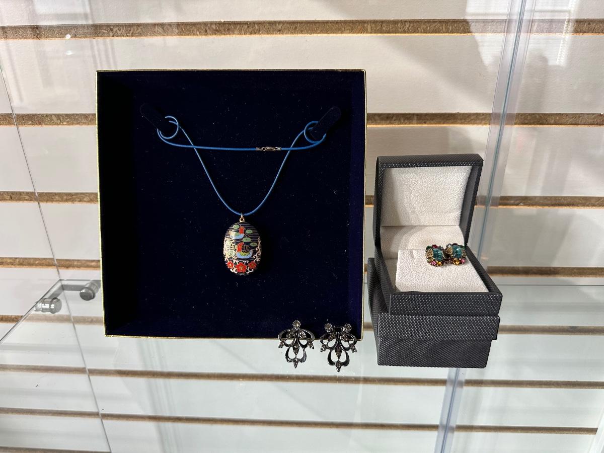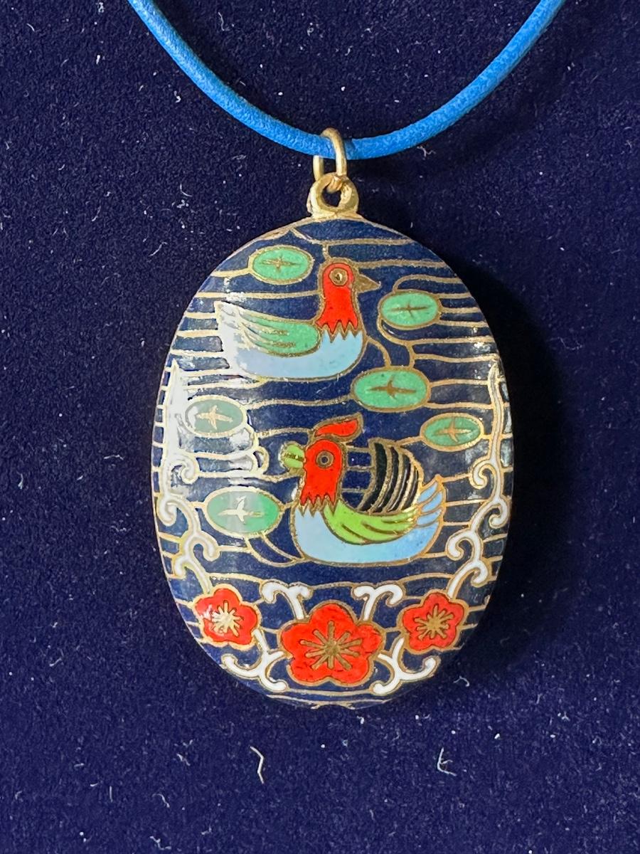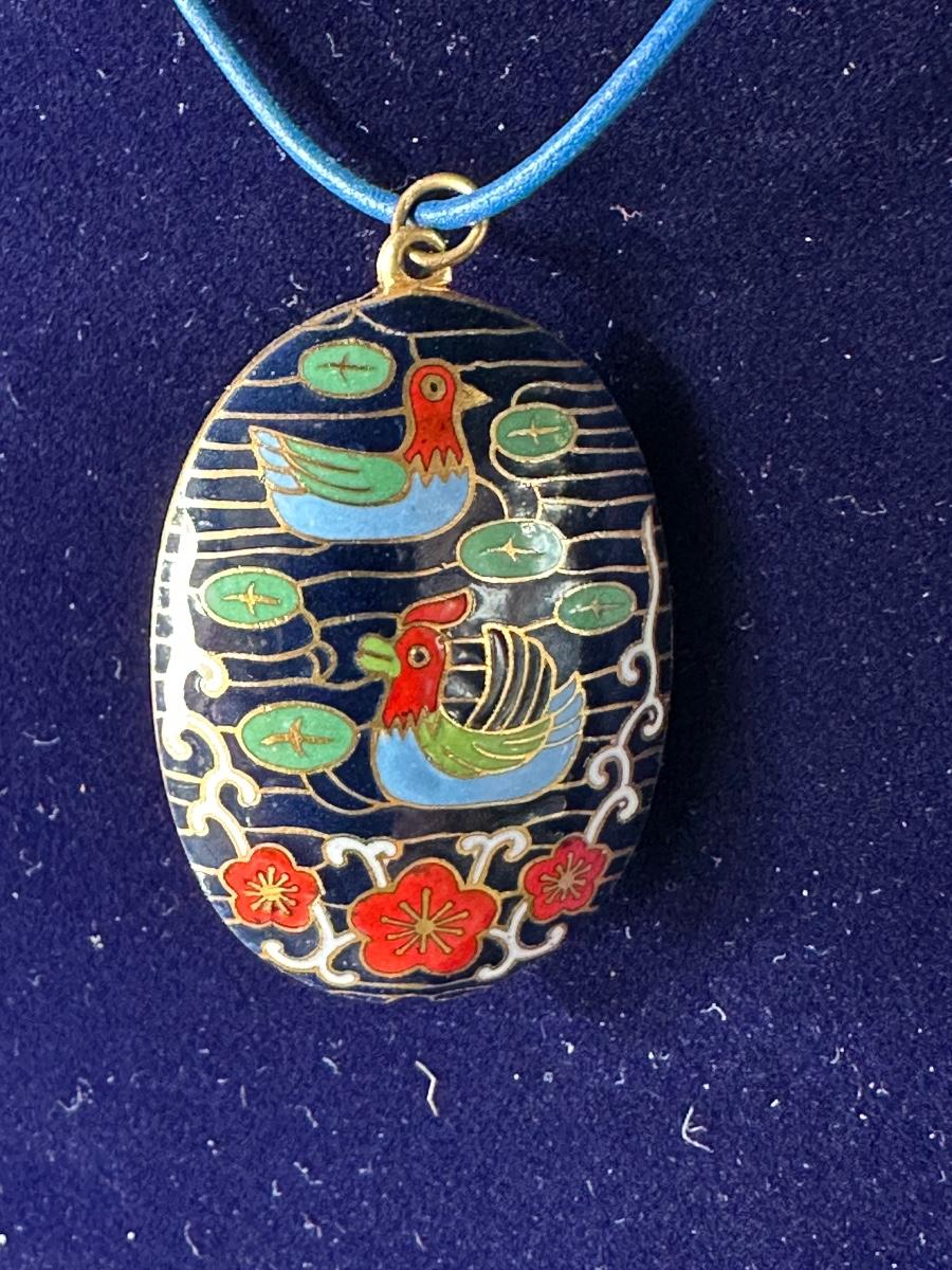 VINTAGE DUCKS PUFFY OVAL CLOISONNÉ ENAMEL NECKLACE, RETRO ELEGANT RHINESTONE SWEATER CLIPS AND VINTAGE MULTICOLORED GOLD TONE PRONG EARRINGS