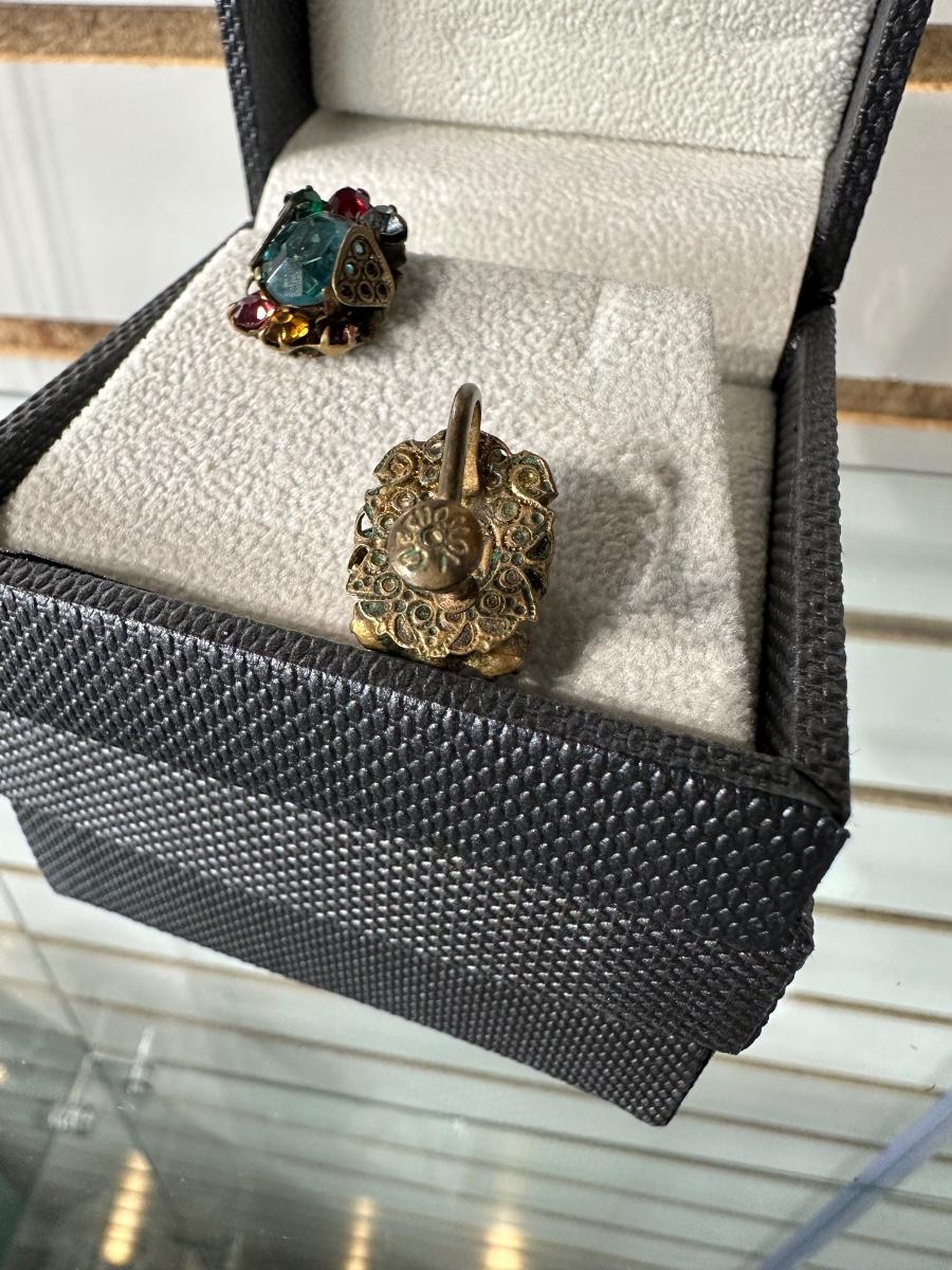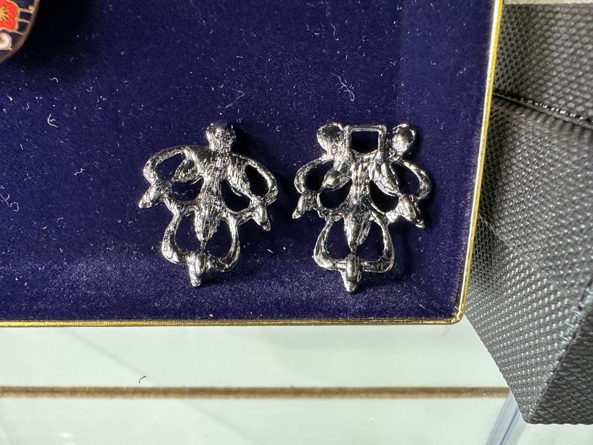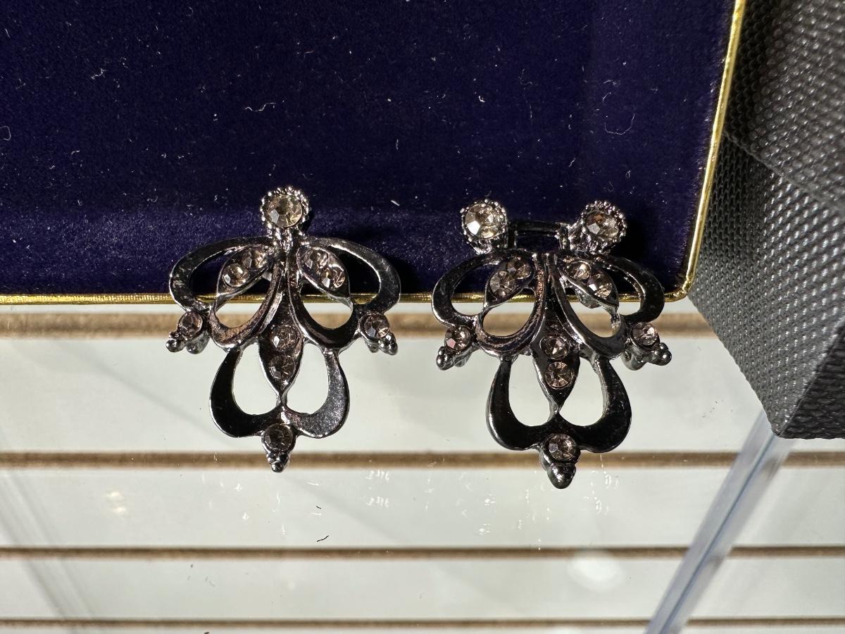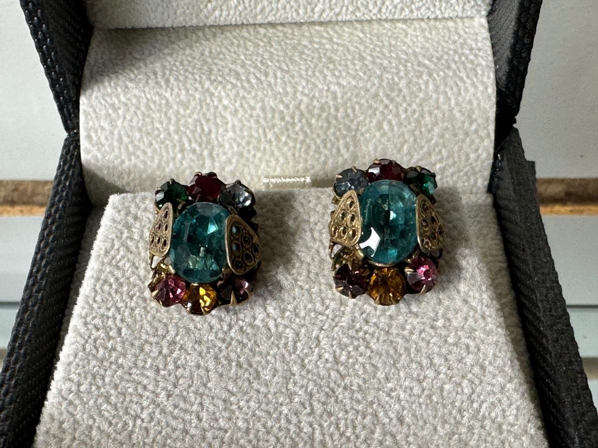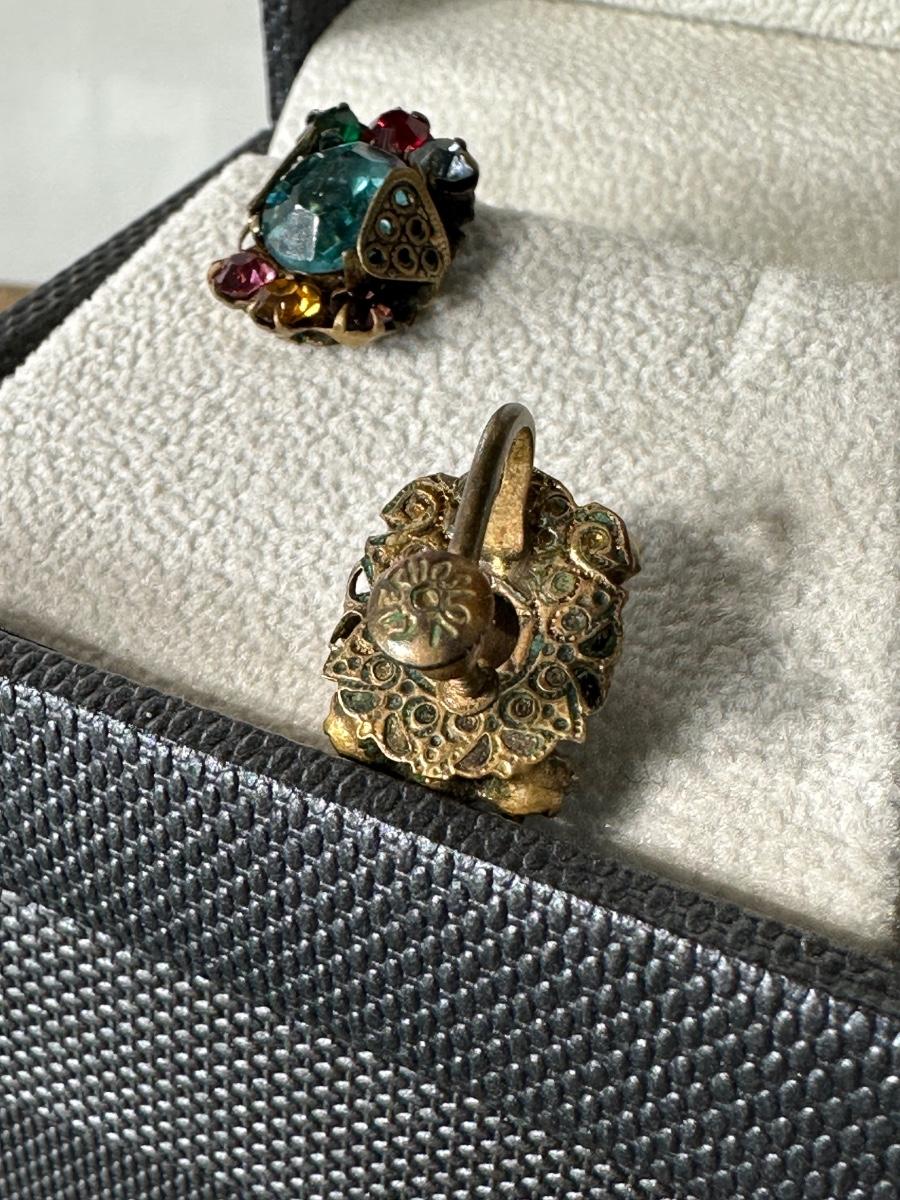 VINTAGE DUCKS PUFFY OVAL CLOISONNÉ ENAMEL NECKLACE, RETRO ELEGANT RHINESTONE SWEATER CLIPS AND VINTAGE MULTICOLORED GOLD TONE PRONG EARRINGS