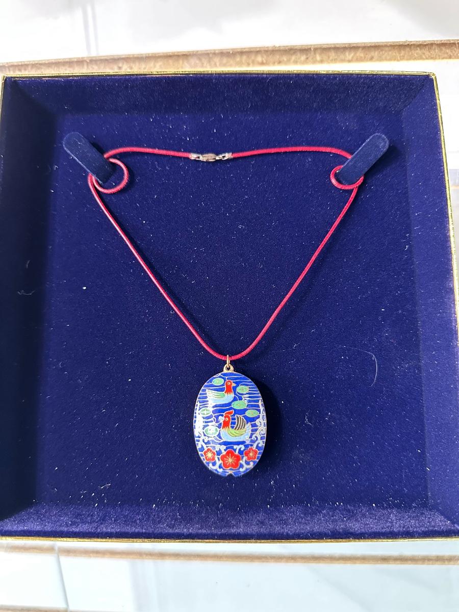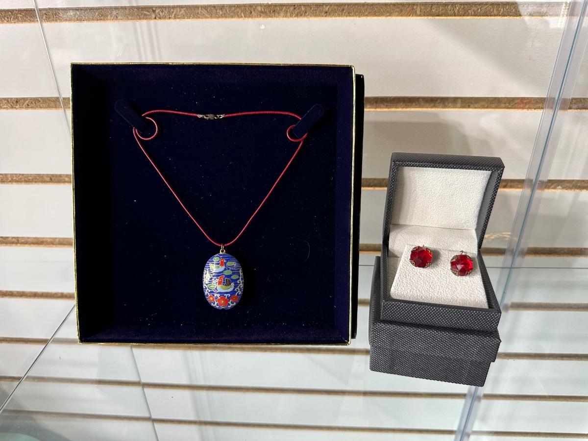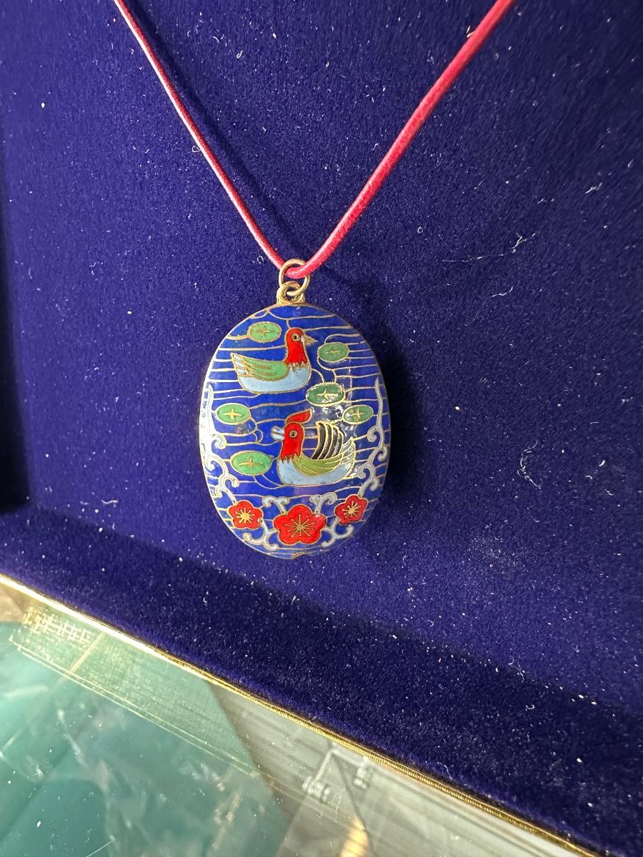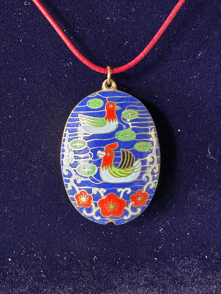 VINTAGE DUCKS PUFFY OVAL CLOISONNÉ ENAMEL NECKLACE AND VINTAGE RED GLASS TWIST SCREW ON EARRINGS