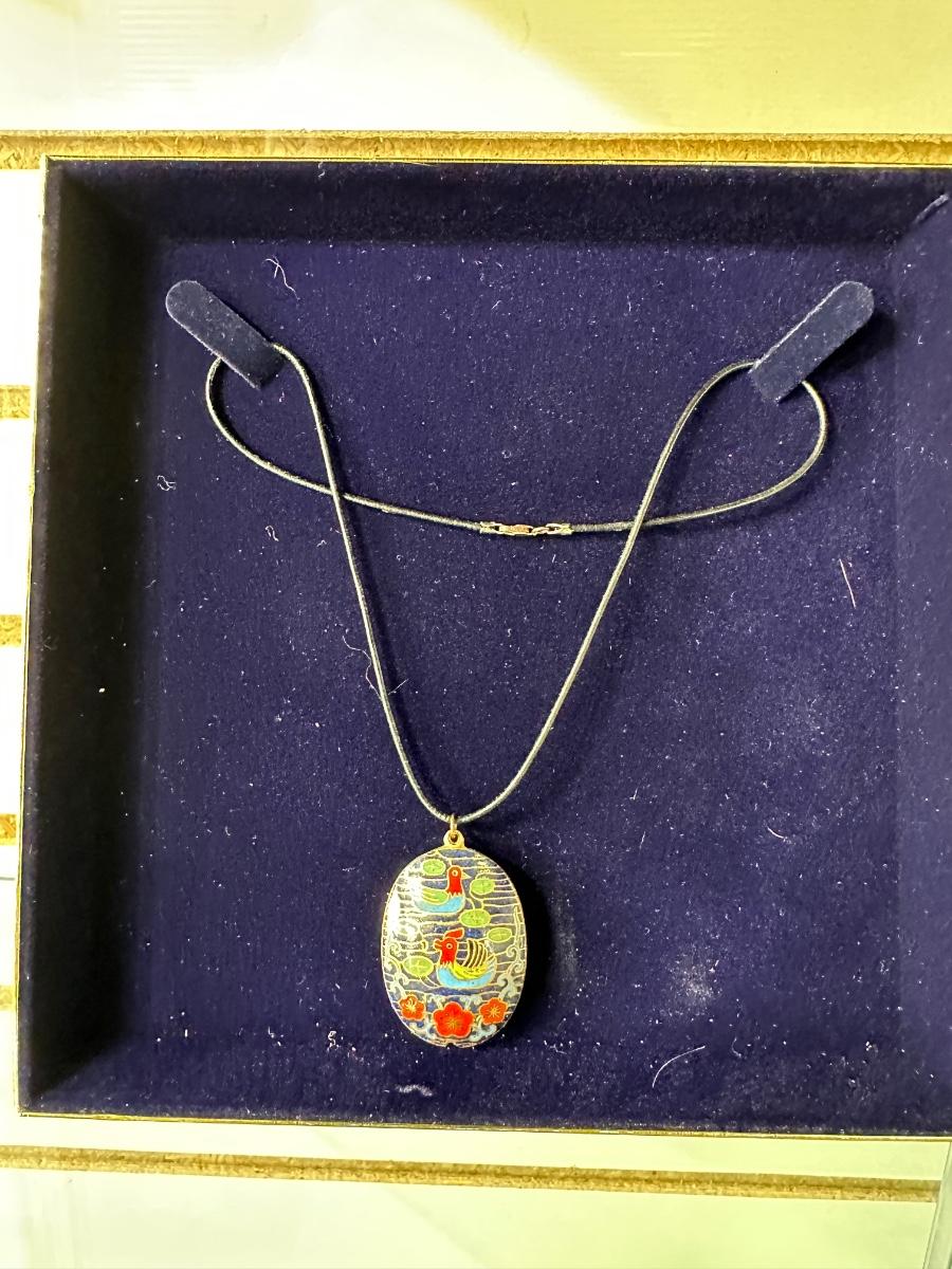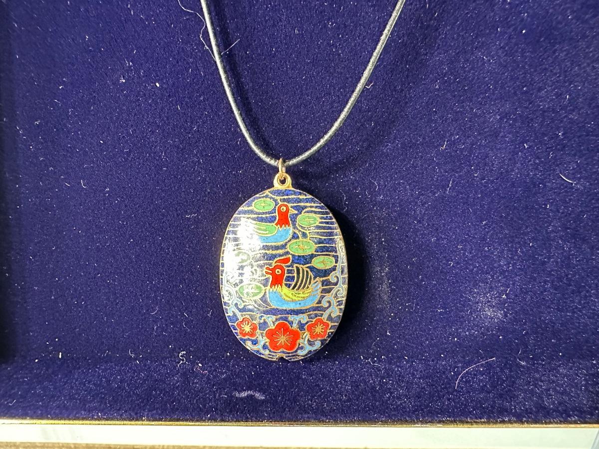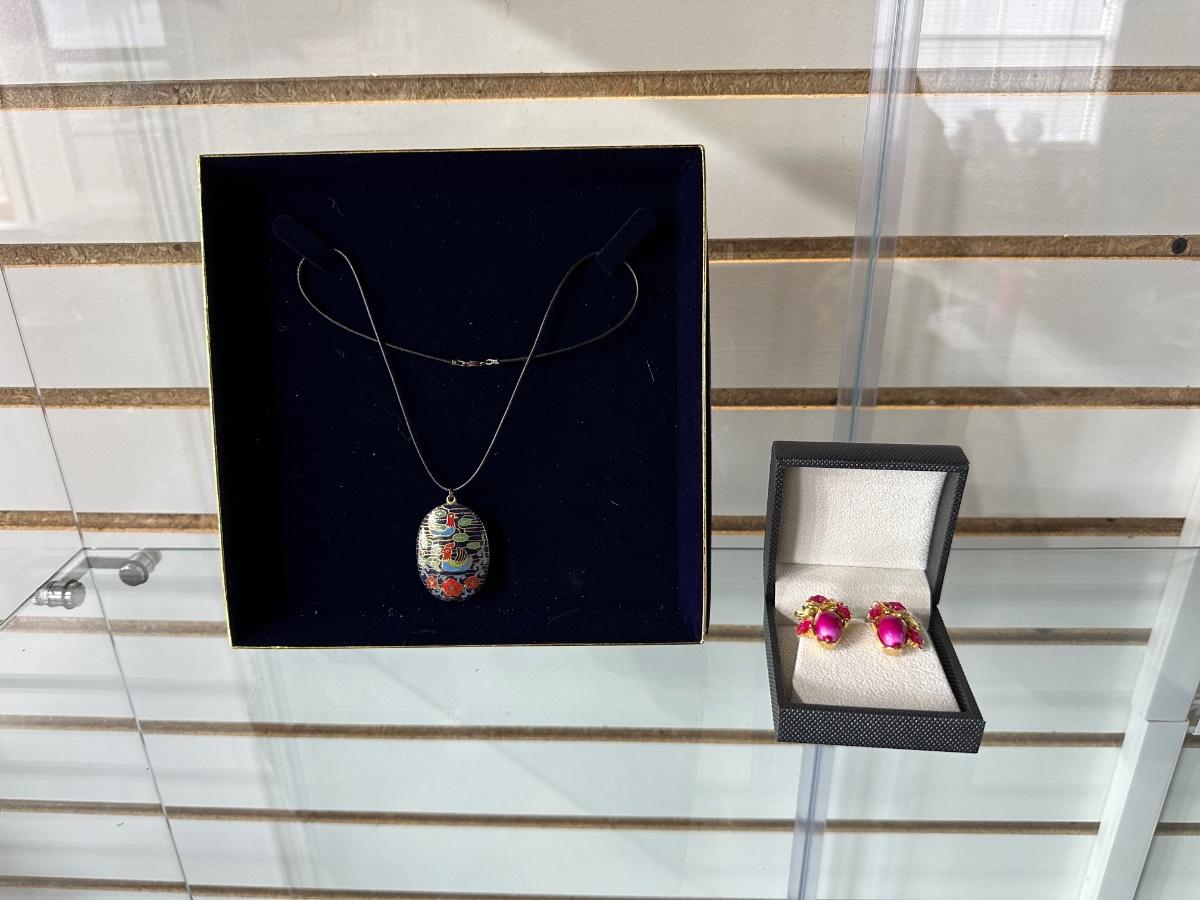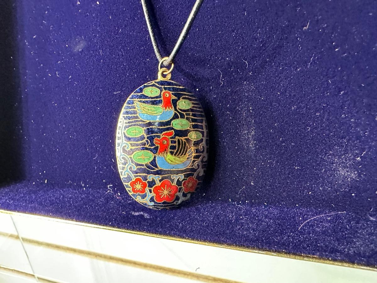 VINTAGE DUCKS PUFFY OVAL CLOISONNÉ ENAMEL NECKLACE AND VINTAGE PINK AND GOLD CLIP-ON EARRINGS