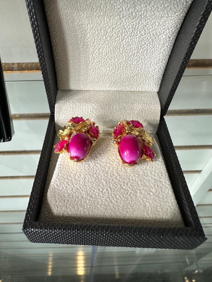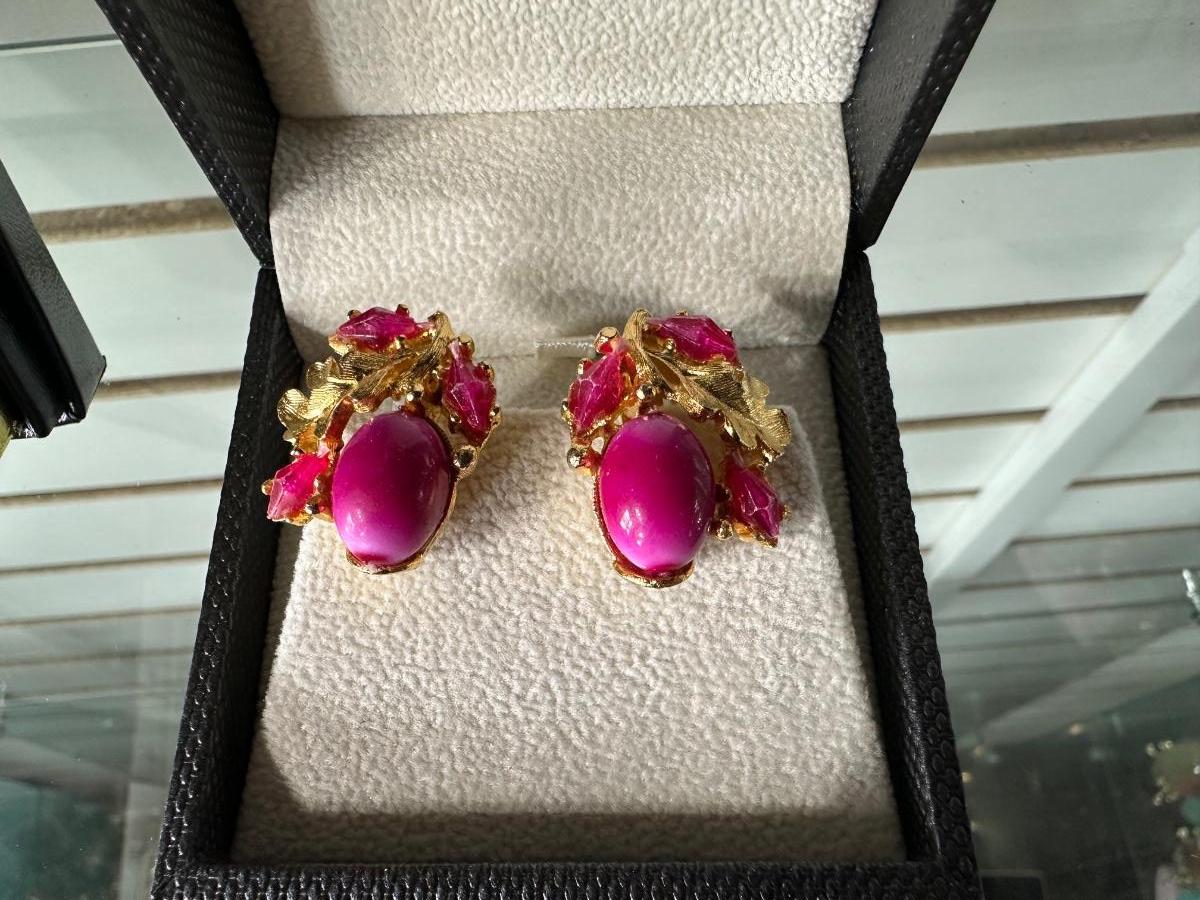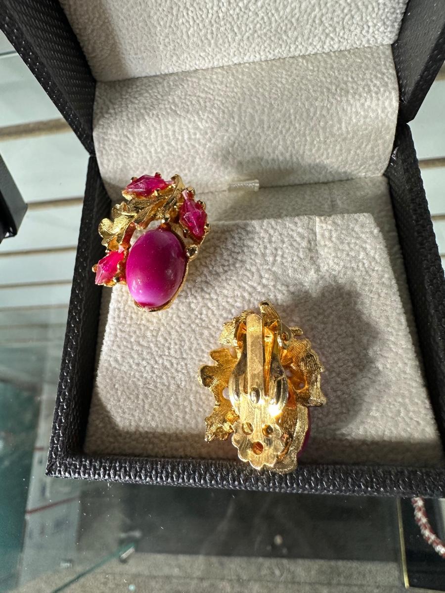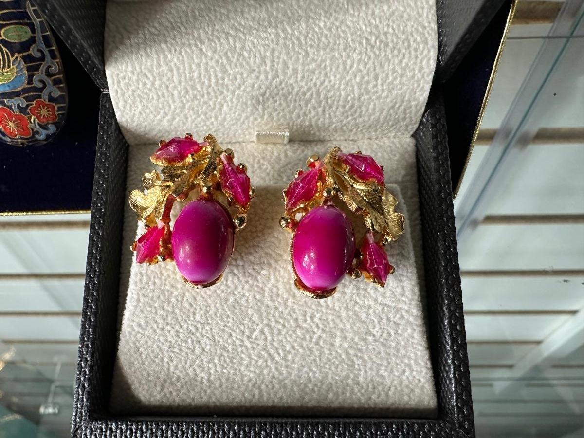VINTAGE DUCKS PUFFY OVAL CLOISONNÉ ENAMEL NECKLACE AND VINTAGE PINK AND GOLD CLIP-ON EARRINGS