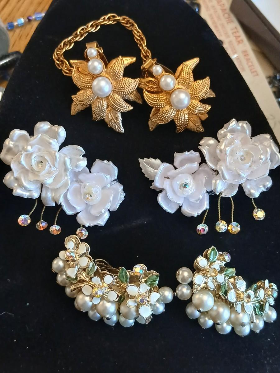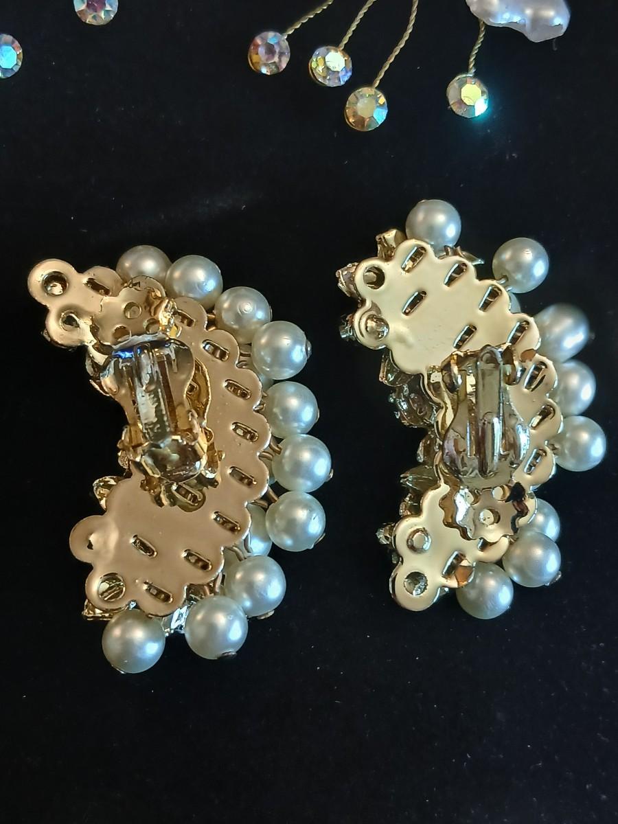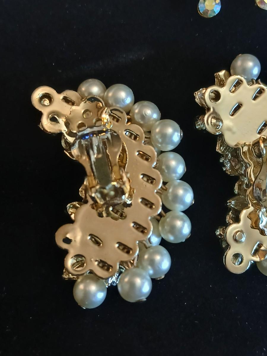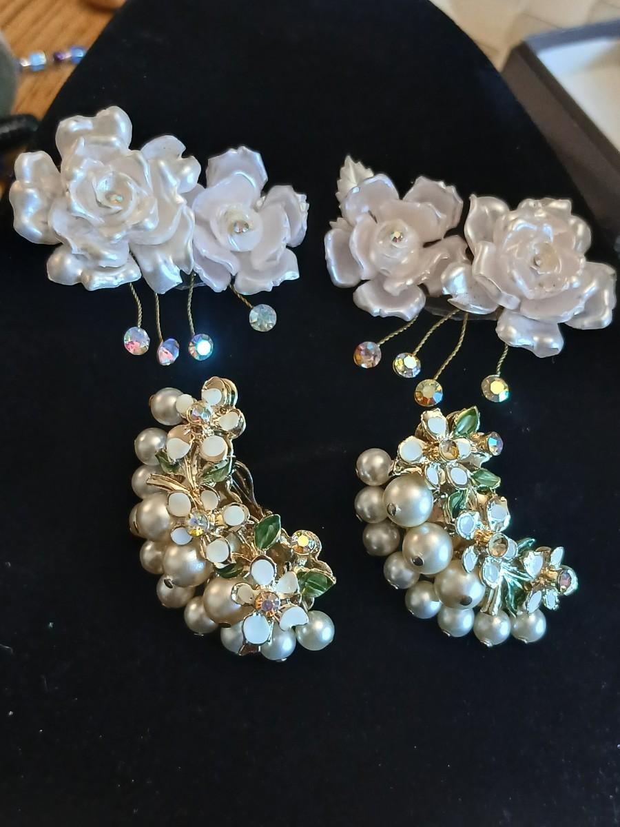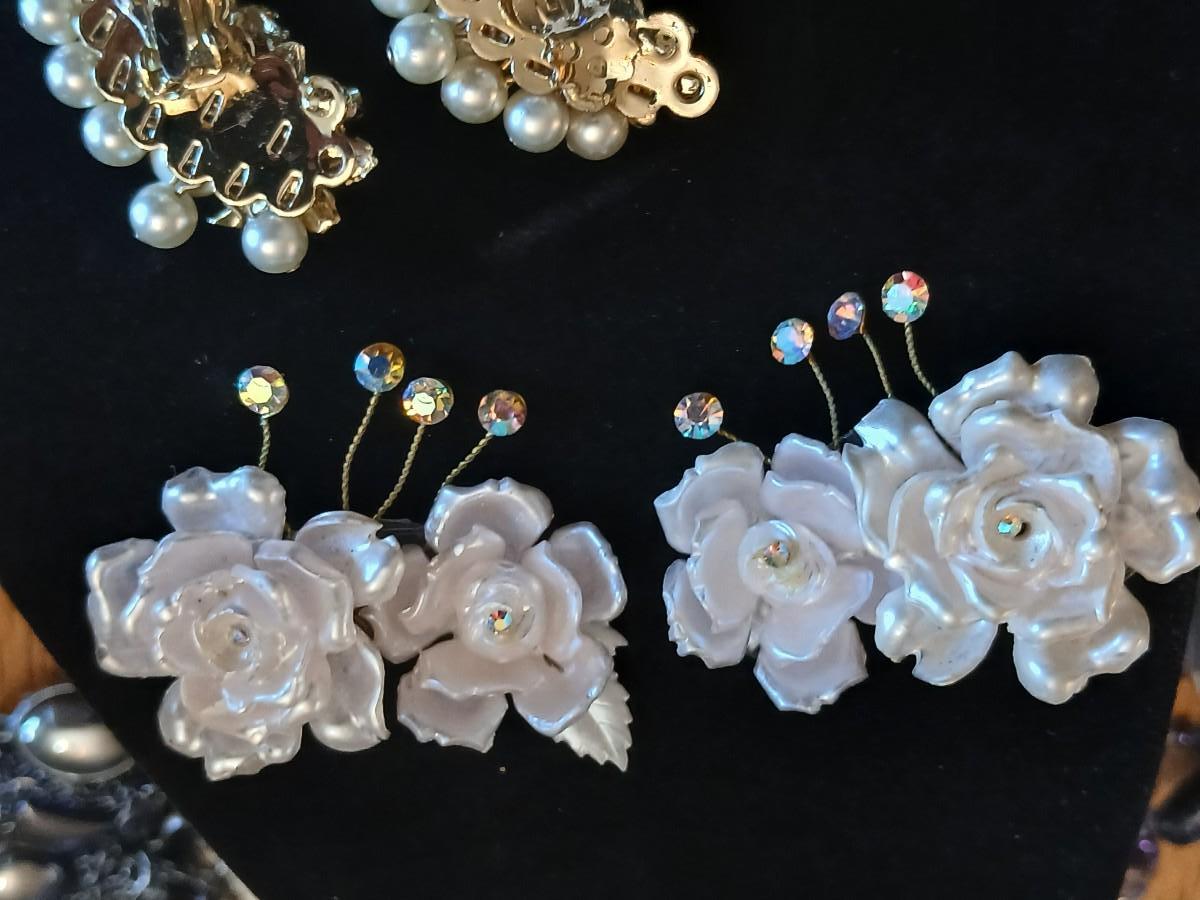 Vintage Floral Clip On Earrings- Acrylic rose with rhinestones -Faux Pearl, Crystal, Enamel and sweater guard clips