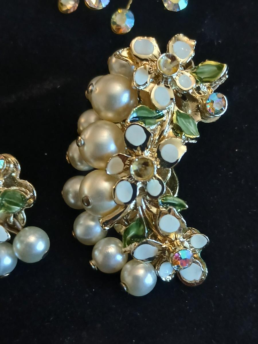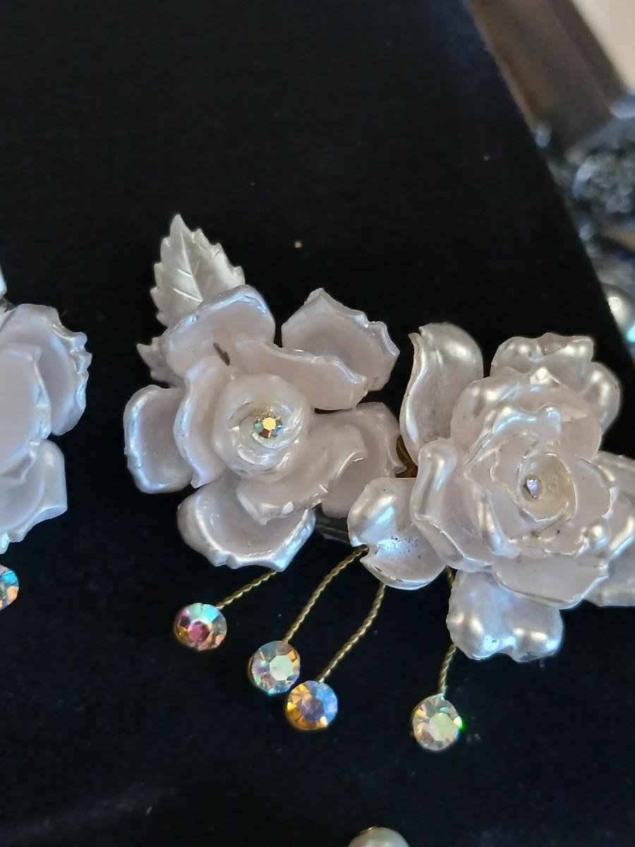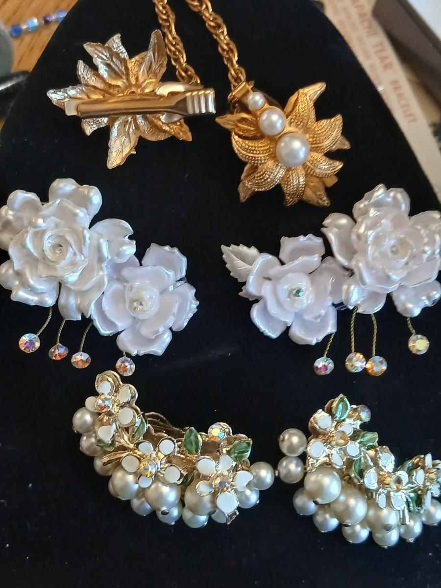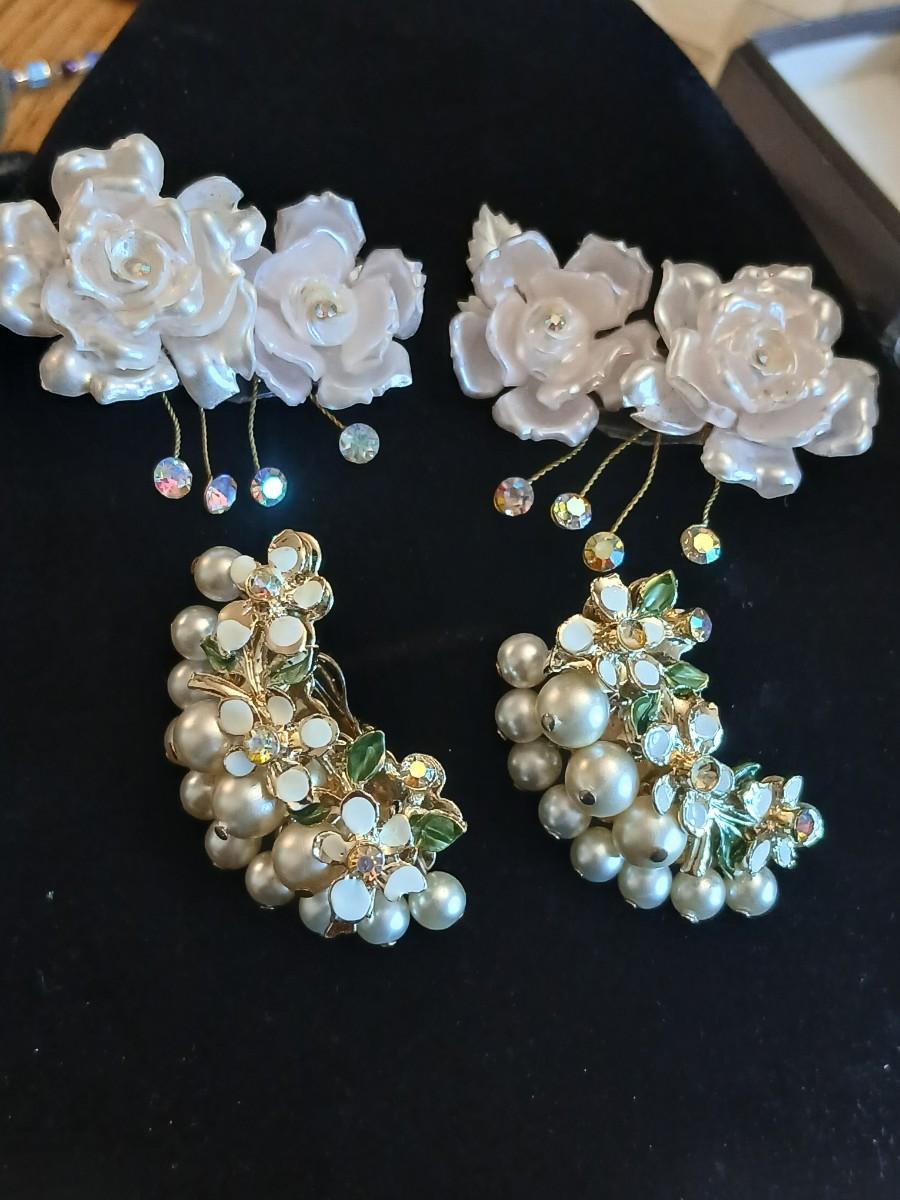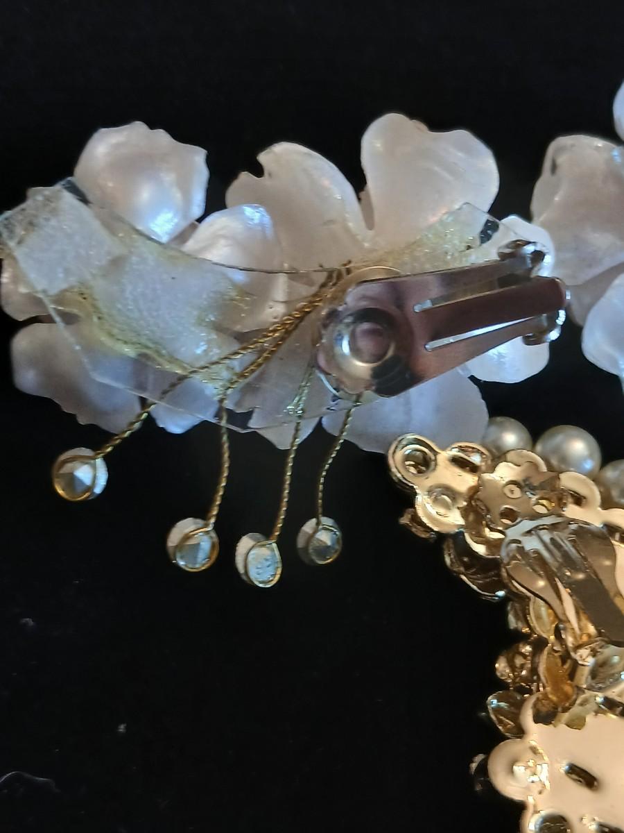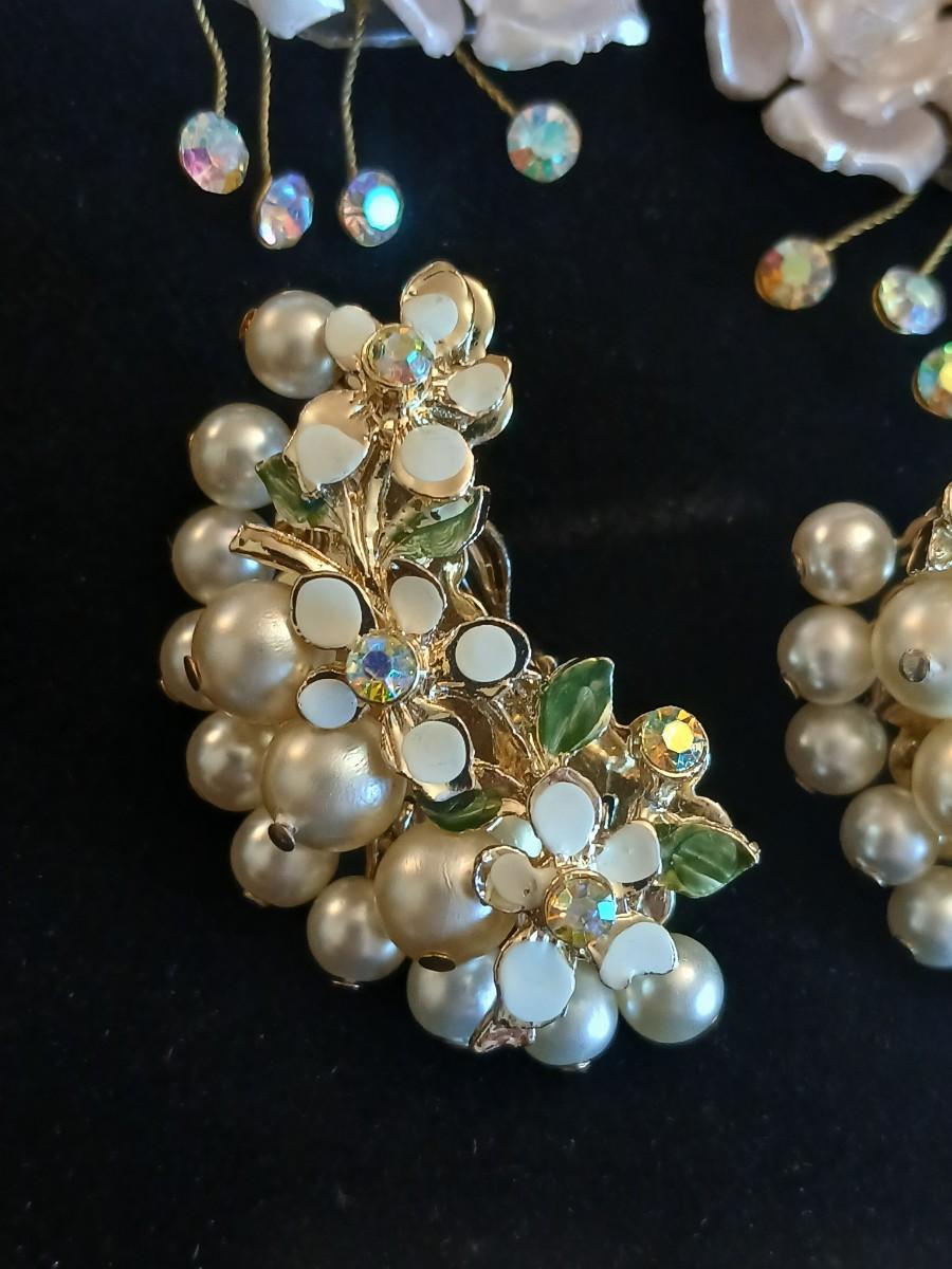 Vintage Floral Clip On Earrings- Acrylic rose with rhinestones -Faux Pearl, Crystal, Enamel and sweater guard clips