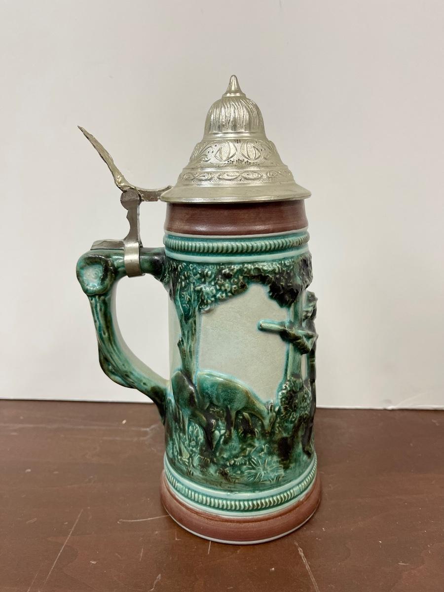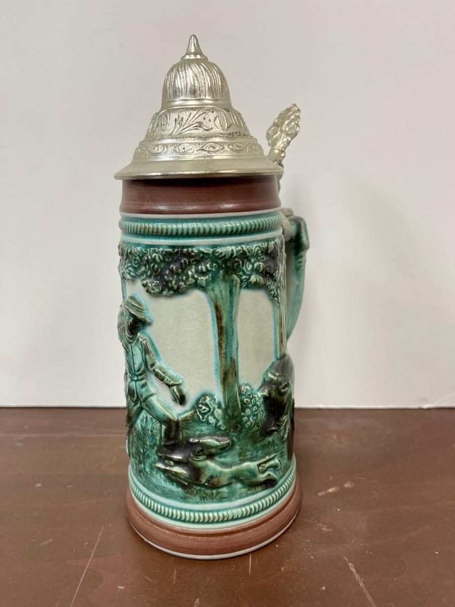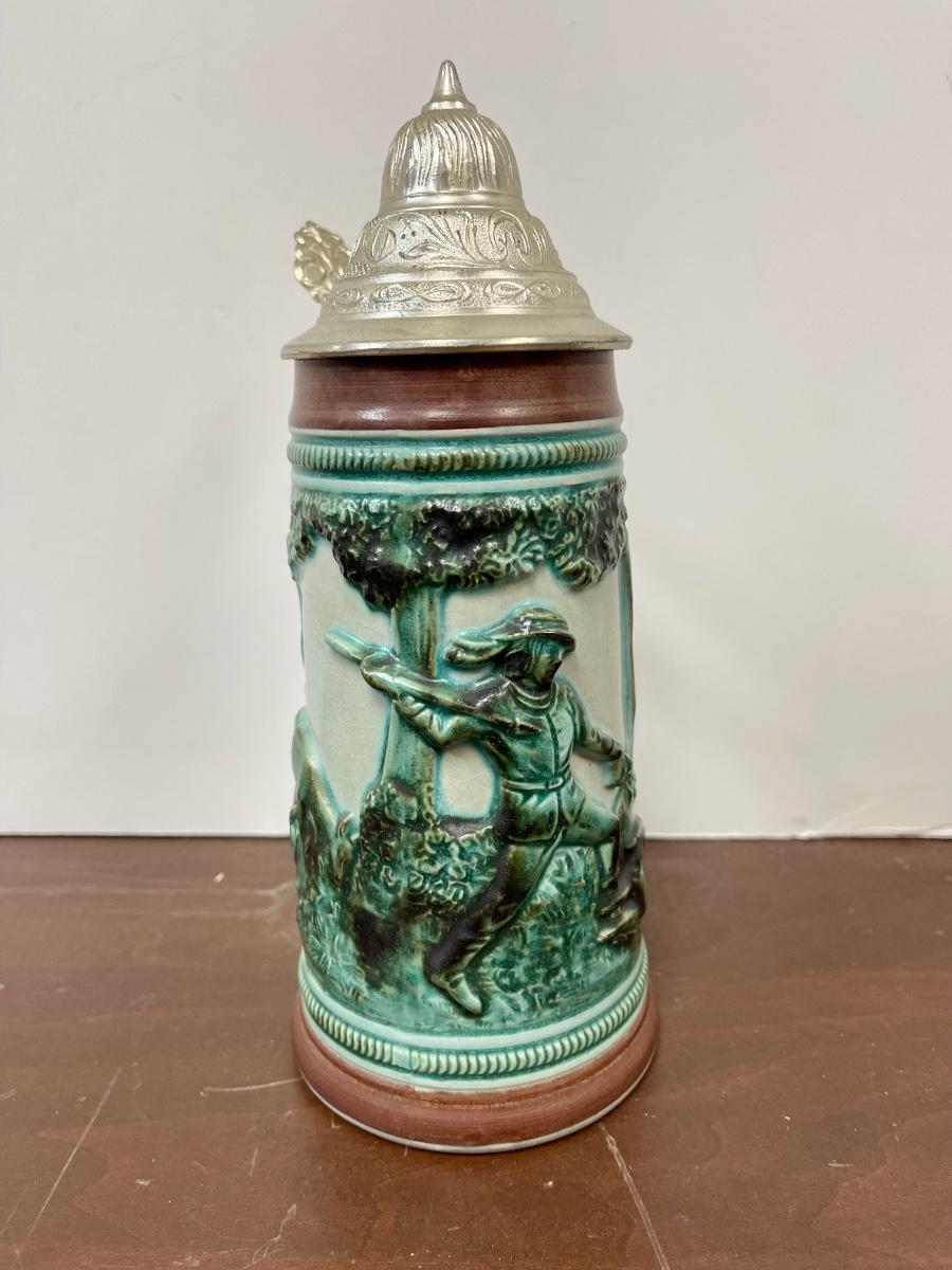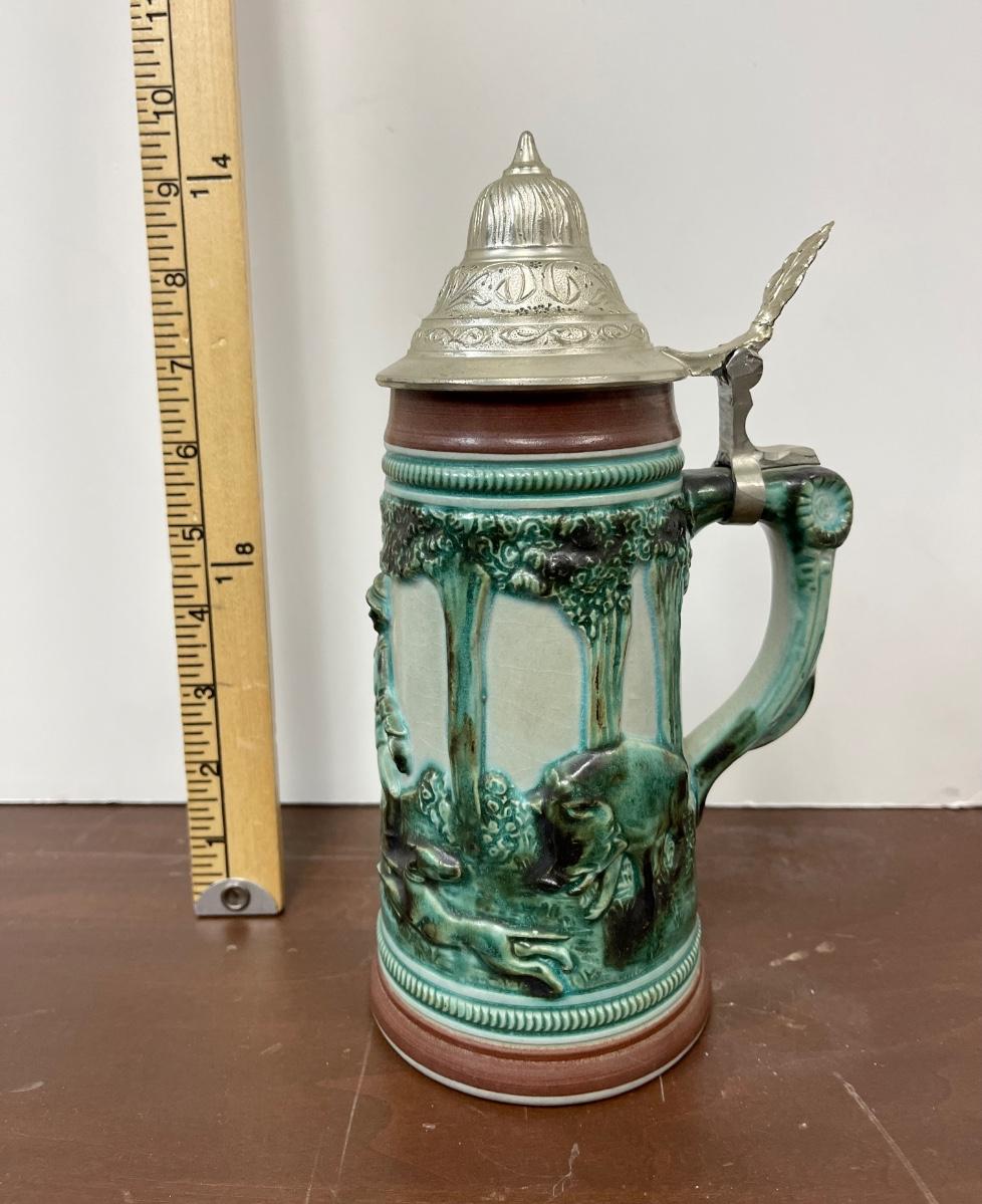 Vintage Lidded German Beer Stein Ceramic with a Faux Green Patina Hunting Scene