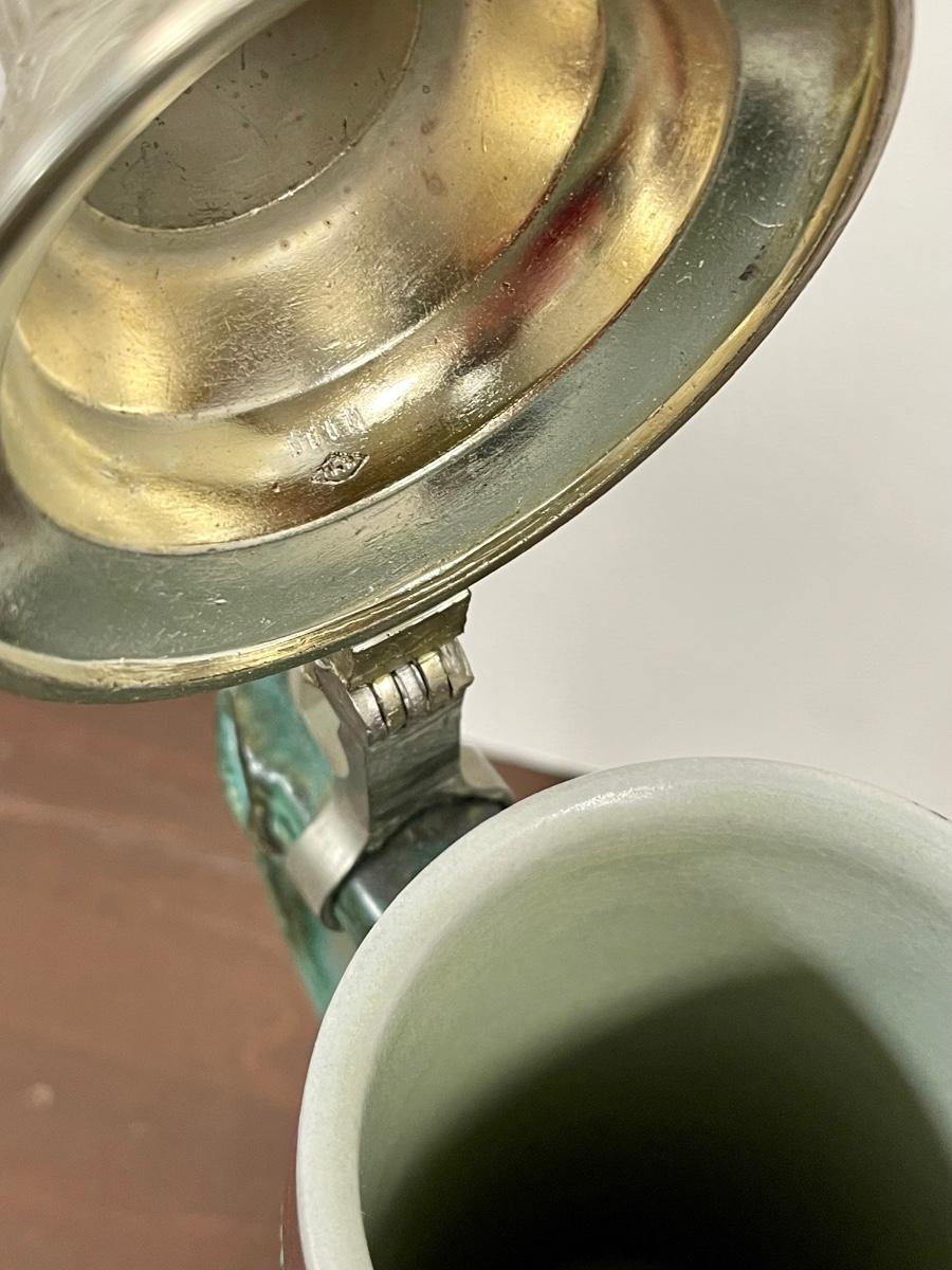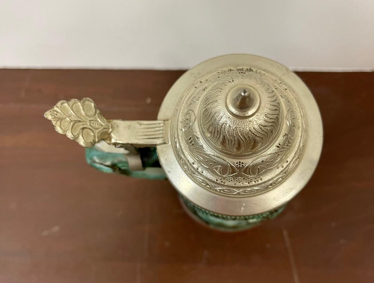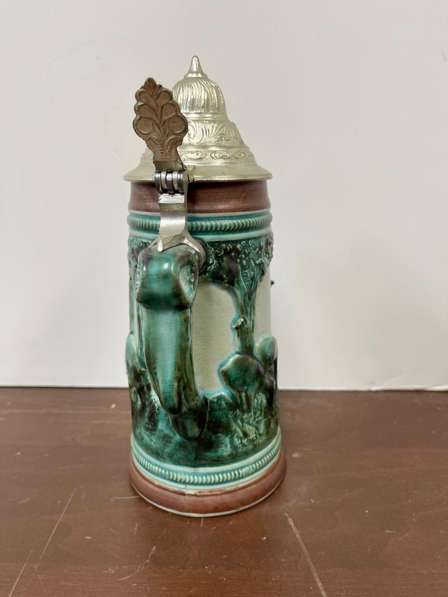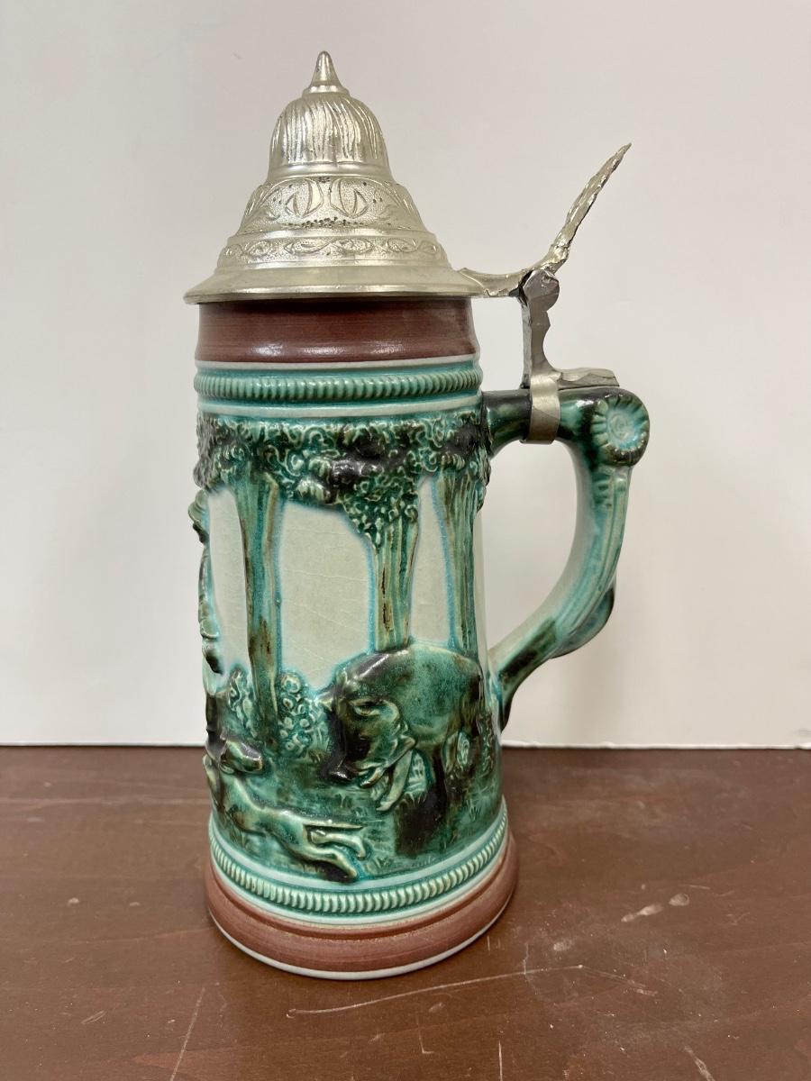 Vintage Lidded German Beer Stein Ceramic with a Faux Green Patina Hunting Scene