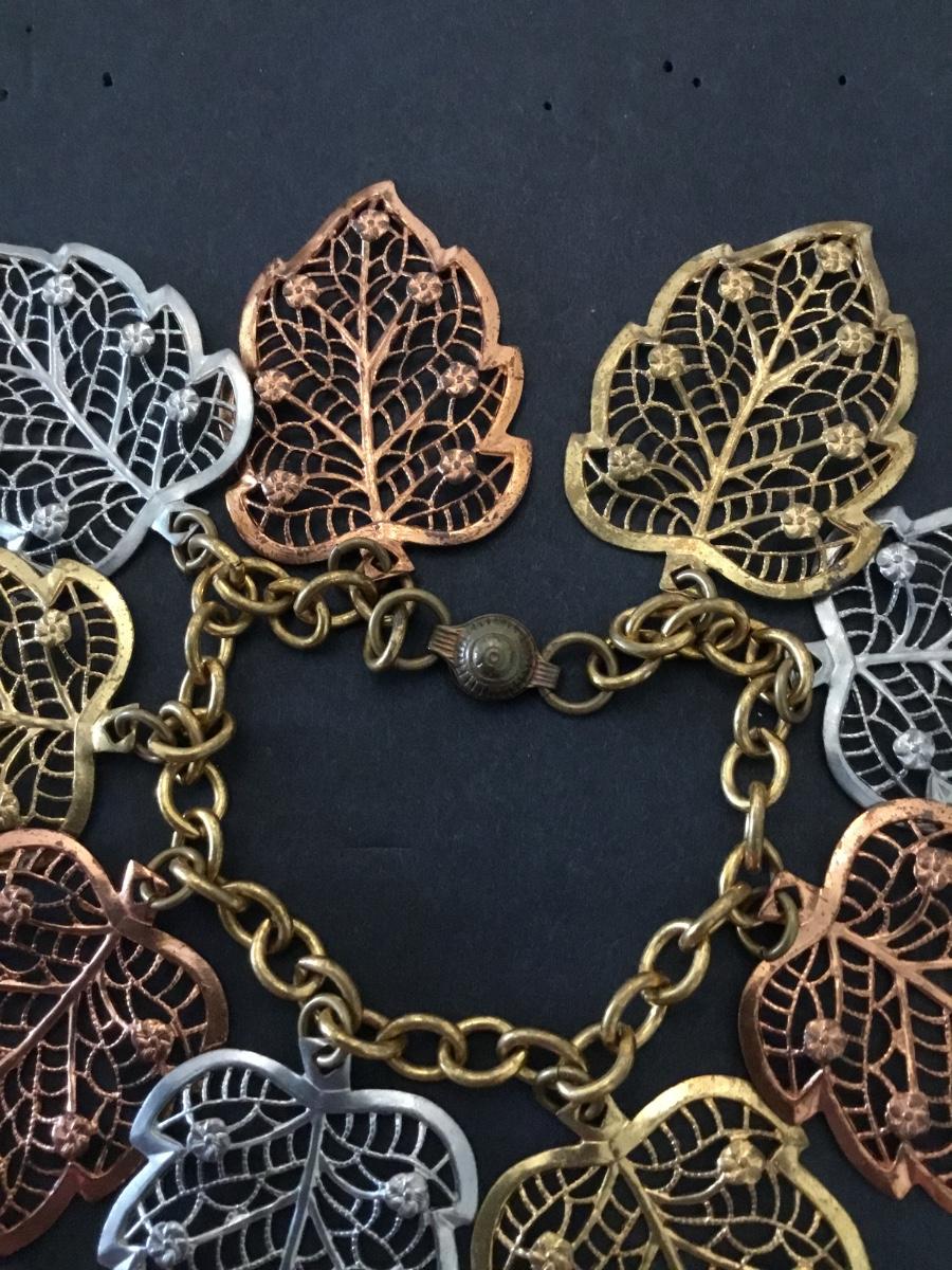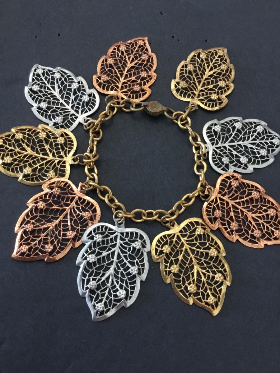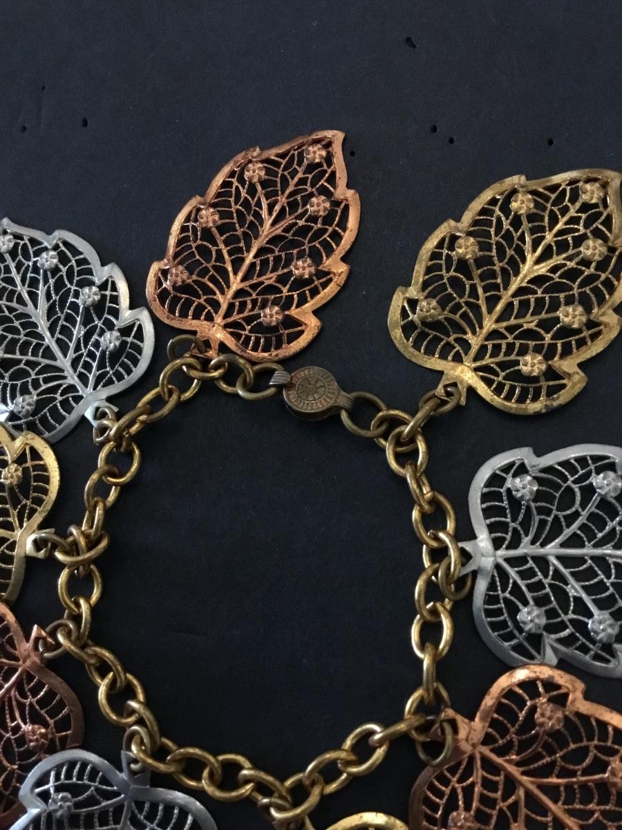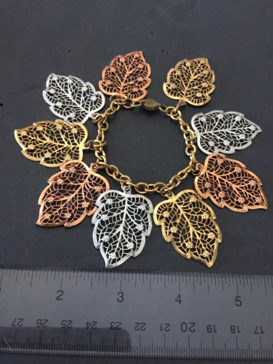 Vintage, gold, silver copper, toned leaf charm bracelet