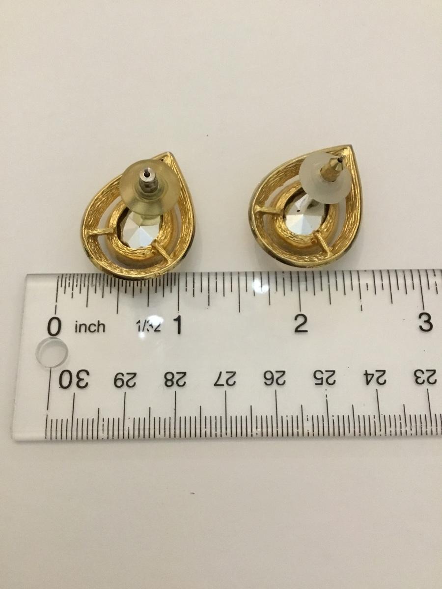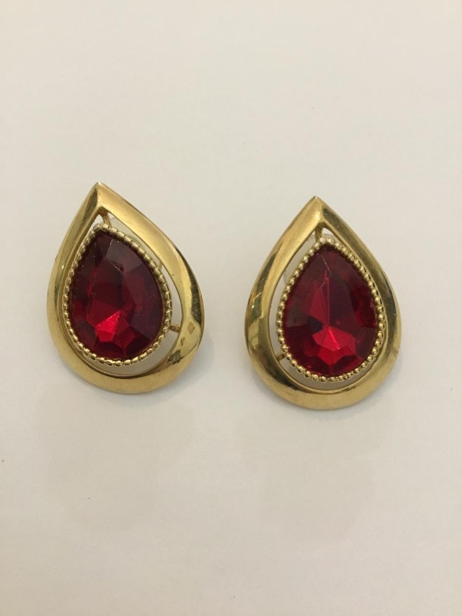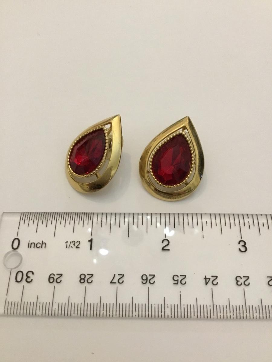 Vintage gold tone , teardrop, red ruby, rhinestone statement earrings