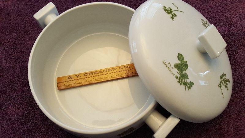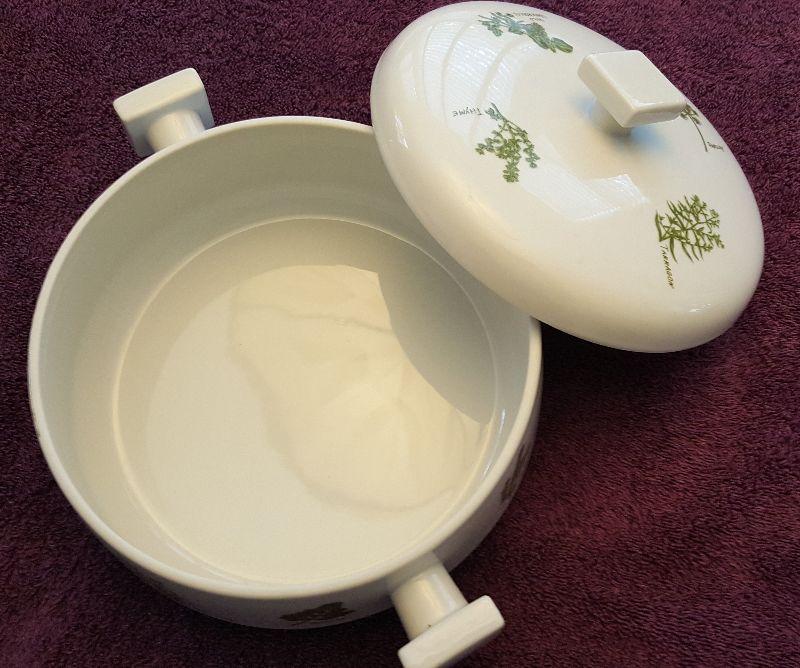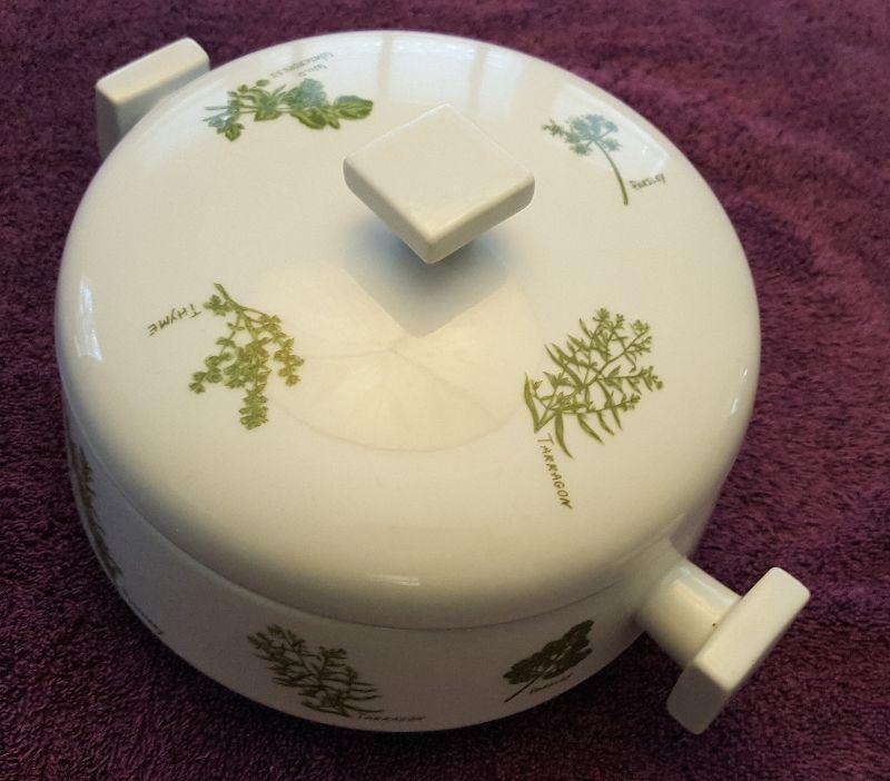 This lot is for a Vintage Herb-Decor Covered Casserole Dish. Herby plain and simply elegant. Just right for your next church or club potluck. Can't you just see your favorite Cheesy Barley & Dill Pilaf sitting on that banquet table. This covered dish bowl measures about 8-inches in diameter and 3-inches deep with the handles extending about 1.5-inches more on each side. The bowl is marked Herb Garden Ovenware by Taster Setter, Japan. This fun item was donated by IHA Foundation VP Stephen Lee of Louisville, KY. Don't be a Wish-I-Had, be a Glad-I-Did. Bid Now.