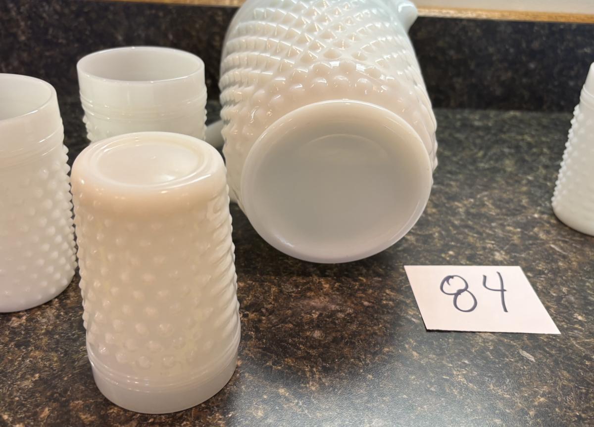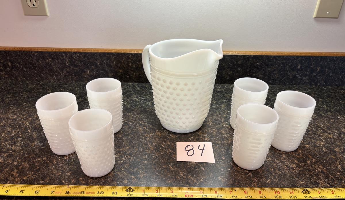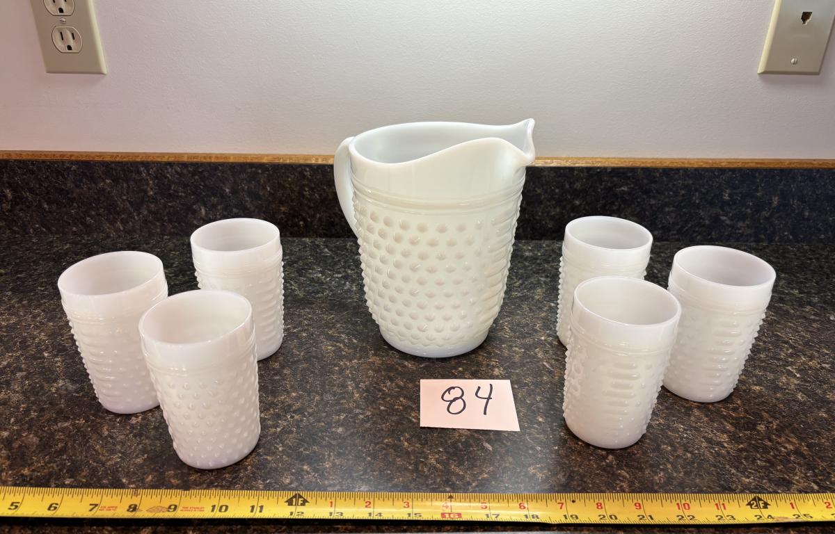 Vintage Hobnail Milk Glass Pitcher and Glass Set